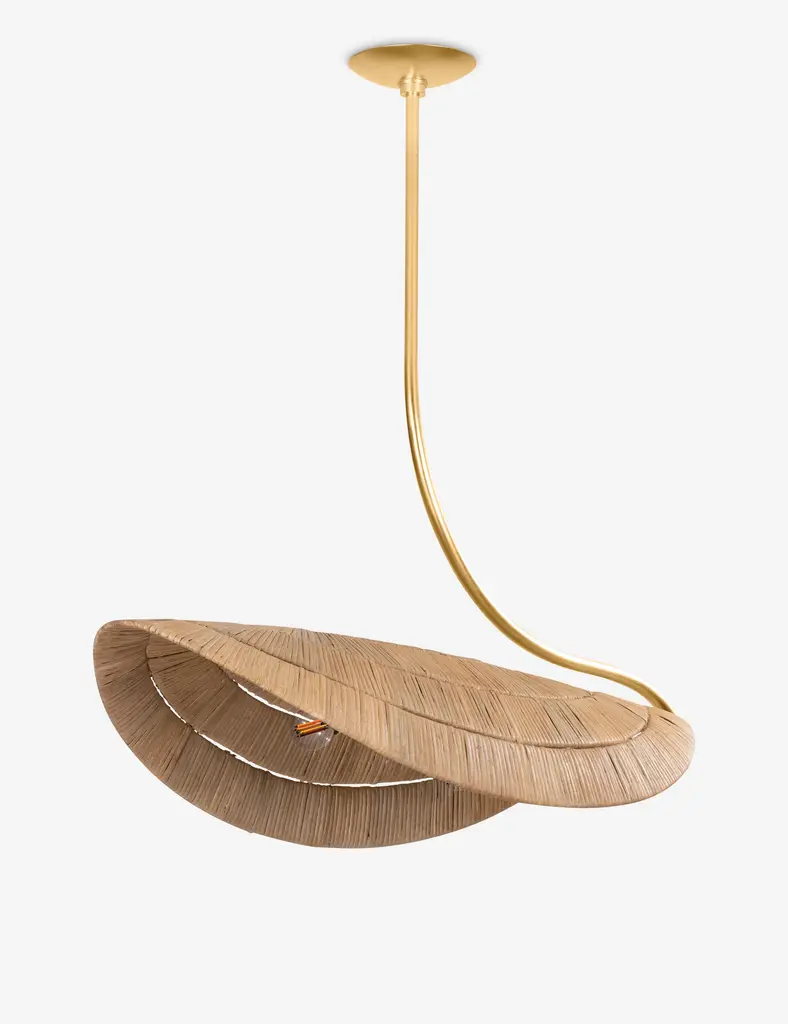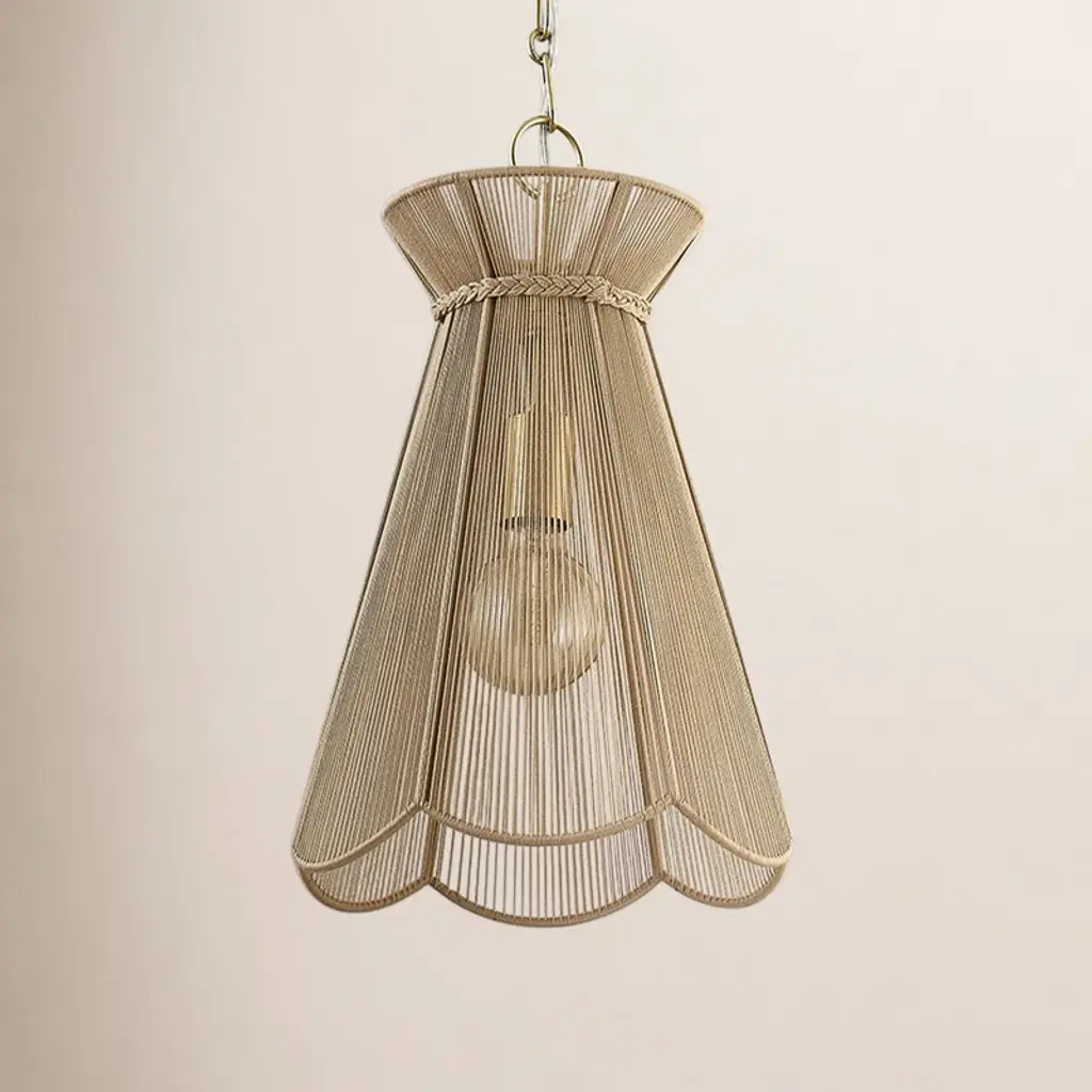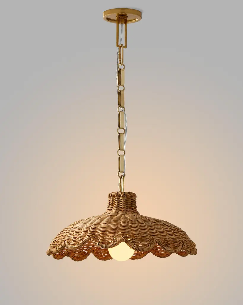 Spun from a classic schoolhouse pendant design, we added a scalloped edge to winsome wicker and suspended it from an antique brass bracelet chain.
