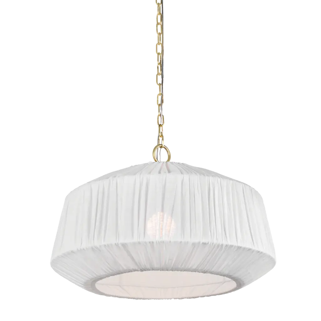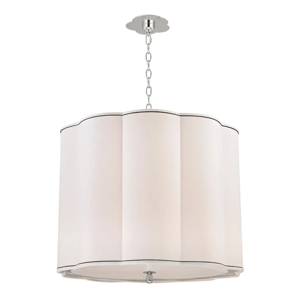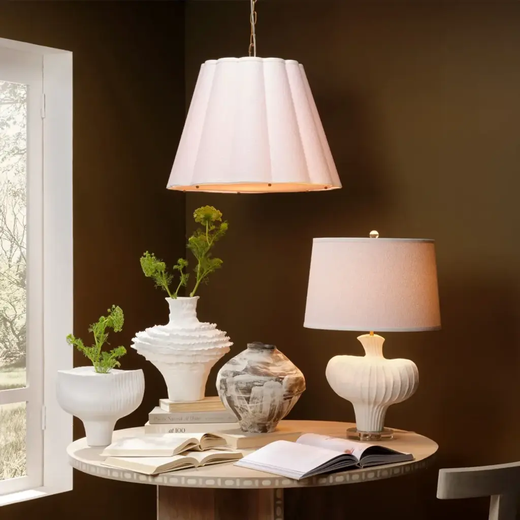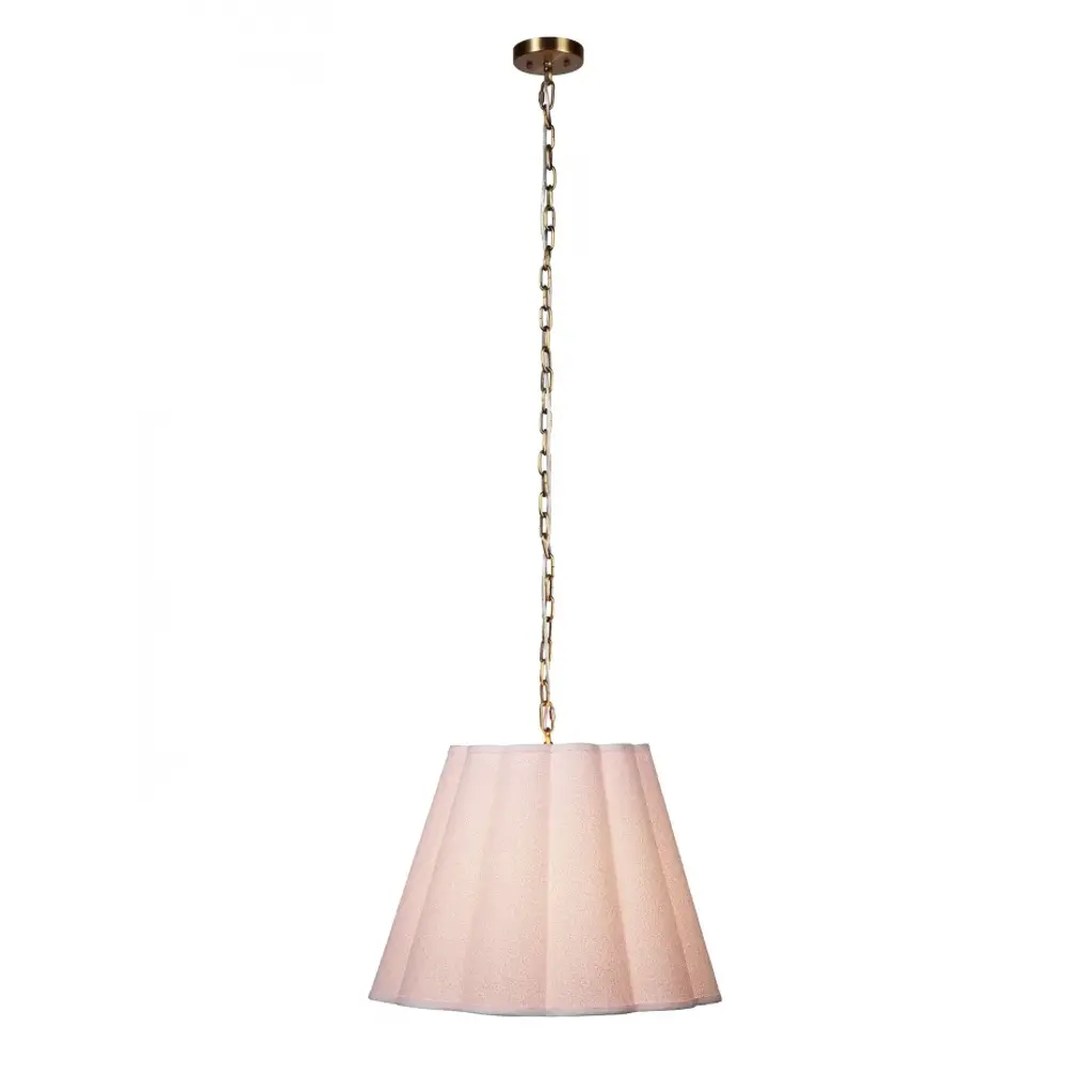 Install these casually elegant and gently scalloped pendants strategically to provide diffused, soft light precisely where you need it. Each features an expertly crafted white linen boucle shade and bottom diffuser to soften and direct the illumination with an adjustable antiqued brass chain.
