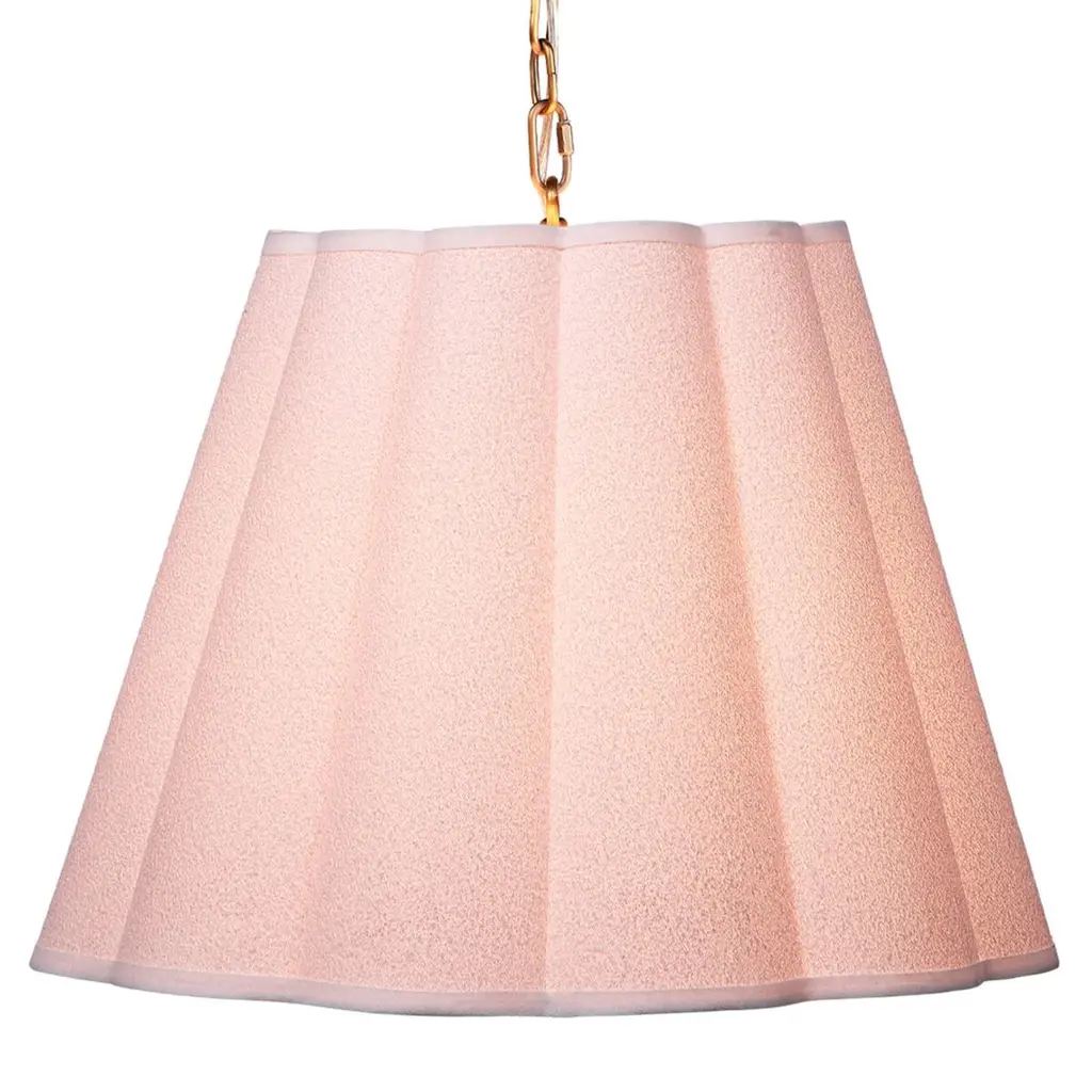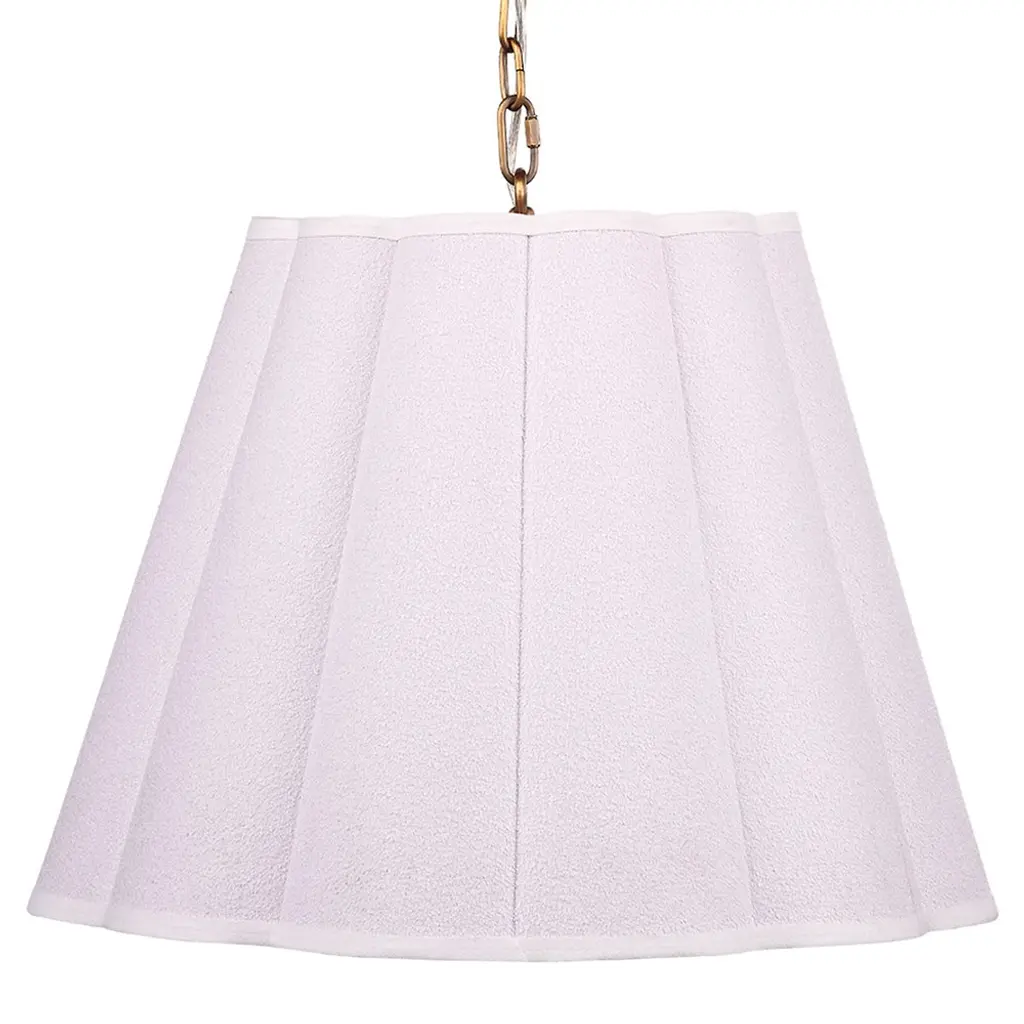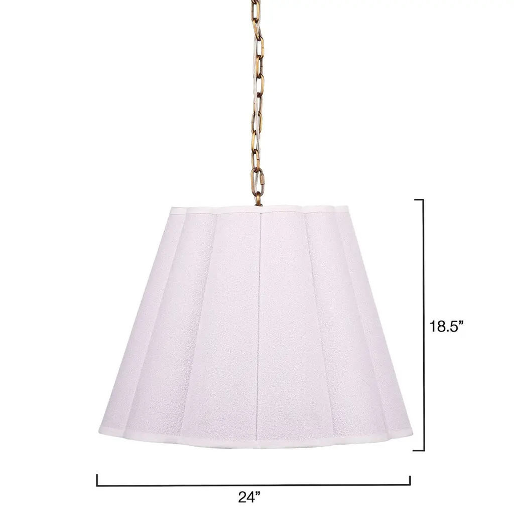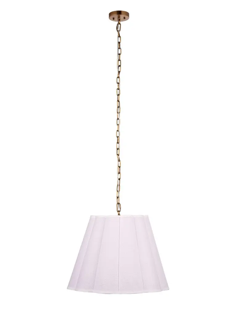 Install these casually elegant and gently scalloped pendants strategically to provide diffused, soft light precisely where you need it. Each features an expertly crafted white linen boucle shade and bottom diffuser to soften and direct the illumination with an adjustable antiqued brass chain.