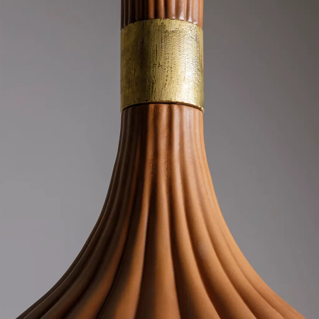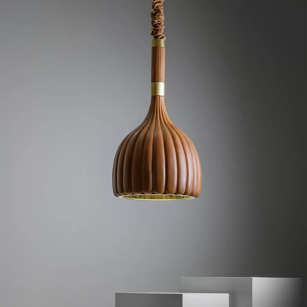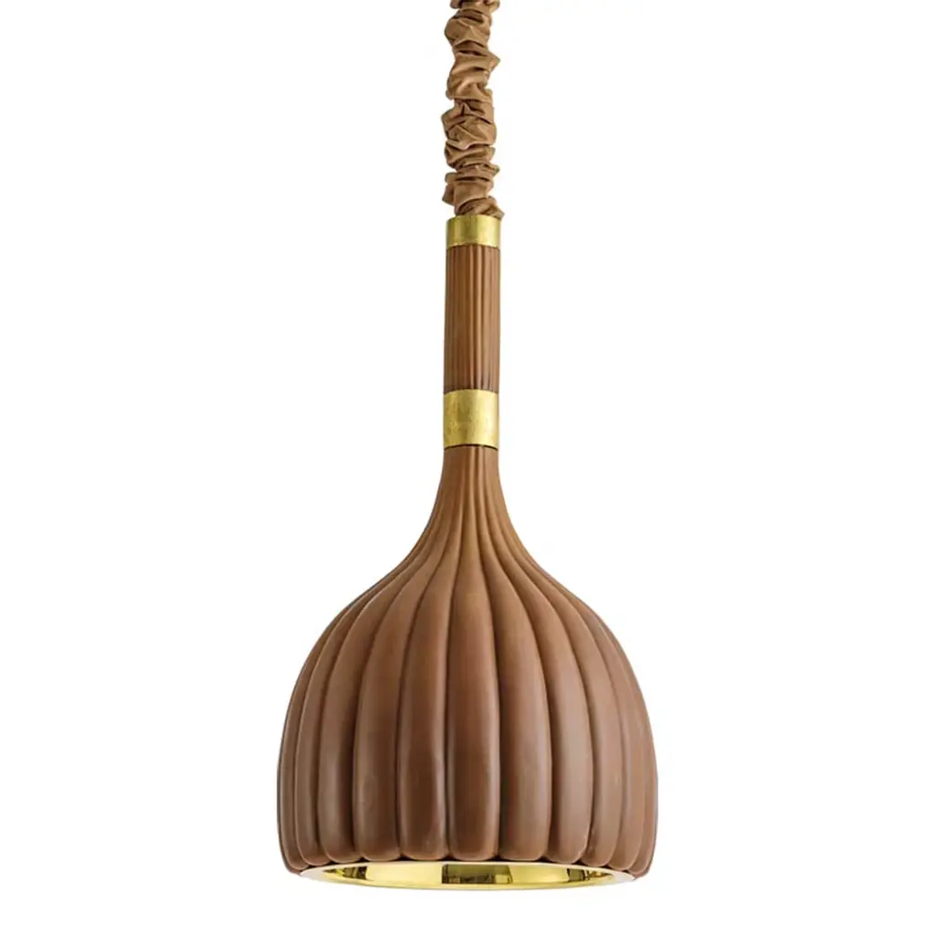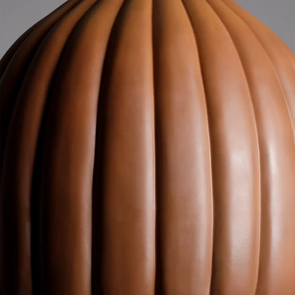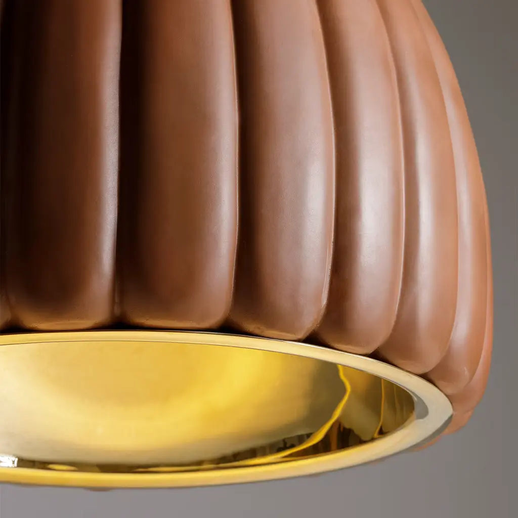 This exclusive pendant lamp features a warm-brown-hued, fine matte-finished leather delicately married with precious brass details. Sustained by a chain covered in brown fabric, the matte ceramic body generously flares enhancing its distinctive scalloped texture. Accented with manually etched brass details on the outside and glossy brass on the inside, the piece is also available in different color options. The chandelier structure alone measures cm 52x52x96h.