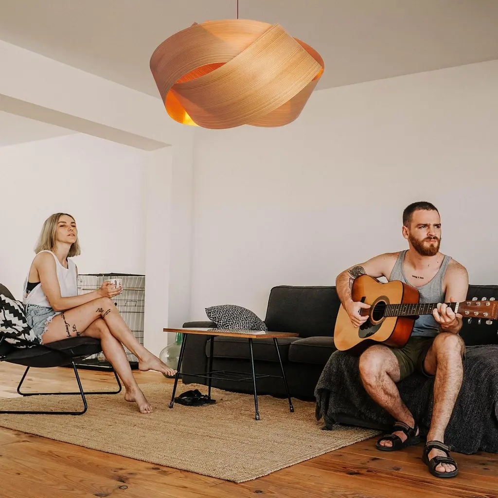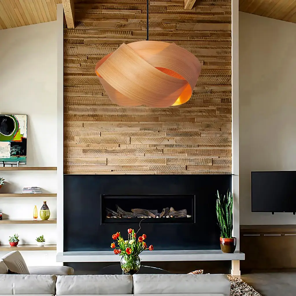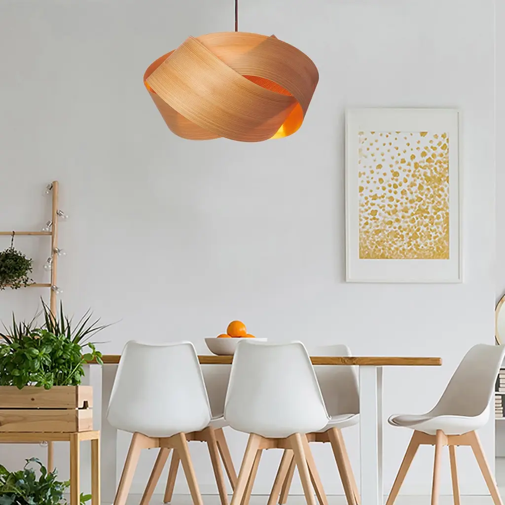 This pendant light features a contemporary Mid-Century Modern design with Scandinavian influences, showcasing a minimalist silhouette crafted from cypress wood veneer. Each light is a unique piece of art, highlighting beautiful variations in the wood grain, including pin knots and wavy spots. The natural beauty of the wood is enhanced through sanding and oiling, revealing warm hues and rich textures. Inspired by Danish modern design, its eye-catching shape provides functional illumination while creating a warm and inviting atmosphere. Ideal for any home or office, this stylish, limited-edition fixture is sure to spark conversation for years to come.Includes:• 10’ cord and canopy• Four dimmable LED bulbs equivalent to 100 watts eachCustom Choices:• Choice of Natural, White, or Gray wood shade• Satin nickel, brushed steel, bronze, black or white stem and canopy kit available upon request.