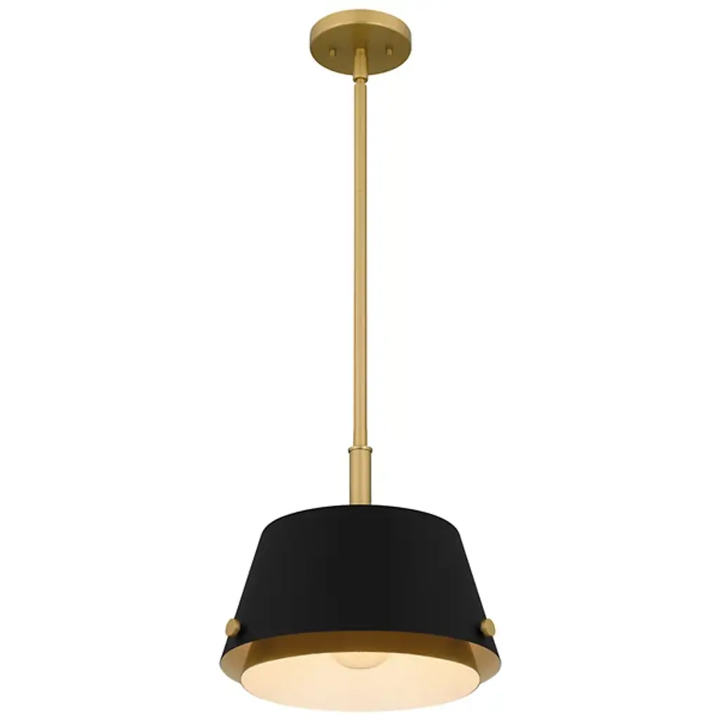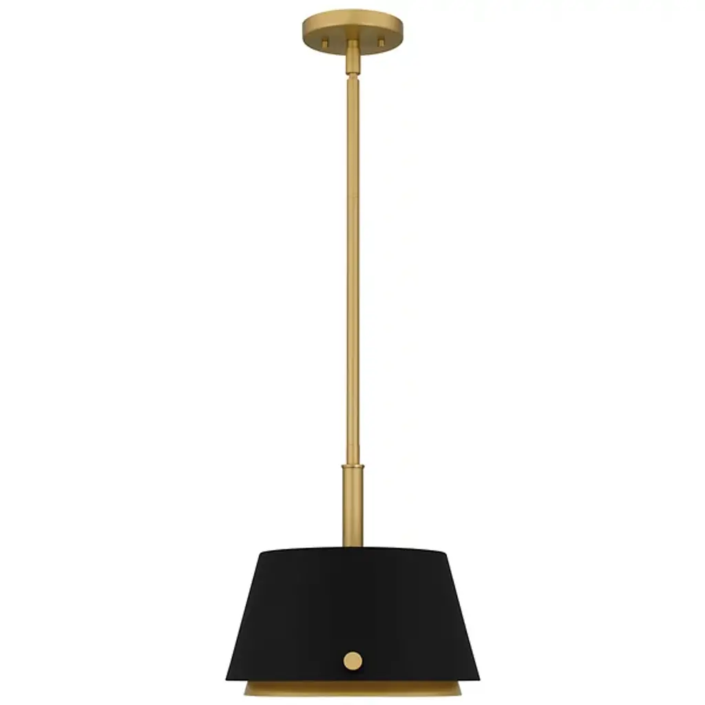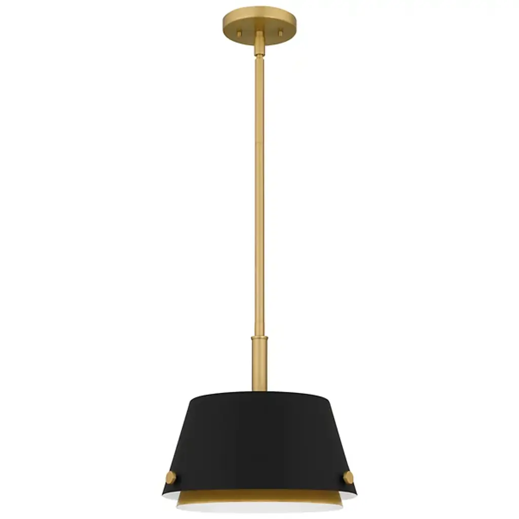 The Scarlett Pendant from Quoizel effortlessly combines simplicity with elegance. Its metal drum shade boasts a double-layer design: a matte black outer shade with a brushed, weathered brass inner metal shade. Subtle brass industrial accents add contrast and drama, making the Scarlett Pendant a standout piece in any room. With its modern and sleek aesthetic, this pendant brings a touch of sophistication to your space while making a bold statement.