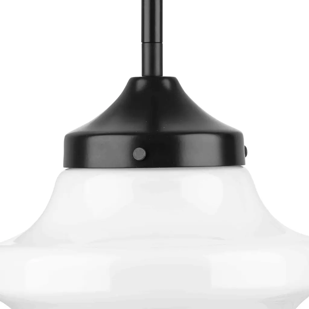Take a trip back in time with the School House Mini-Pendant whose distinctive detail offers antique-style charm. Its scale is perfect for kitchens, breakfast nooks and bar areas, or hang in multiples over a kitchen island in transitional, vintage electric and farmhouse settings. A white opal schoolhouse glass shade is suspended from a cap and downrod coated in asp matte black finish. Includes two 6", one 12", two 15" stems and 6 links of chain for a variety of mounting lengths and can be used on a sloped ceiling. This mini-pendant offers a hint of nostalgia to any decor.