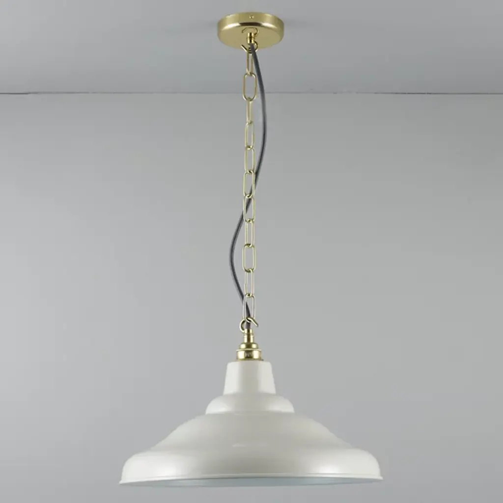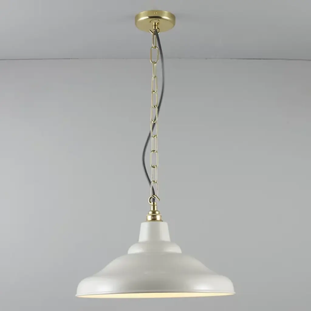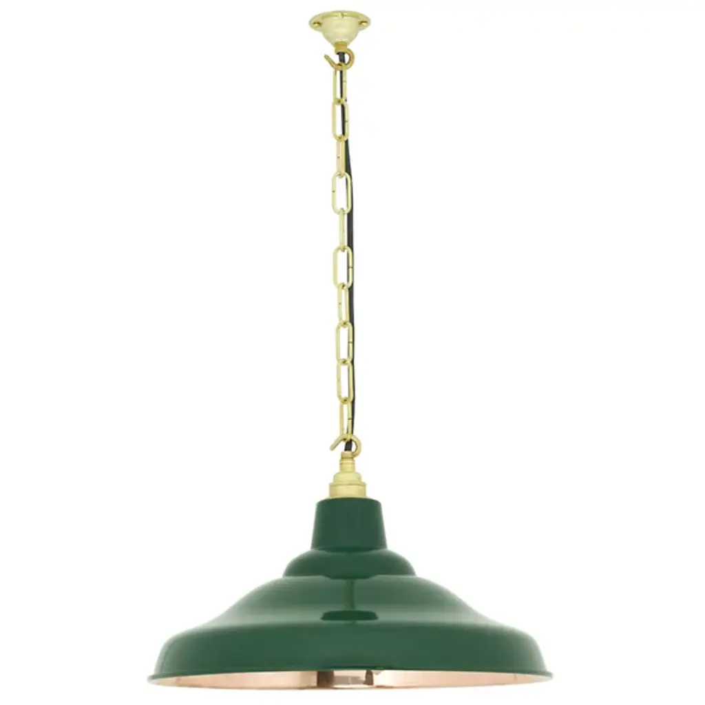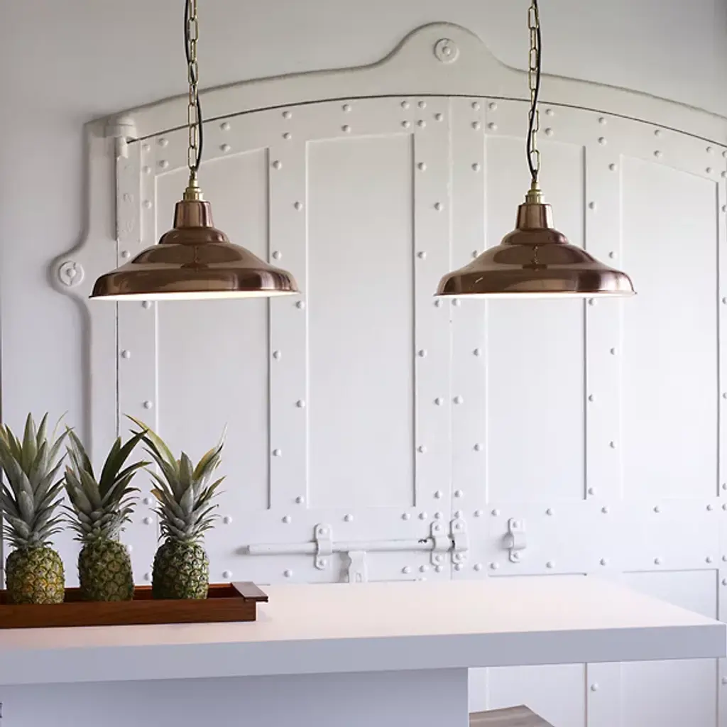The Original BTC/Davey Lighting School Light Pendant features a hand-spun metal shade exclusively crafted in the metal workshops of central England. The transformation from a solid sheet of copper to the final shape relies on the high skill level of craftsmen in the Birmingham factory, resulting in the purest shape and material brilliance. The broad shade is reminiscent of traditional industrial factory lighting, but is set apart by the polished finishes and high-quality details.
