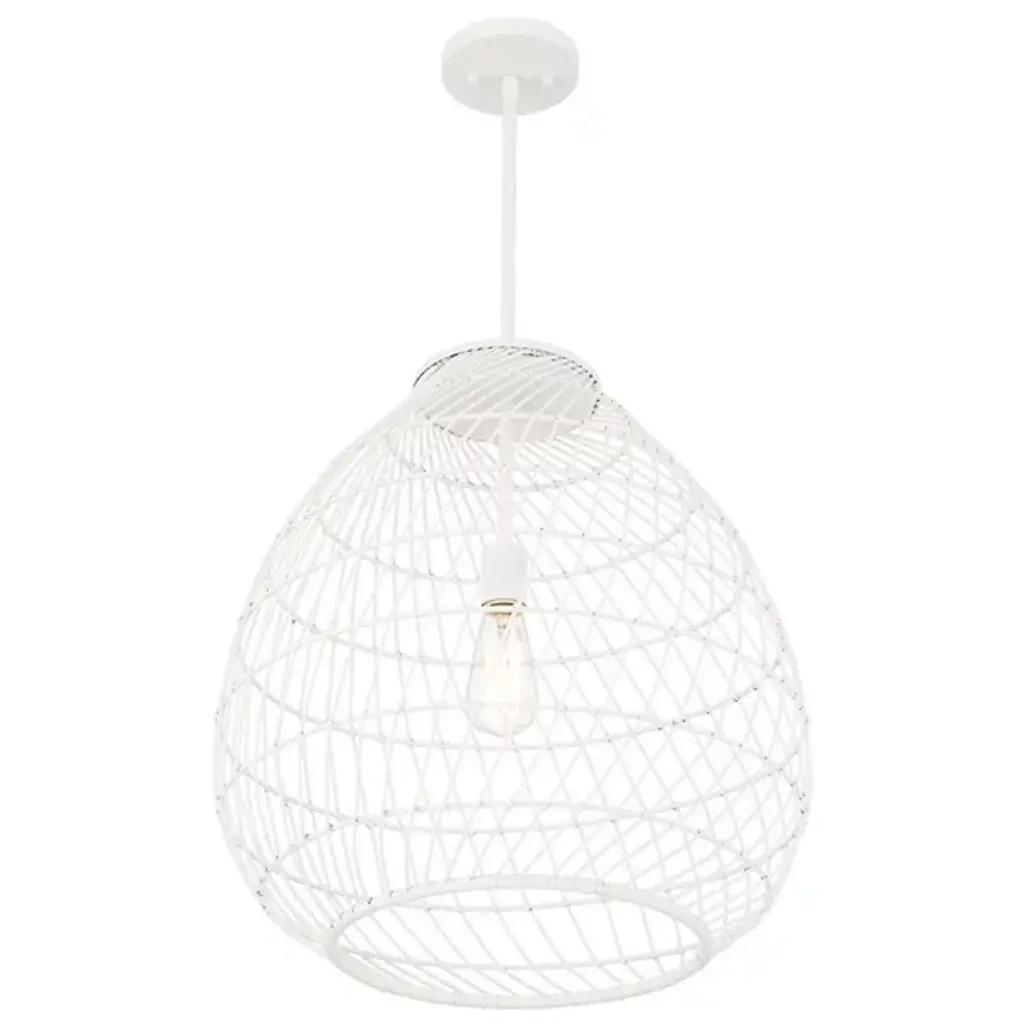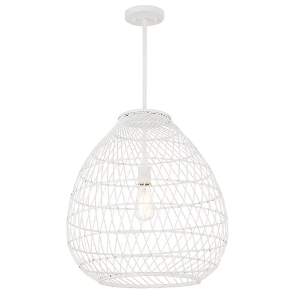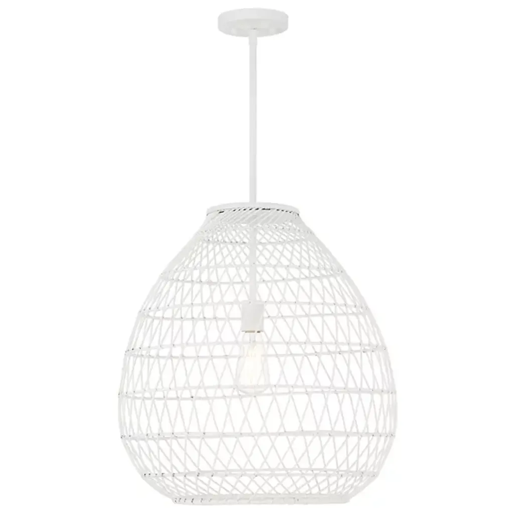 The Schumer Pendant from Alder & Ore showcases the natural beauty of rattan structure and partially restrained lighting. It features a low-profile canopy and a slender stem that support a basket-like white resin wicker shade, creating a tactile, eye-catching texture. The shade holds an exposed light bulb, enhancing its bisque white finish that unifies the metal and resin wicker construction. The pendant embodies a classic style, adding a touch of elegance to any space.