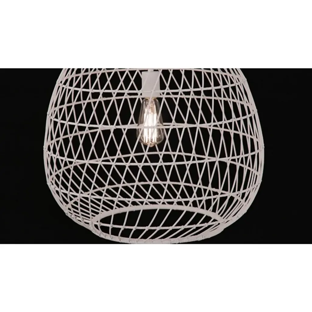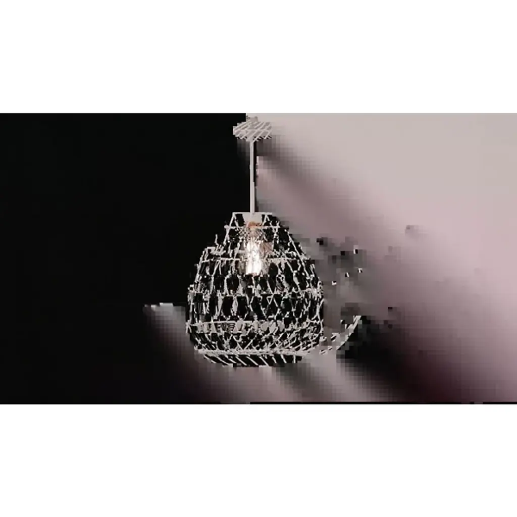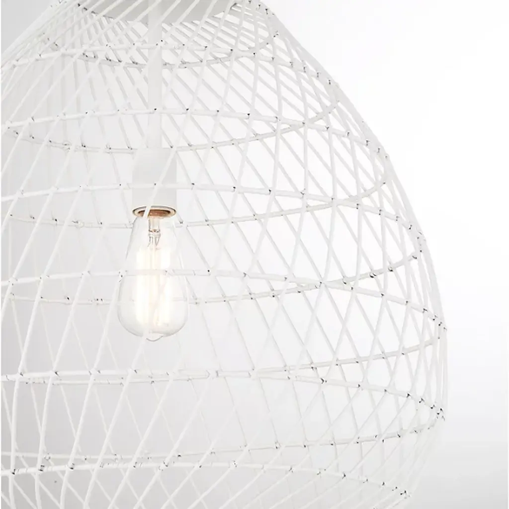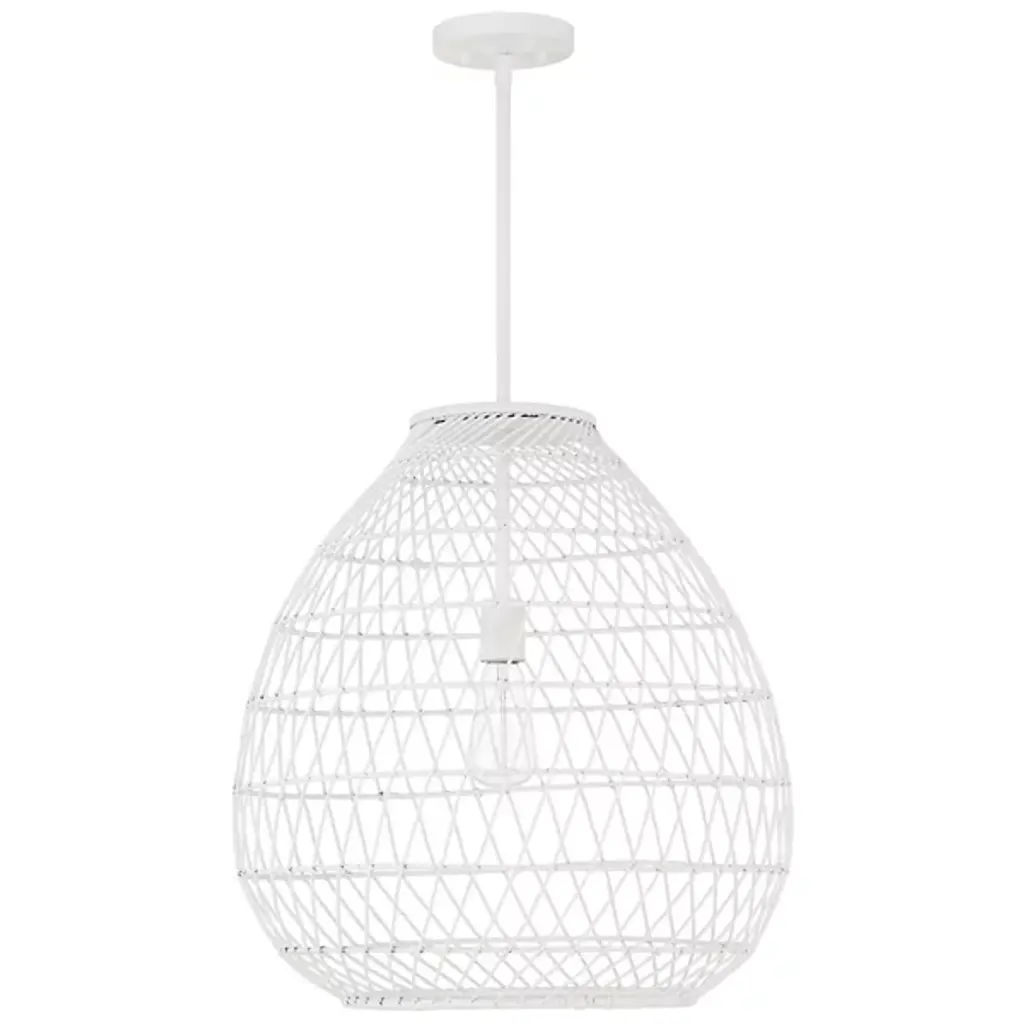 The Schumer Pendant from Alder & Ore showcases the natural beauty of rattan structure and partially restrained lighting. It features a low-profile canopy and a slender stem that support a basket-like white resin wicker shade, creating a tactile, eye-catching texture. The shade holds an exposed light bulb, enhancing its bisque white finish that unifies the metal and resin wicker construction. The pendant embodies a classic style, adding a touch of elegance to any space.