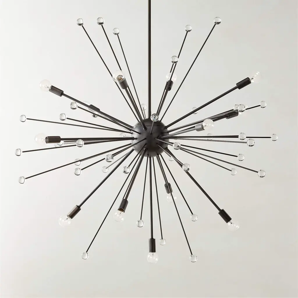 The classic Sputnik silhouette gets a glamorous upgrade courtesy of Melbourne design studio VUUE. Iron rods, finished in matte black for a little extra edge, extend outward from a spherical center; at their ends, glass balls twinkle among the lightbulbs, creating a dazzling focal point in any room. CB2 exclusive.