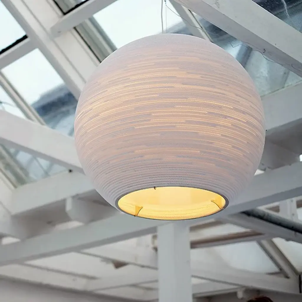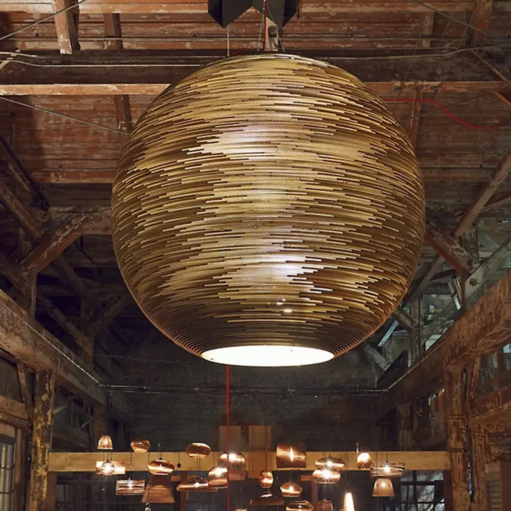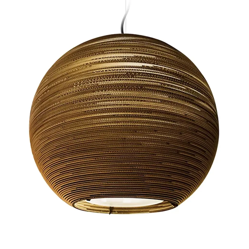 Like the giant red star by the same, the Scraplight Arcturus Pendant from Graypants bursts with rays of inspiring light. The piece commands every eye in the room, day and night, as ringed layers of recycled cardboard culminate into a celestial form. Each ring is laser-cut to the perfect shape then bonded meticulously by hand for the stunning result. A glass diffuser peaks out the opening of the globe; its tempered and sandblaster surfaces mellows out the downpouring light. When turned on, bulbs inside carve out glowing slices of ambient light across the sphere, leaving behind a moving design of shadowed striations.