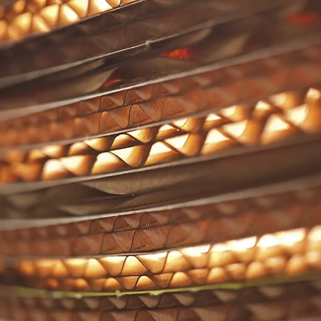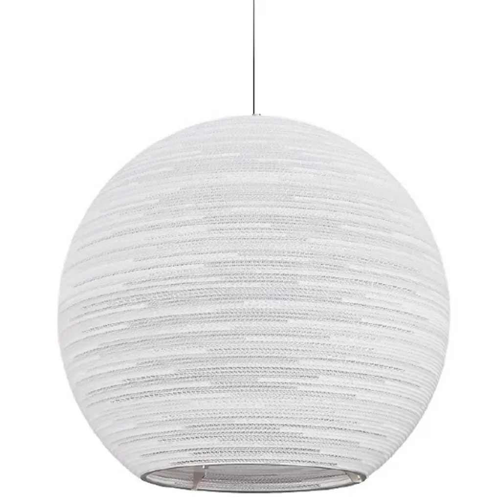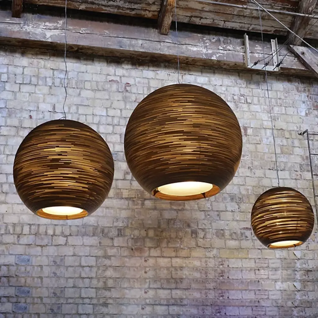 Like the giant red star by the same, the Scraplight Arcturus Pendant from Graypants bursts with rays of inspiring light. The piece commands every eye in the room, day and night, as ringed layers of recycled cardboard culminate into a celestial form. Each ring is laser-cut to the perfect shape then bonded meticulously by hand for the stunning result. A glass diffuser peaks out the opening of the globe; its tempered and sandblaster surfaces mellows out the downpouring light. When turned on, bulbs inside carve out glowing slices of ambient light across the sphere, leaving behind a moving design of shadowed striations.
