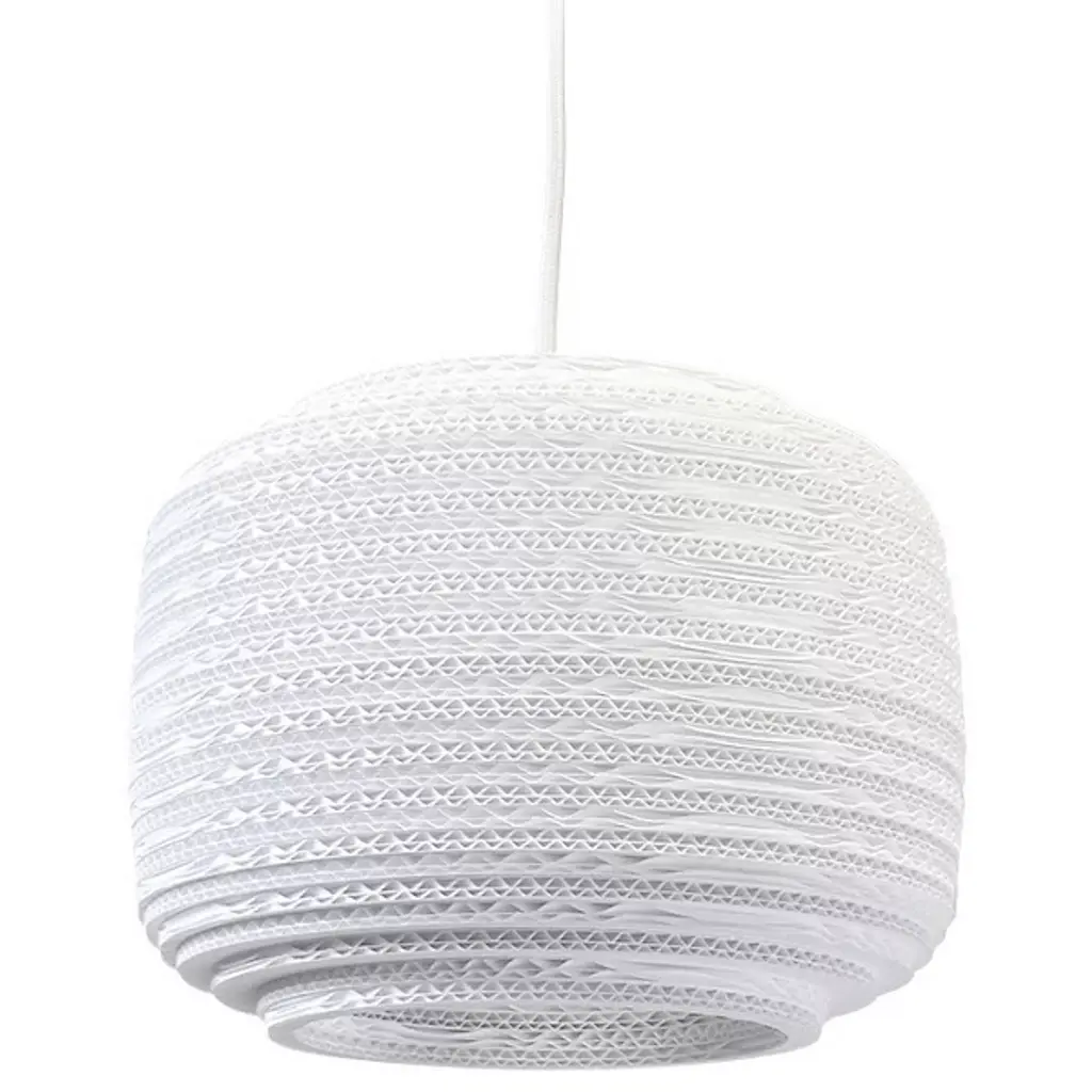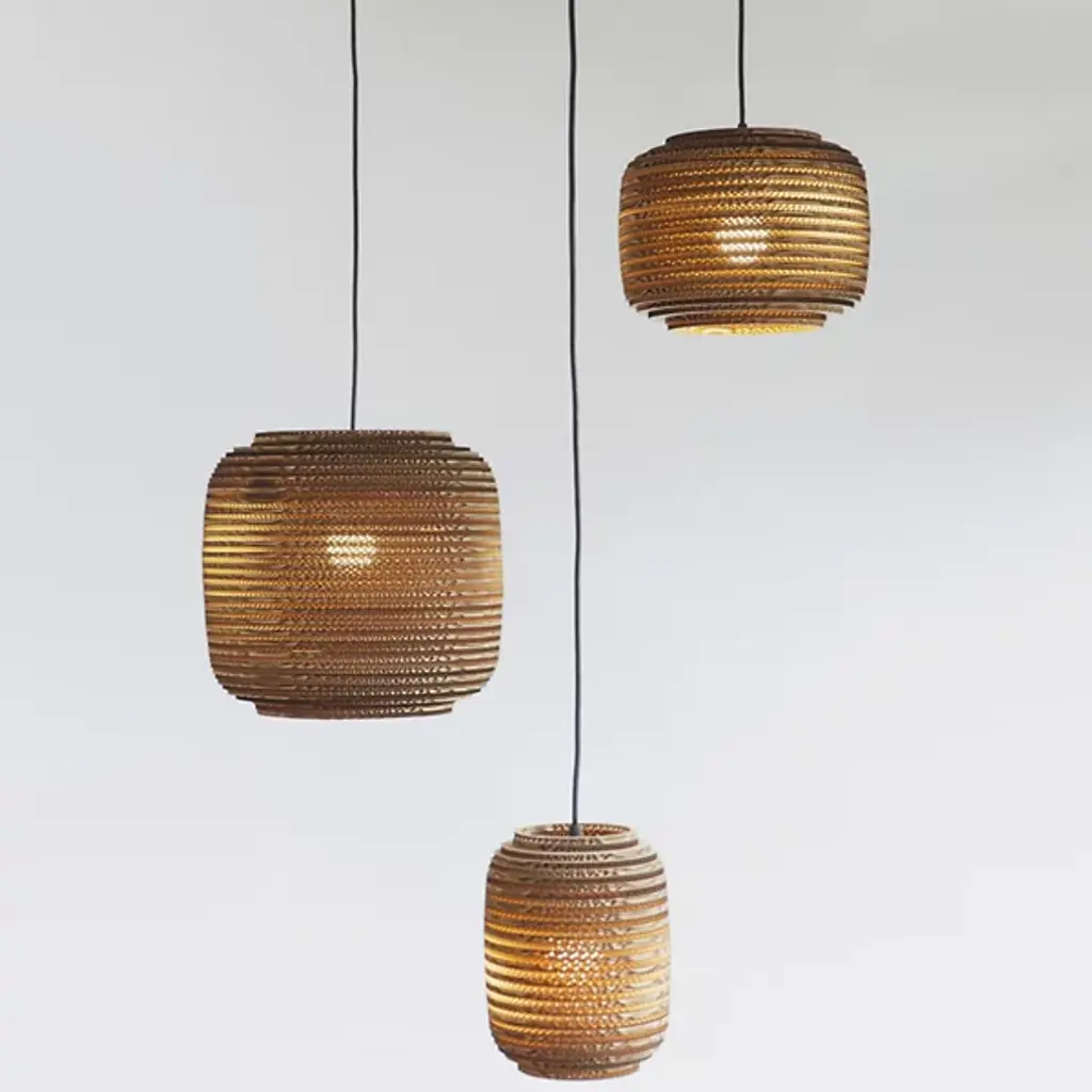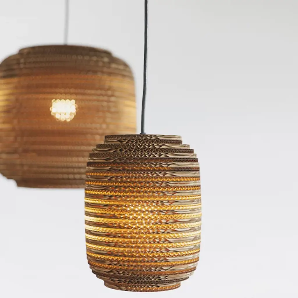 Showcasing a new way to reuse cardboard, the handmade Graypants Scraplights Ausi Pendant features a shade where light peeks through tiny nooks to create unique displays of illumination throughout a space. Its shape, not quite circular yet not exactly oval, offers a soft, warm feel to modern spaces.