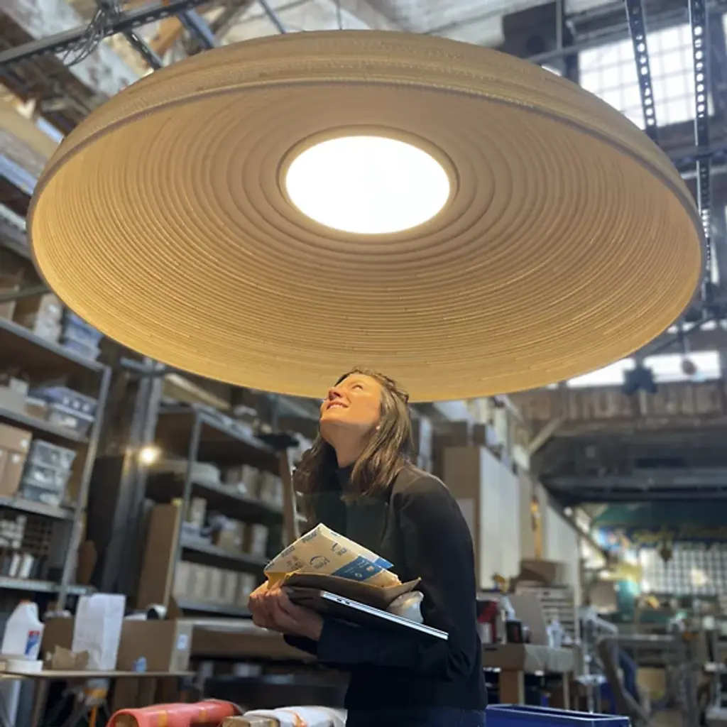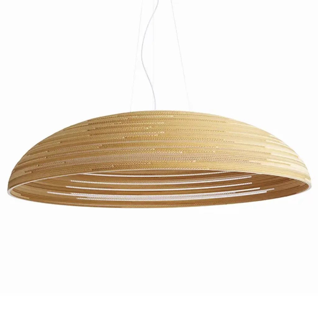 The Scraplights Float LED Pendant from Graypants enhances its surroundings using a simple, minimalist design and fabulous functionality. Designed by Jonathan Junker and Seth Grizzle, each Scraplight is handmade in their Seattle studio from recycled cardboard. Each shade is laser-cut with precision and appears to float, suspended via cable, and hand-layered using a non-toxic adhesive with fire retardant to create a safe, shallow dish shape, with the cardboard corrugation scattering pinpoints of ambient light to the sides, accompanied by a warm wash of downlight below.