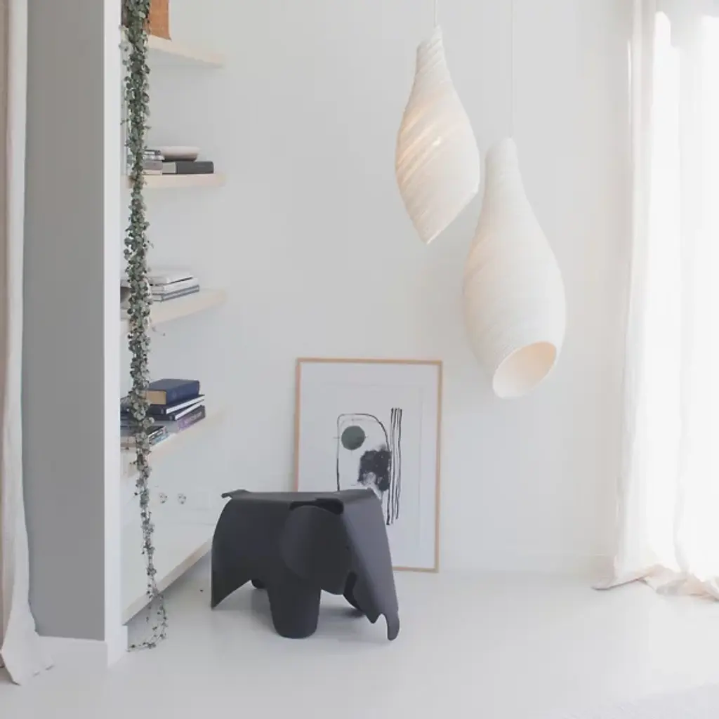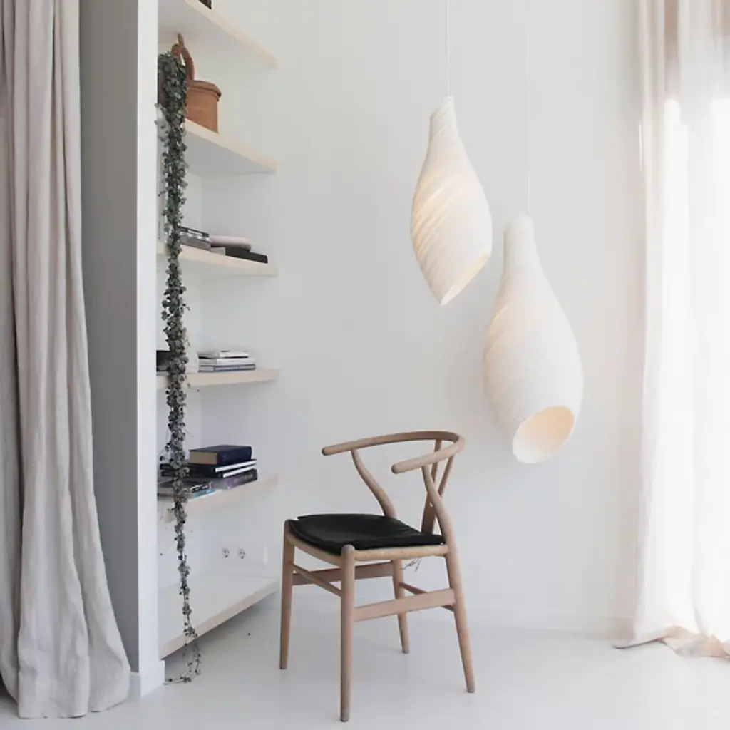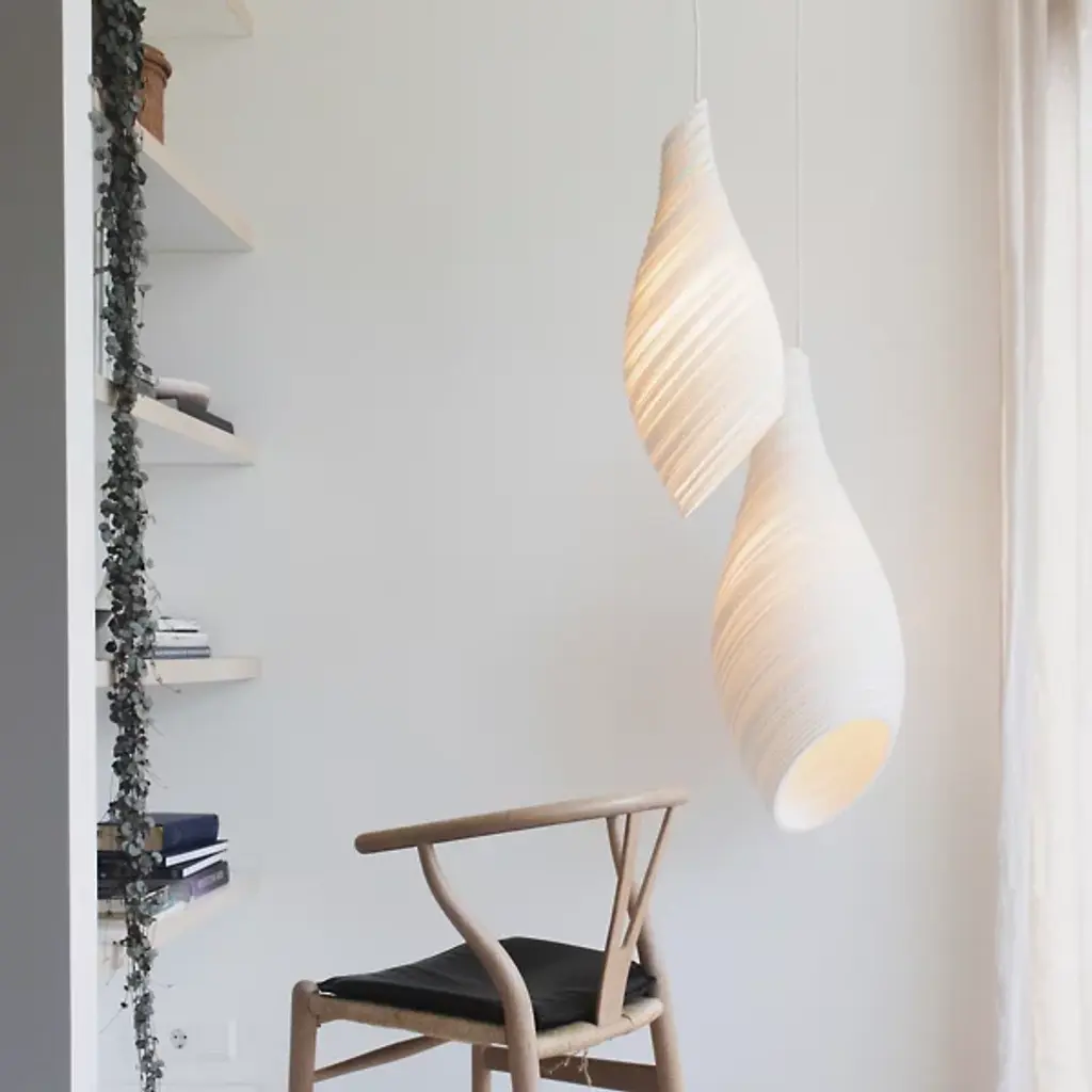 The laser-cut lines and hand assembly of the Nest Pendant from Greypants present a study in functional aesthetics combined with a softer, living shape. A shade of layered, recycled cardboard provides ambient light through the corrugated holes while an offset open base softens any harsh direct downlight. A good decision for minimalist decor best installed in dry conditions like living rooms, hallways or reading nooks, and best cleaned with compressed air and dry dusting.