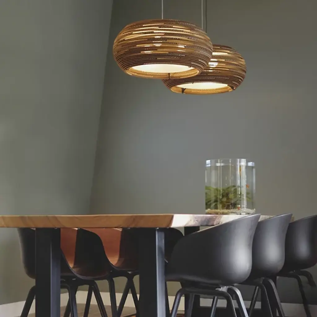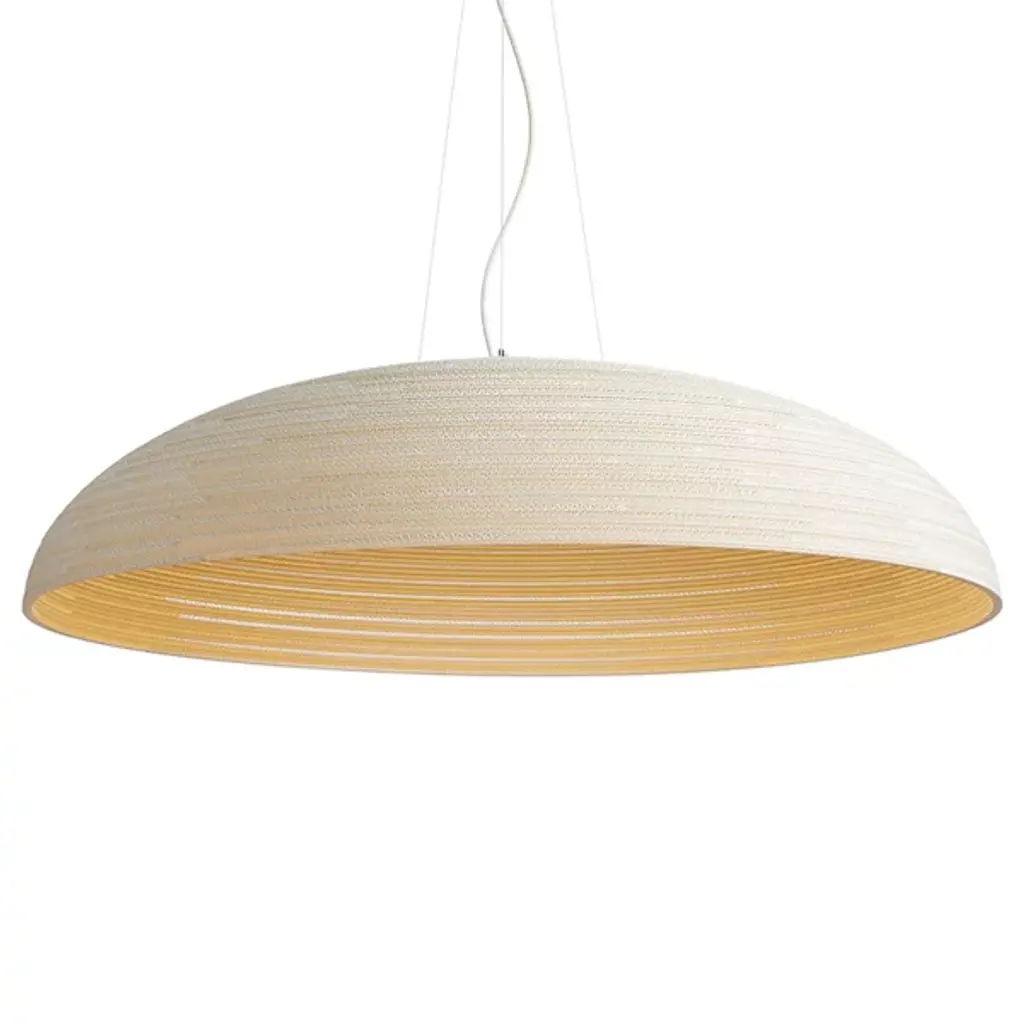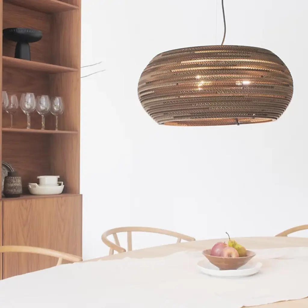 Handmade with layers of recyclable cardboard, the Scraplights Ohio Pendant finds warmth in the raw material, forming a rustic source of ambient light. Part of the larger range of pendants, the Ohio is held in place with a steel frame, and also includes a sandblasted glass diffuser to shield and further soften the down light below.