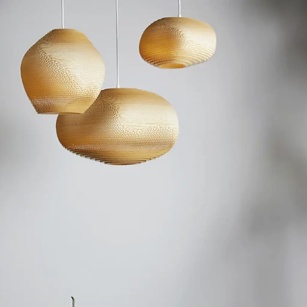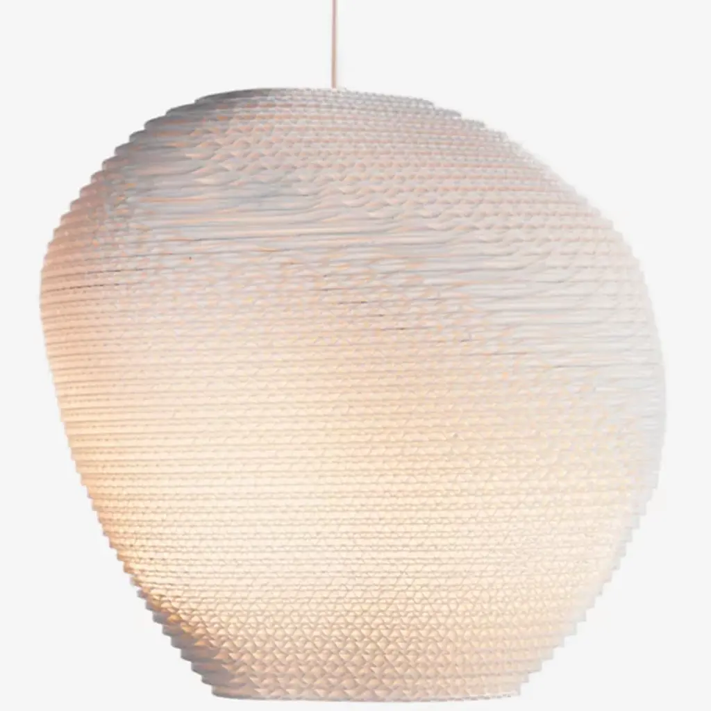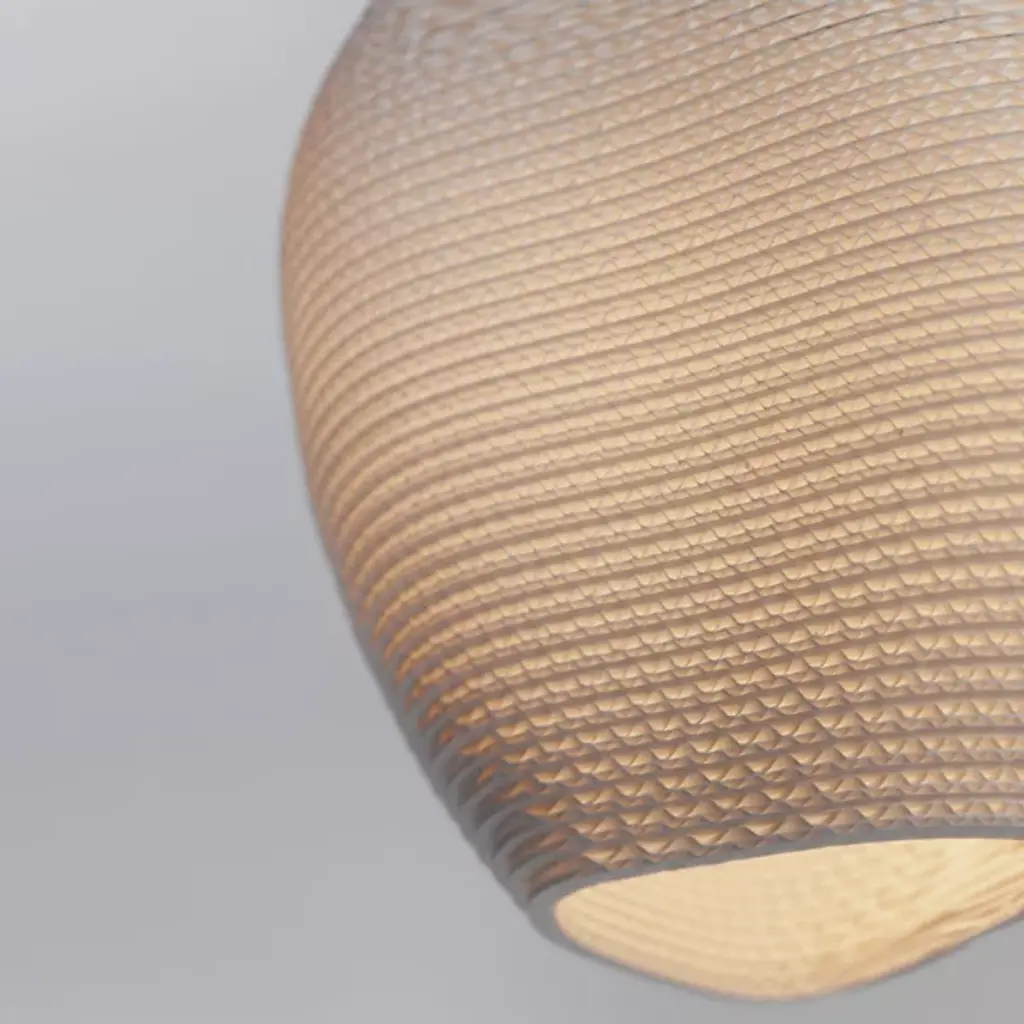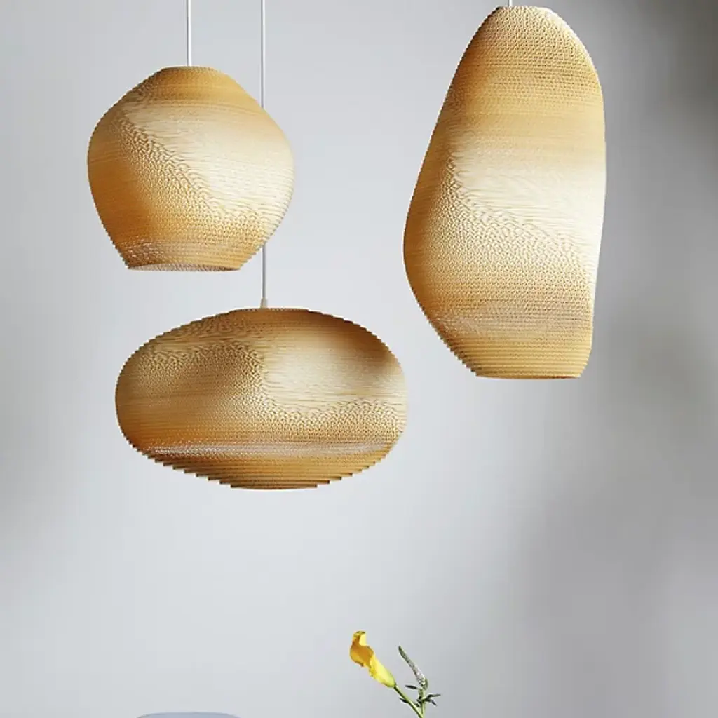 Representing pebbles on the shore of a river, the Pebbles Allyn Pendant by Graypants is an eco-friendly, sustainable lighting option made of recycled cardboard. Laser-cut for an intricate, pleasing design, the body is then handcrafted using non-toxic adhesive. A simple, thin downrod and bare bulb within showcase the otherwise hidden details of the piece. A closer inspection will find innumerable swirls and shapes, a natural flow conveniently located within your home. The light is soft and clean, and the unique composition of the piece is sure to become an eye-catching favorite.