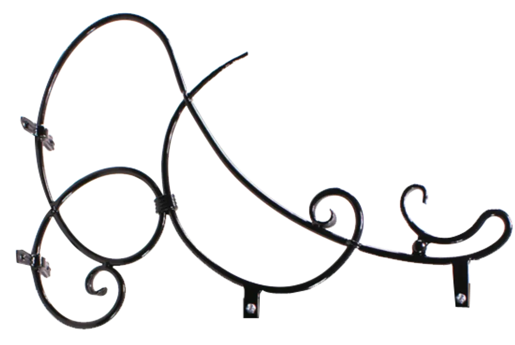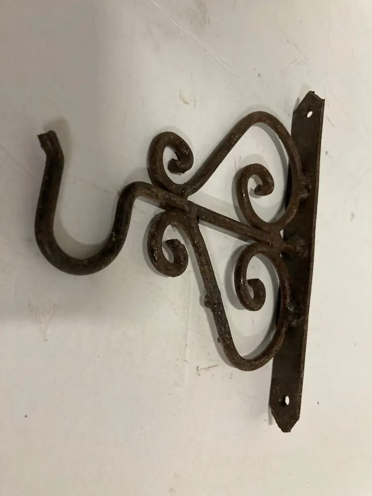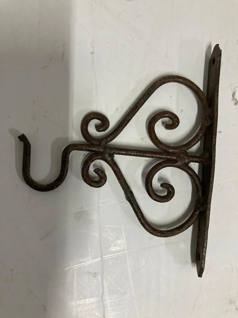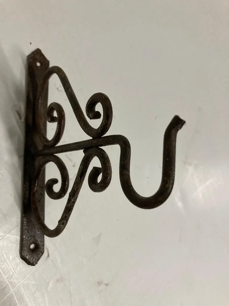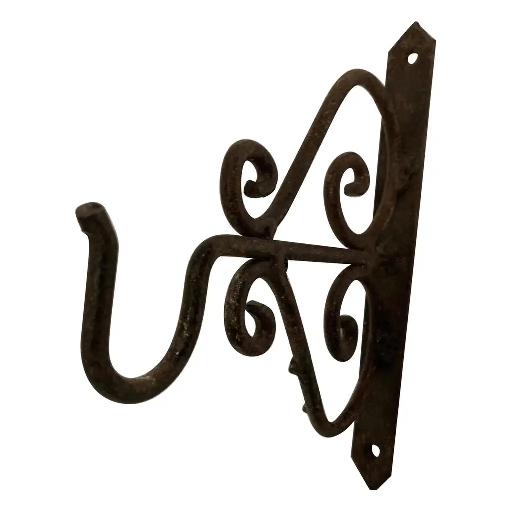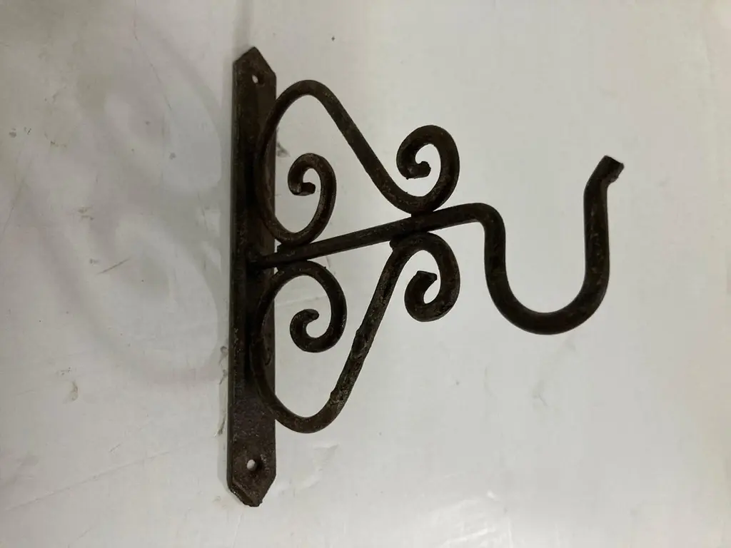 Hand crafted iron scroll design wall bracket. Wrought iron handcrafted wall-bracket for lanterns or signs.Perfect for hanging lights or plants outdoors.Scrolling wall-mounted brackets.Multiple available.Dimensions: Projection: 6" x 8" H x 0.75" W.Handcrafted size may vary slightly.
