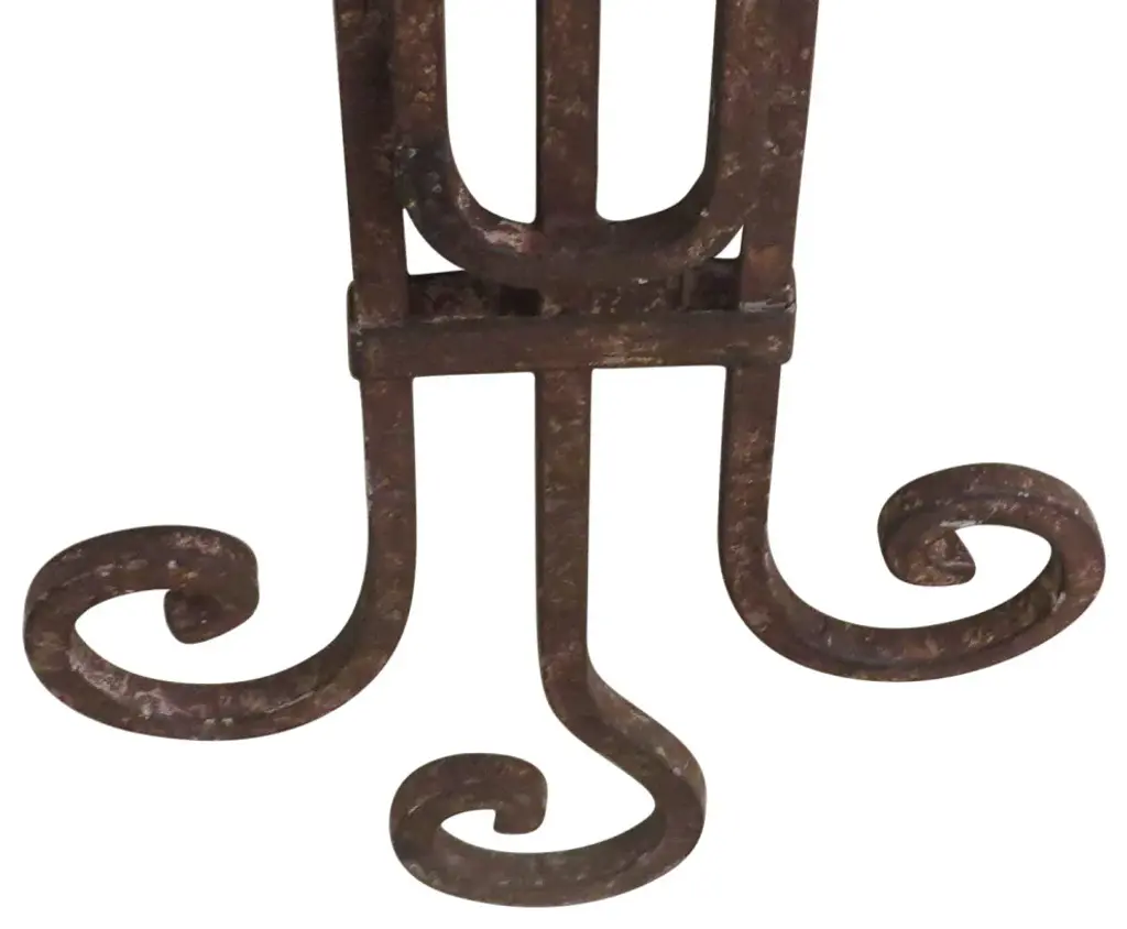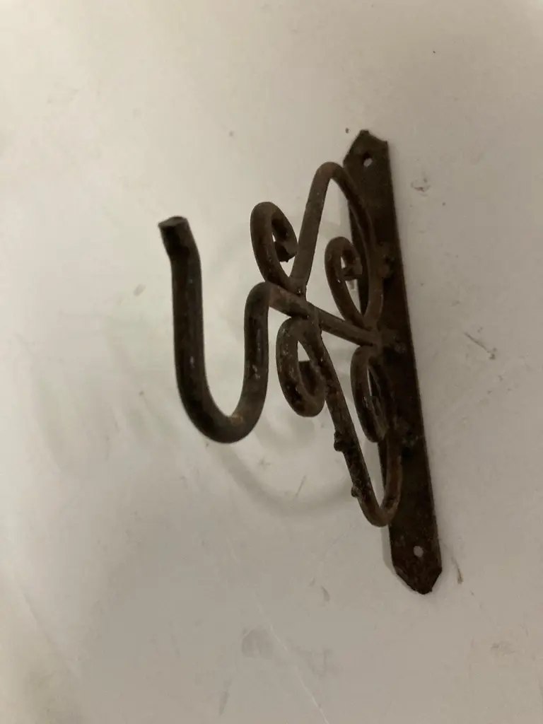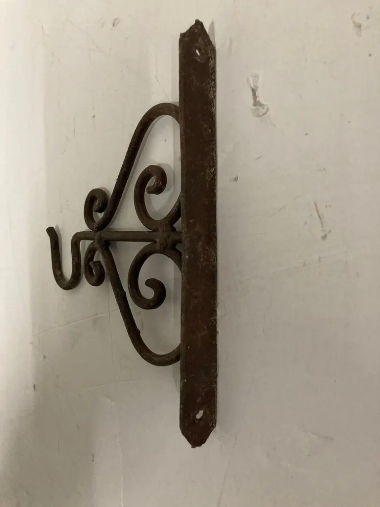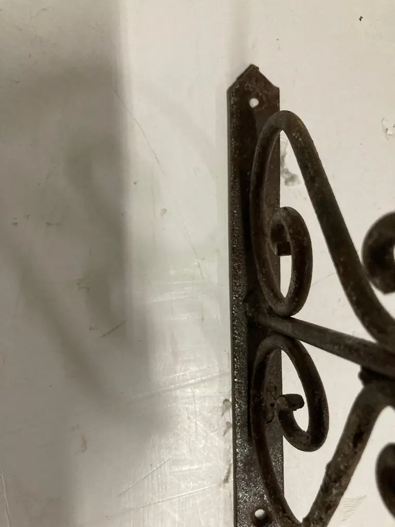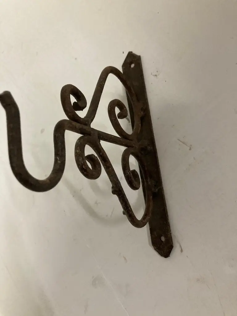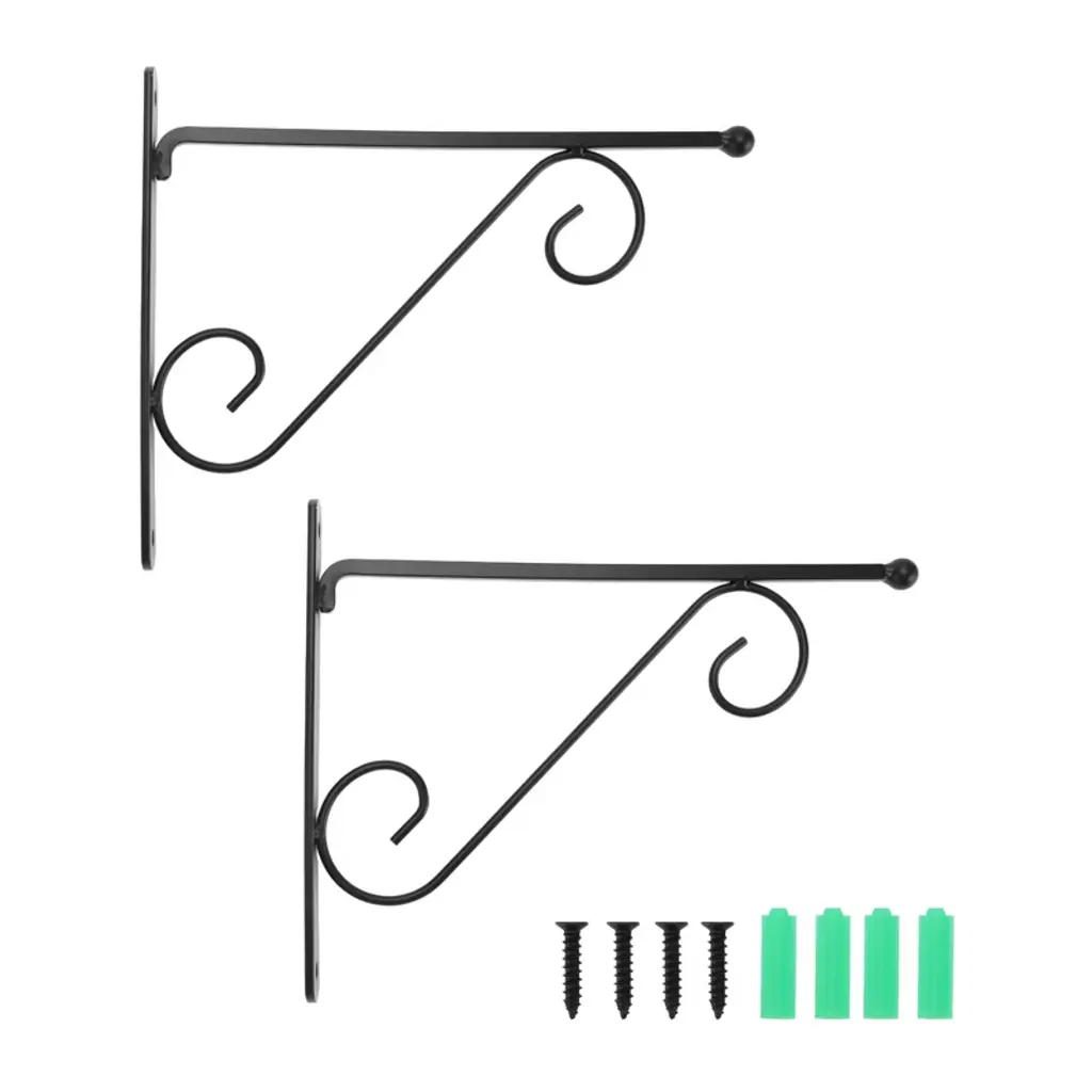Hand crafted iron scroll design wall bracket. Wrought iron handcrafted wall-bracket for lanterns or signs.Perfect for hanging lights or plants outdoors.Scrolling wall-mounted brackets.Multiple available.Dimensions: Projection: 6" x 8" H x 0.75" W.Handcrafted size may vary slightly.