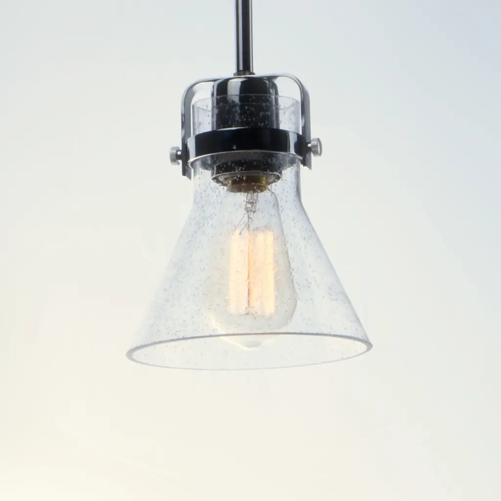 This nautical-inspired collection features Clear Seedy glass cones suspended by a yoke frame. The clear glass offers abundant lighting and compliments the styling of the fixture. Make it a more industrial look by adding filament E26 light bulbs.