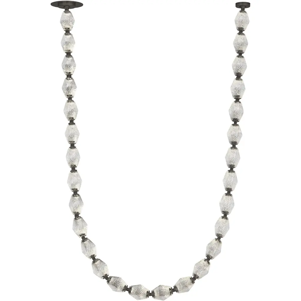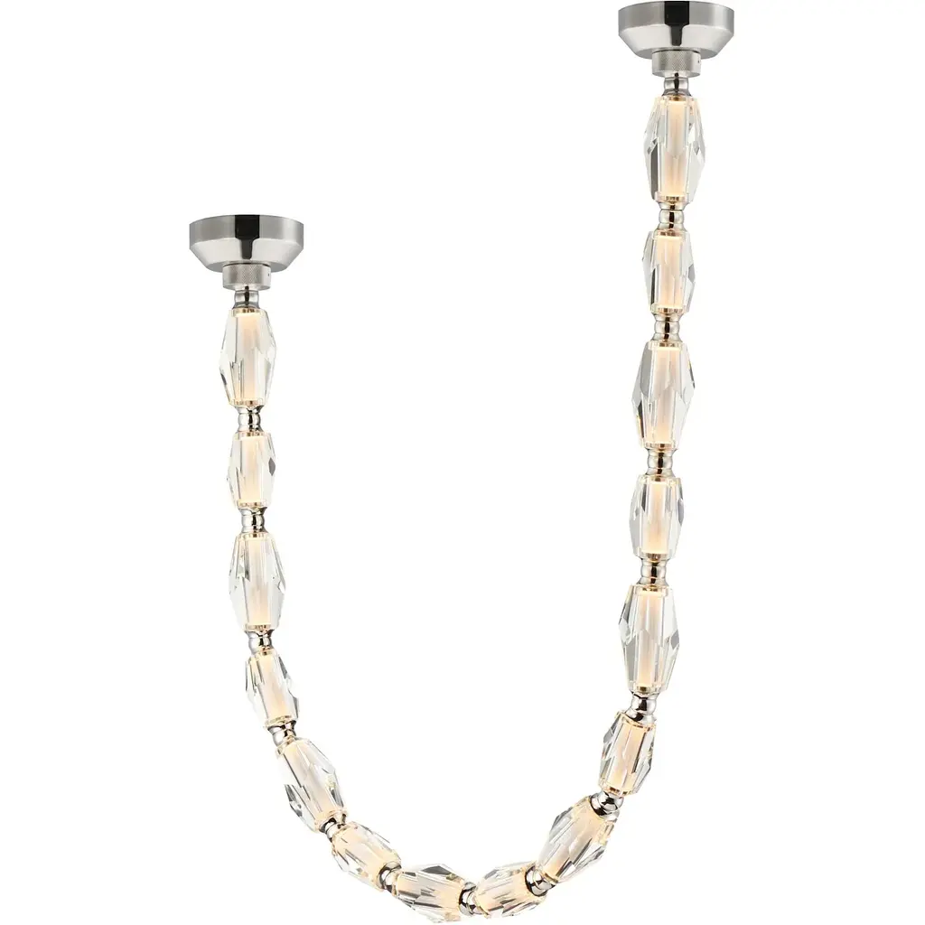 The Collier by Sean Lavin exudes luxury and sophistication. Solid faceted crystal fully encapsulates integrated LED modules interlocked by solid brass connectors. Available in multiple length strands for the ultimate in customization. Creates an incredible light sculpture with stunning illumination. The Collier features solid faceted crystal manufactured in the Czech Republic. The natural brass connectors are custom engineered to support the crystal and add additional beauty to the piece. Available with remote or surface mounted driver options. Predetermined length options allow for easy ordering with virtually unlimited versatility. Contact factory for custom configurations. Patent pending.