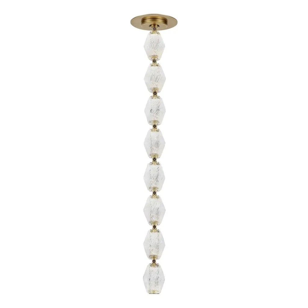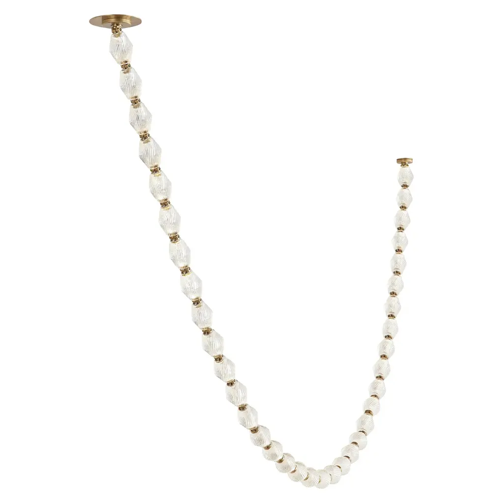 The Sean Lavin Collier Pendant Chandelier exudes luxury and sophistication. Solid faceted crystal fully encapsulates integrated LED modules interlocked by solid brass connectors. Available in multiple length strands for the ultimate in customization. Creates an incredible light sculpture with stunning illumination. The Collier features solid faceted crystal manufactured in the Czech Republic. The natural brass connectors are custom engineered to support the crystal and add additional beauty to the piece. Available with remote or surface mounted driver options. Predetermined length options allow for easy ordering with virtually unlimited versatility. Features