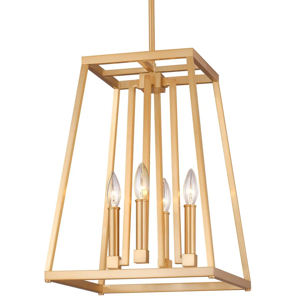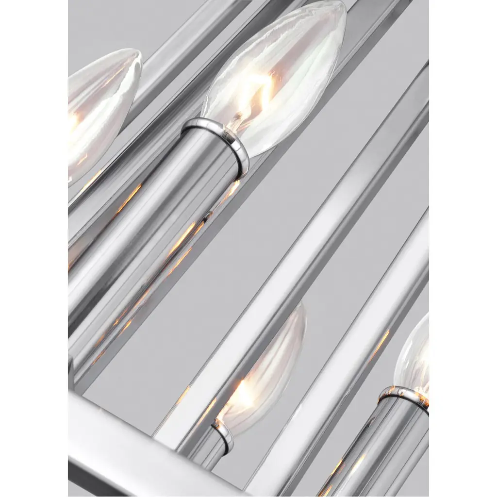 The Sean Lavin Conant four light mini pendant in chrome provides abundant light to your home, while adding style and interest. The transitional Conant lantern pendant collection by Sean Lavin is highly structured and infinitely inviting, and the crisp architectural lines of these open lanterns are richly warmed by a new Gilded Satin Brass finish or modernized with a bright Chrome finish. Intricate square details at the base of each floating candle tube exemplify the artistry and skill required to create these majestic lighting fixtures. The open frames (no glass panels) give the lantern silhouettes an airy, updated look and will look perfect paired over an island as kitchen lighting, dining room lighting or in a bedroom paired with the complementary wall sconces.