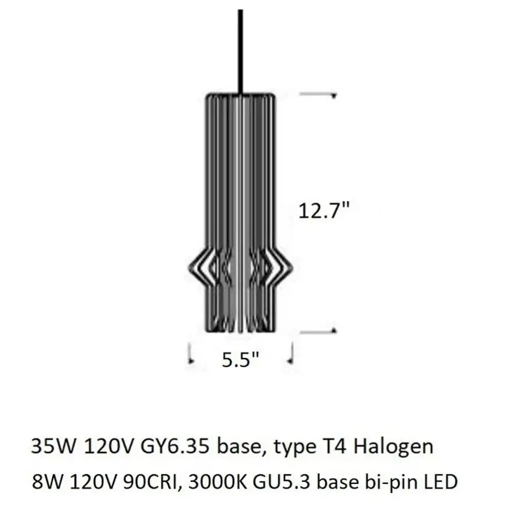 The Mini Syrma pendant light features duplicated machined metal rods that have been painstakingly fastened at perfectly spaced intervals to form a striking, multidimensional shade. At its core, light emanates from its smoothly diffused LED source to illuminate this mid-century modern inspired piece. Scaling at 12.7” in height and 5.5” in width the Mini Syrma is ideal for kitchen island task lighting, dining room lighting and bedroom lighting. Your choice of energy efficient LED lamping ships with the Mini Syrma to save you time and money. All lamping options are dimmable to create the desired ambiance in your special space. Features