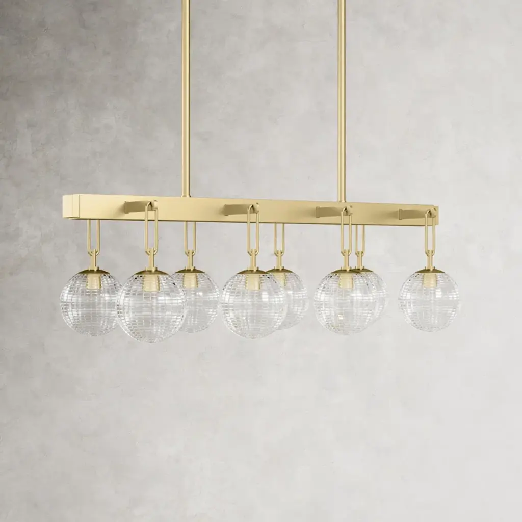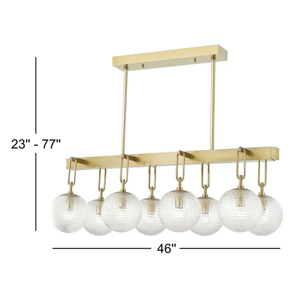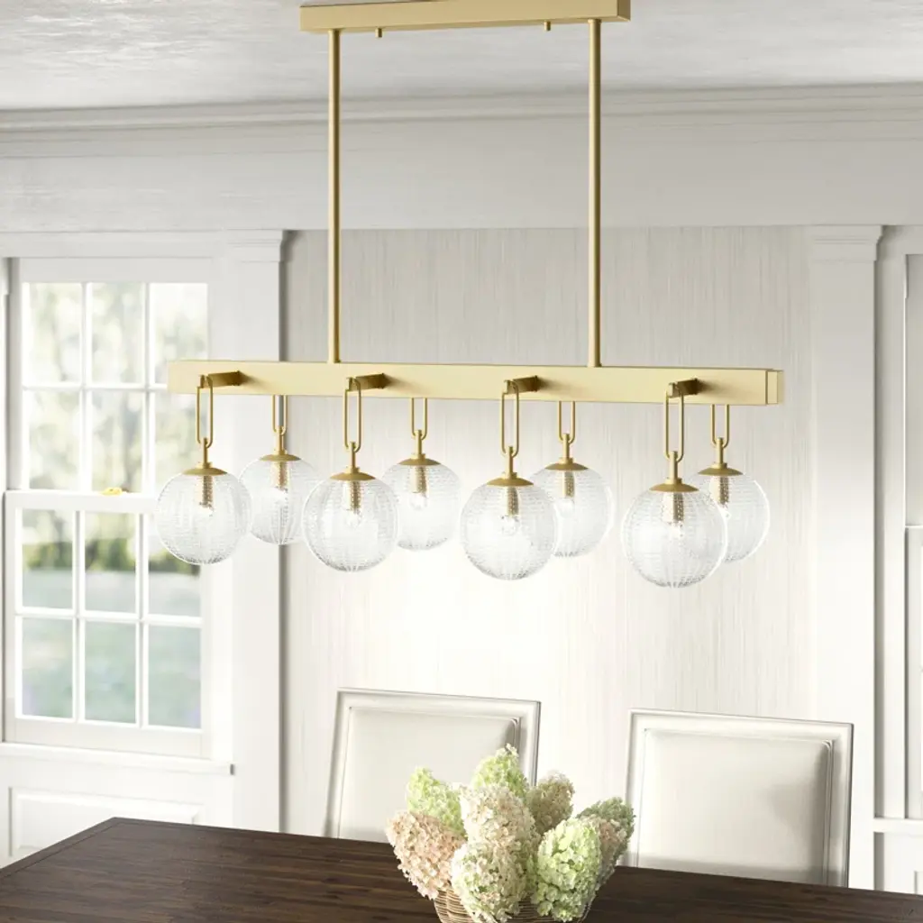 This pendant light is sure to spark conversations in the kitchen while adding a boost of brightness. It's made from metal in the sleek finish of your choice and features 8 lights hanging from a rectangular base. Each of the eight 60W bulbs (sold separately) sits inside a textured glass shade that filters ambient light throughout your space. This linear pendant hangs from a rectangular canopy and a length of adjustable-height downrod. Best of all, it's safe to use in damp locations and is compatible with dimmer switches.