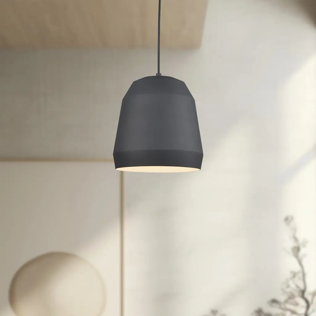 Single-lamp pendant with faceted aluminum shade showcasing powder-coated finishes against a matte white interior. Exterior shade color in black. Suspended by cloth cable. Available in two sizes.