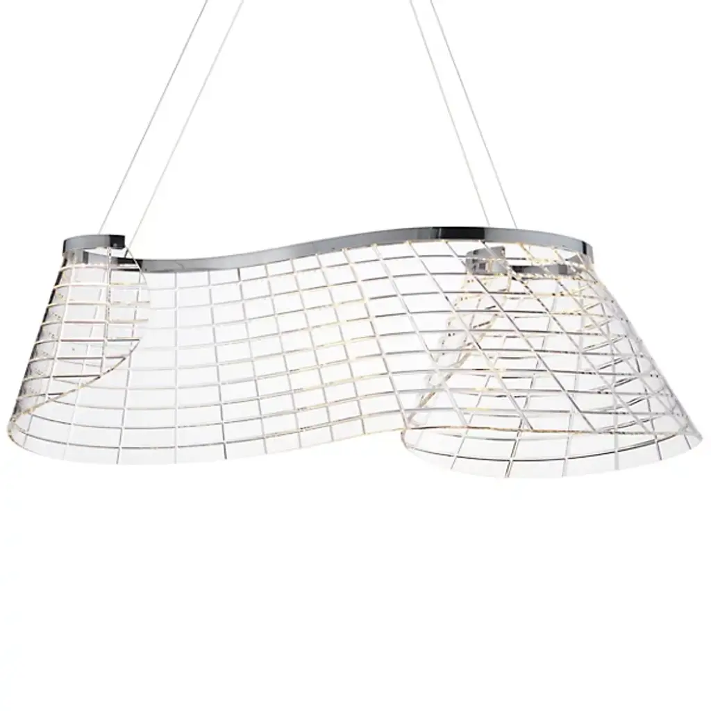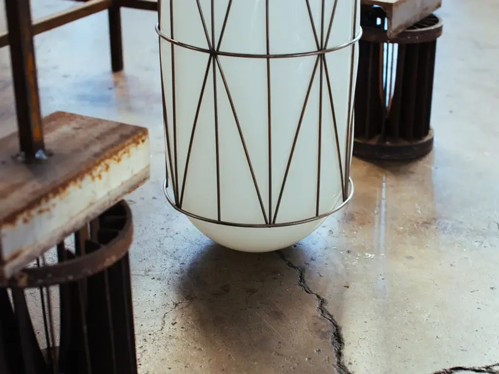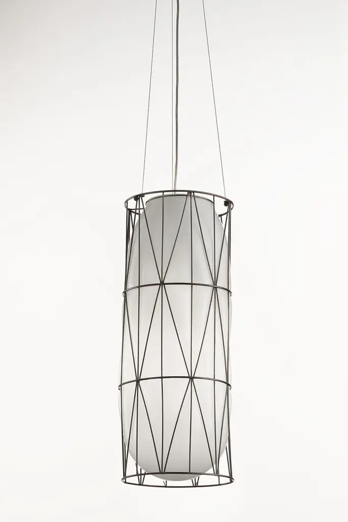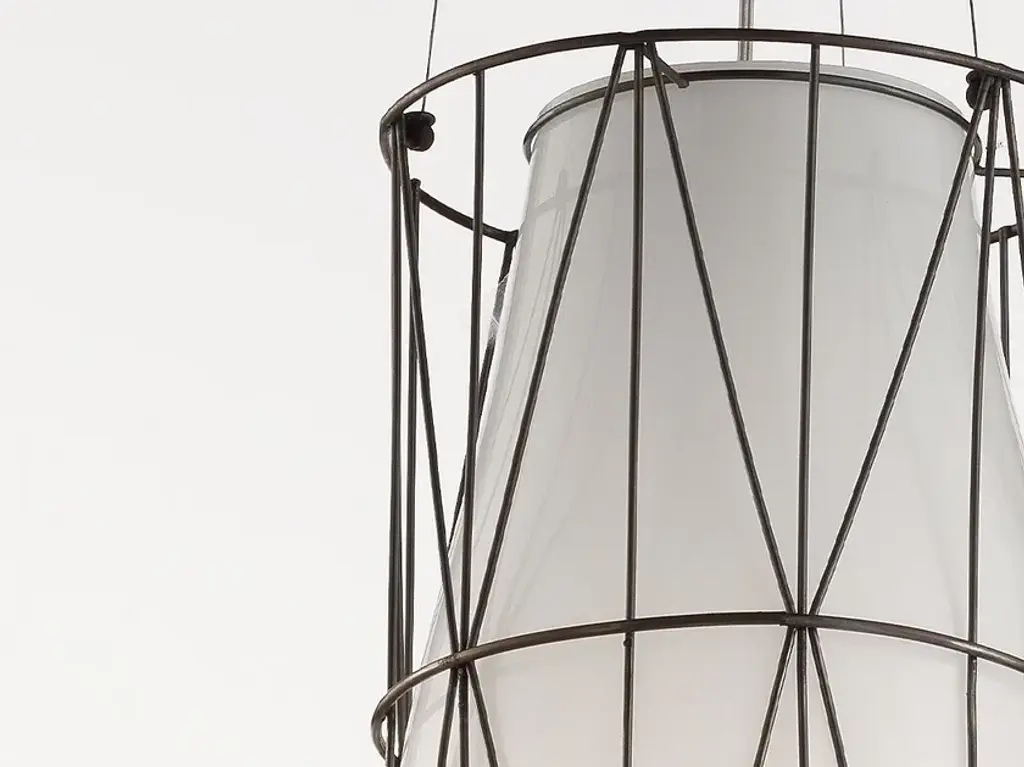 The glass is not contained, it protrudes, extends and deviates from the metal cage; it moves through space and it moves towards areas where it feels protected. The material researches its style, its evolution and its shape. Contact and distance are the laws of physics, spontaneous laws of these luminous shapes; metal that is confined and glass that extends... signs of memory and history.Murano glass pendant lamp.