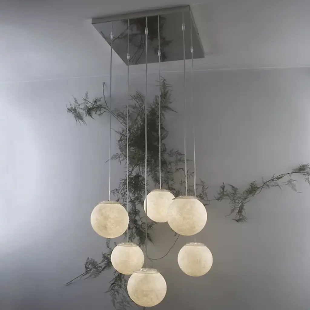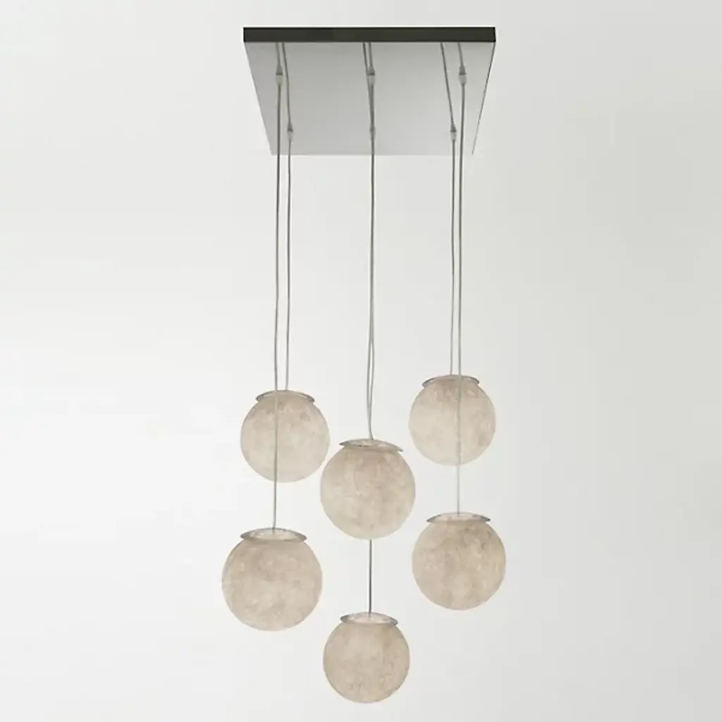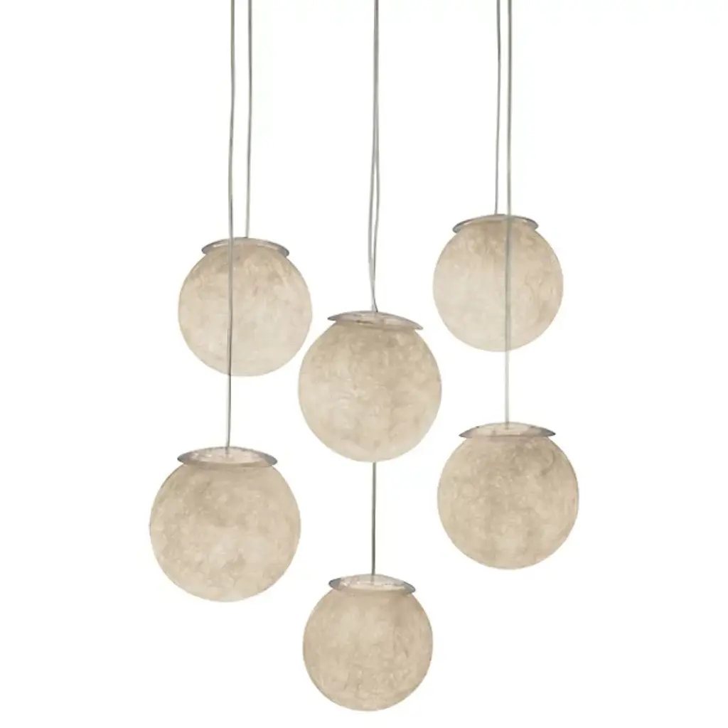 Captivating and enchanting, the Sei Lune Pendant Light is inspired by the great mysteries of the moon. The six globe-shaped shades of this modern multipoint pendant light are made from nebulite, which is a combination of resin and fiberglass, and mimic the uneven, softly luminescent qualities of the moon's surface. Each shade is suspended by a single cable from a square canopy. Just like the light the moon casts at night, the Sei Lune Pendant Light provides a warm, diffused, ambient light that is perfect in both residential and commercial spaces.