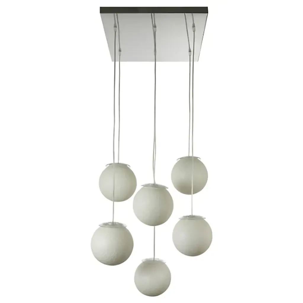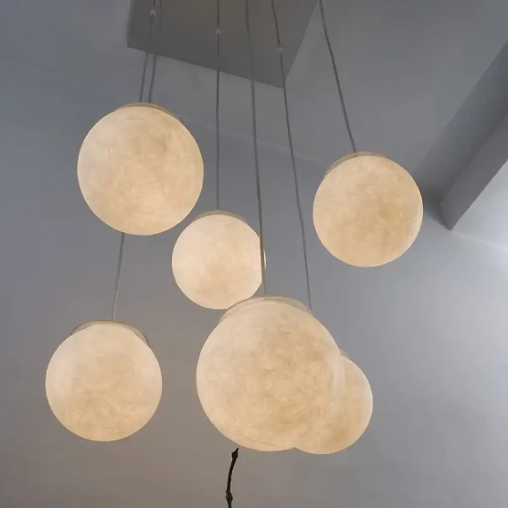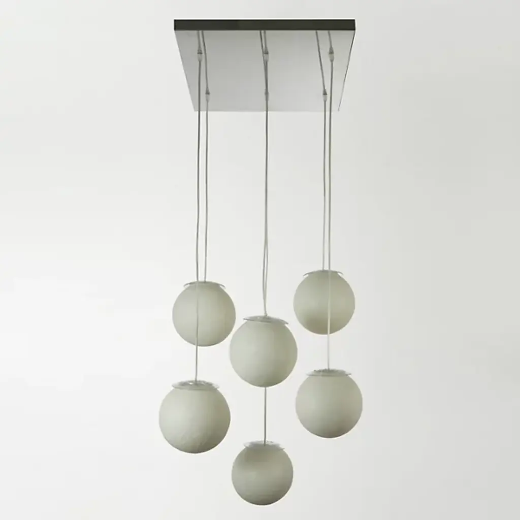 Captivating and enchanting, the Sei Lune Pendant Light is inspired by the great mysteries of the moon. The six globe-shaped shades of this modern multipoint pendant light are made from nebulite, which is a combination of resin and fiberglass, and mimic the uneven, softly luminescent qualities of the moon's surface. Each shade is suspended by a single cable from a square canopy. Just like the light the moon casts at night, the Sei Lune Pendant Light provides a warm, diffused, ambient light that is perfect in both residential and commercial spaces.