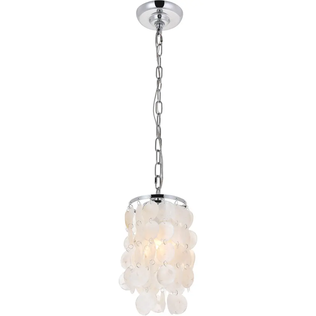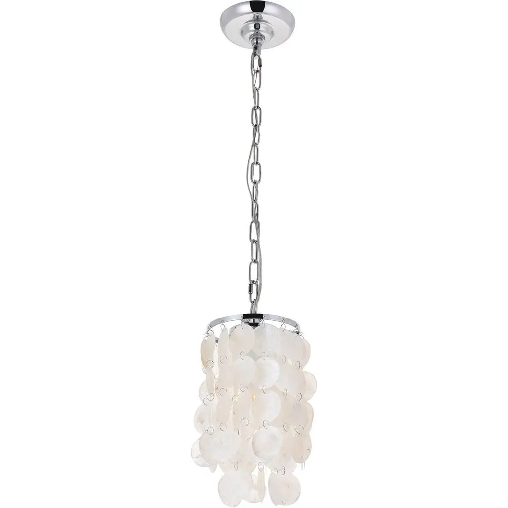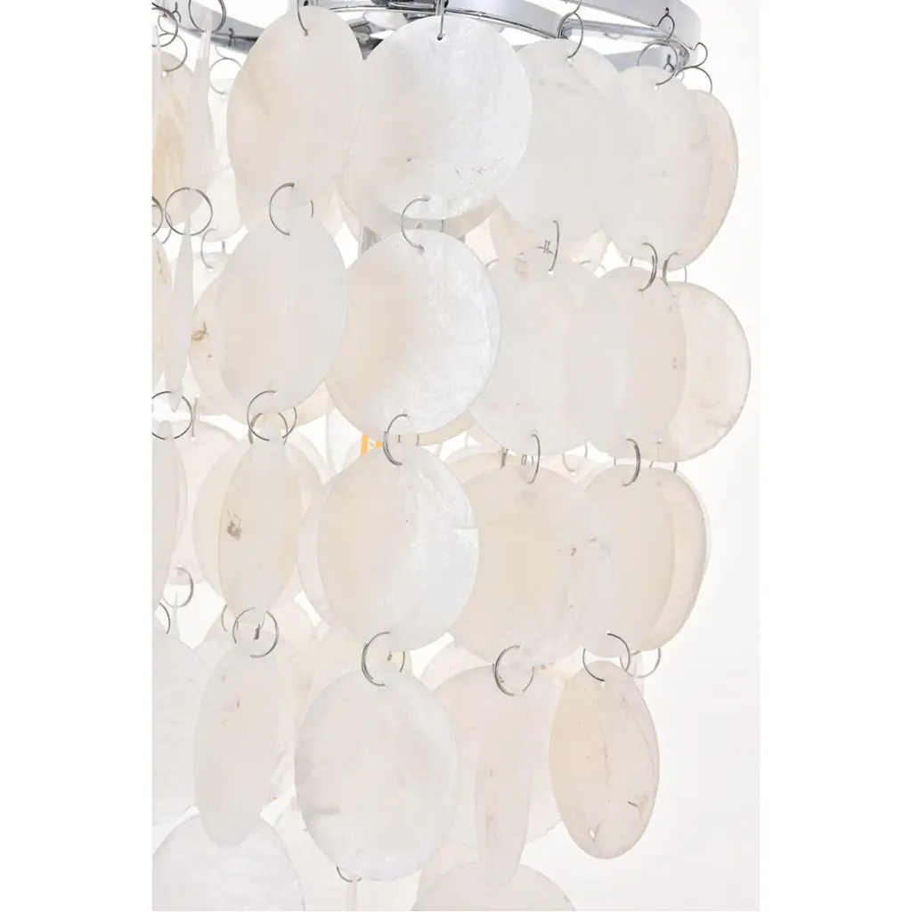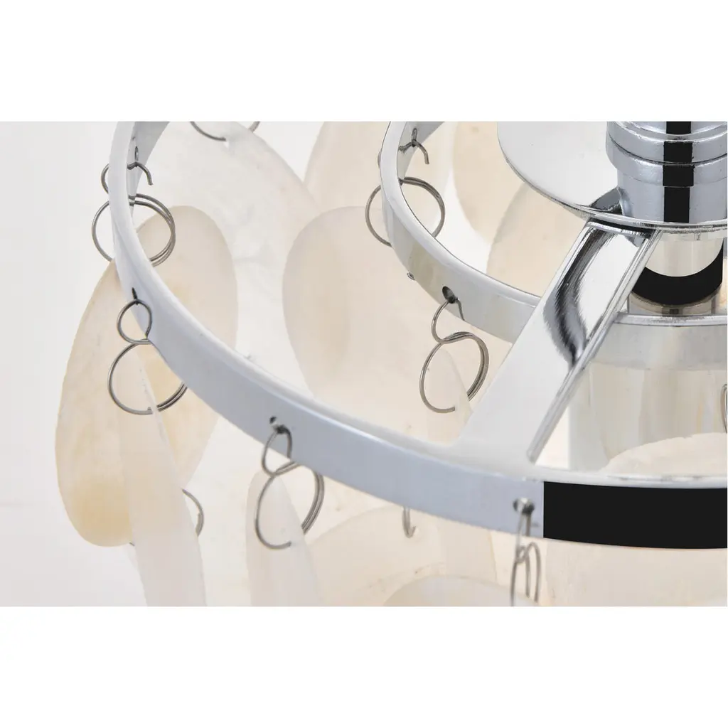The gentleness of the Selene collection pendant lamp in a chrome finish elicits the calm temperament of the moon and the coy-- yet soothing, light it emits. Weaving through the myriad of the draped shell curtains, the illumination creates a new design every time, whether it is the shadows and highlights that changes with the direction of the light, just as the moon goes through its phases, or the shadows casted with every slight movement of the white shells. A wonderful addition to any home--foyer, living room, or a child's room.