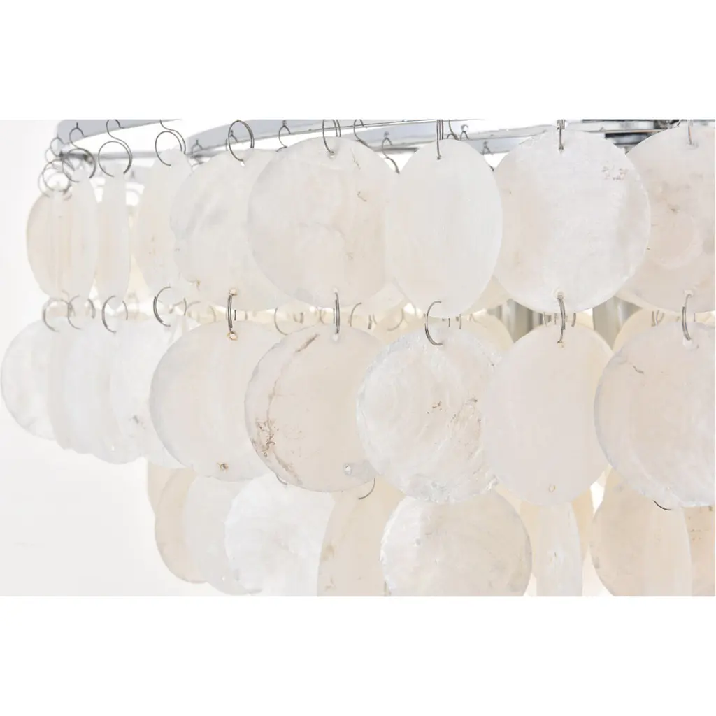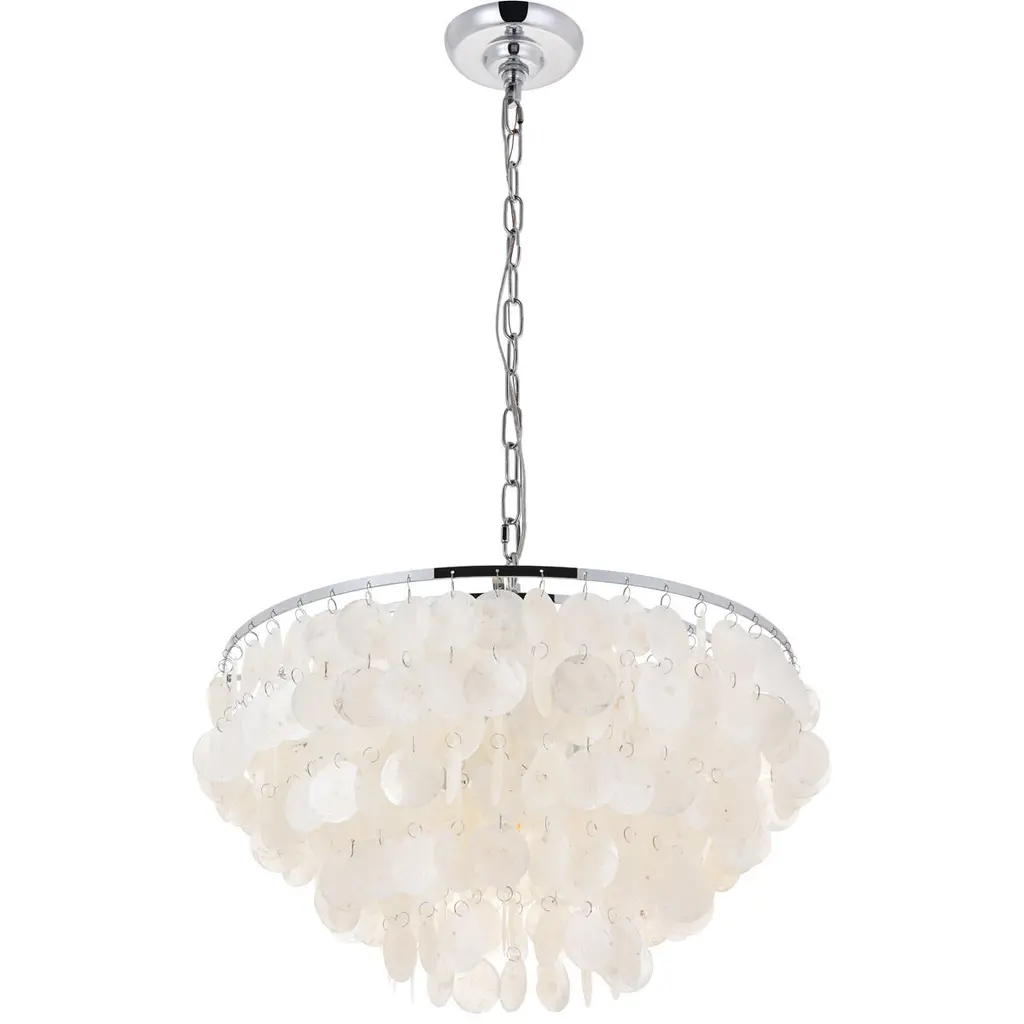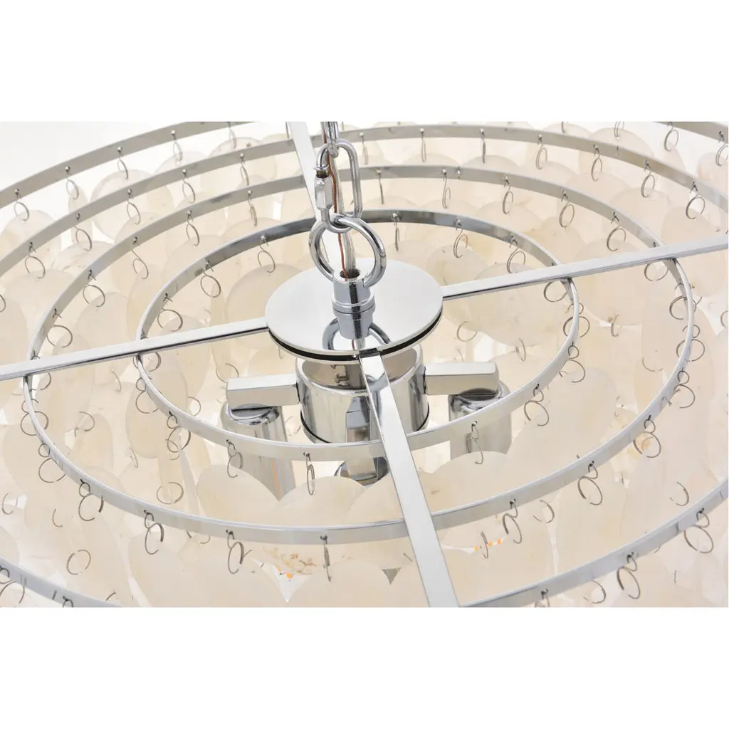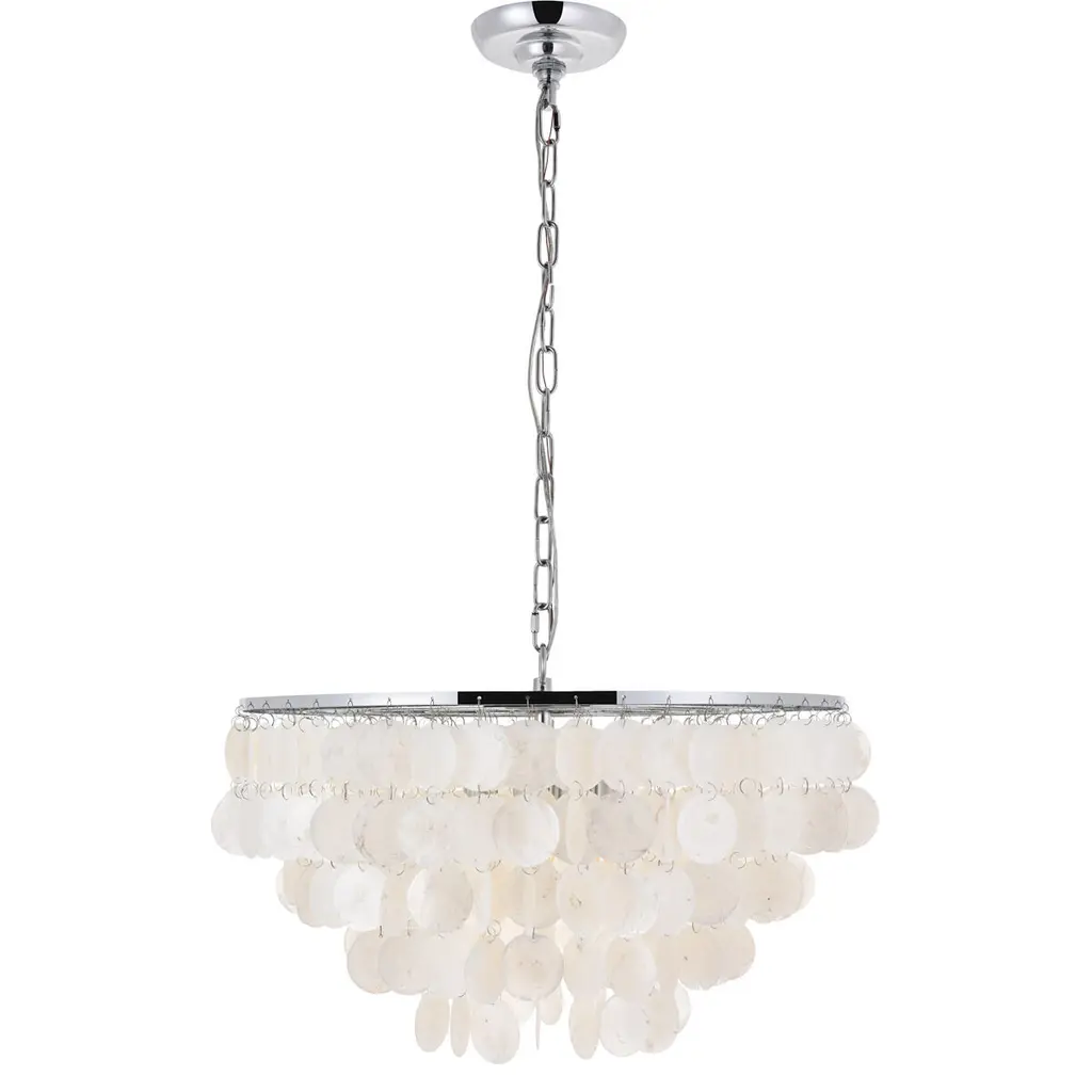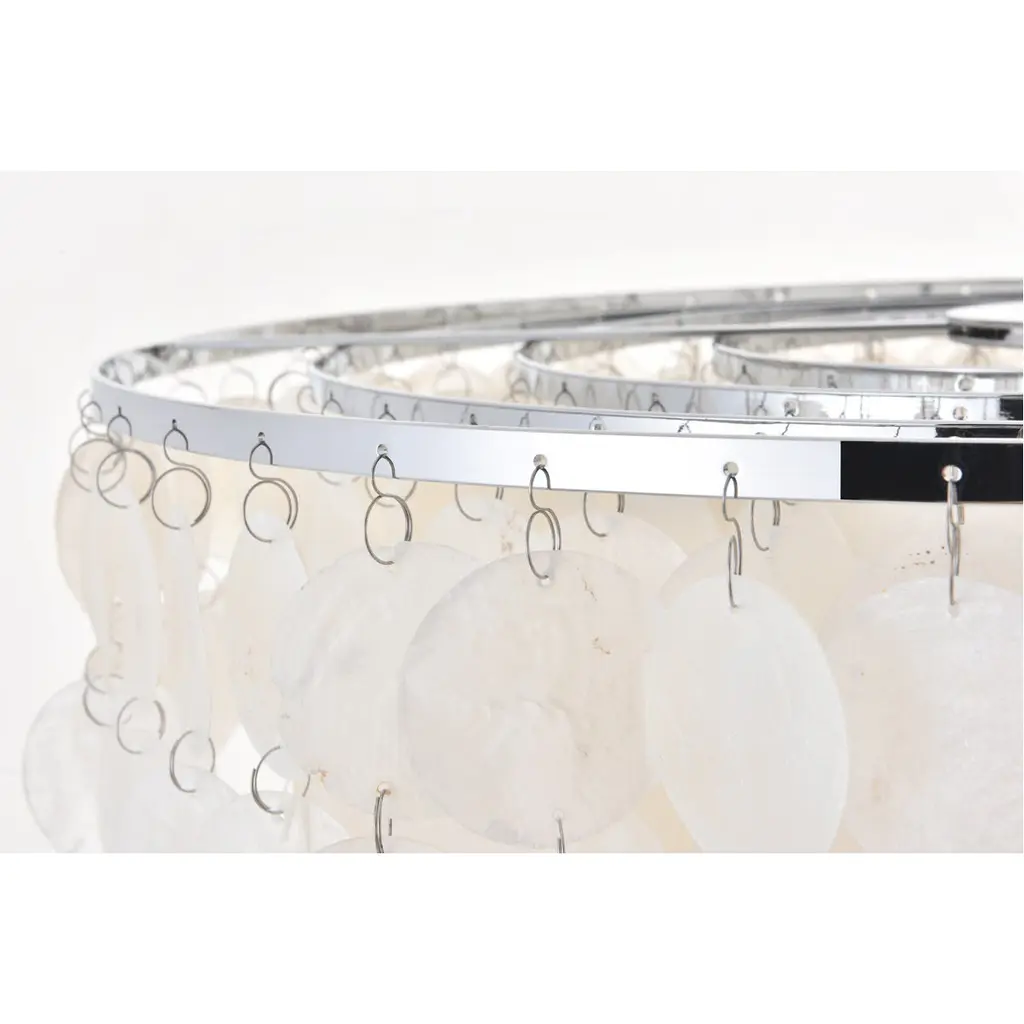 The gentleness of the Selene collection pendant lamp in a chrome finish elicits the calm temperament of the moon and the coy-- yet soothing, light it emits. Weaving through the myriad of the draped shell curtains, the illumination creates a new design every time, whether it is the shadows and highlights that changes with the direction of the light, just as the moon goes through its phases, or the shadows casted with every slight movement of the white shells. A wonderful addition to any home--foyer, living room, or a child's room.