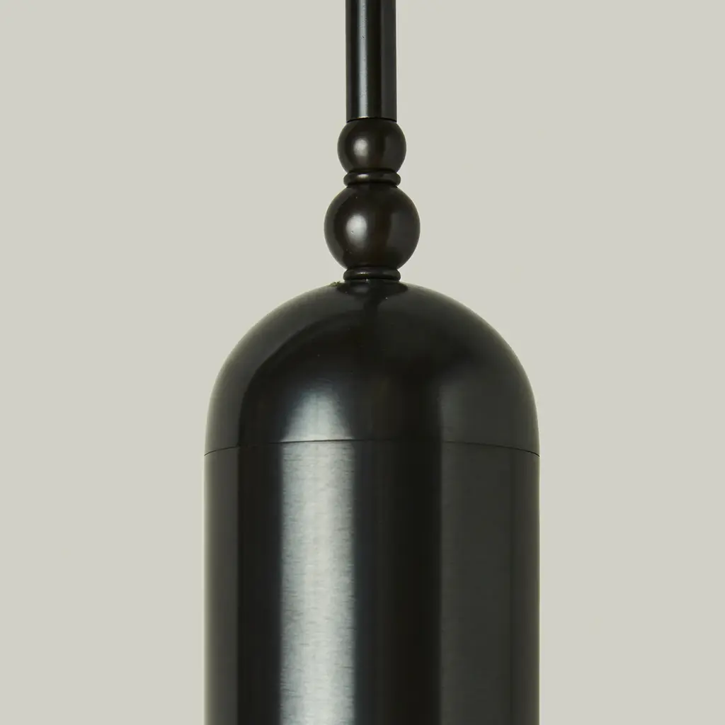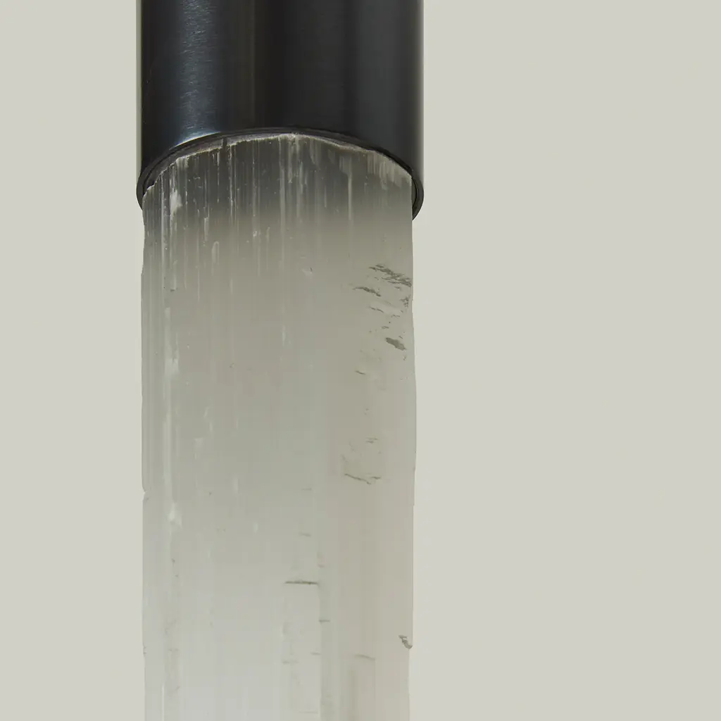 The Selene range results from our project to combine light with a particular apotropaic stone - Selenite: a chalky mineral with defined and irregular striations along its length. Light passing through it highlights surface irregularities and exits from the opposite end. The main feature of the Selene pendant is its hand-sculpted cylindrical diffuser with rounded ends, illuminated from one end. It is complemented by a bronze support echoing the diffuser's shape. Due to the inherent variations in the natural materials used during the manufacturing process, each product may differ slightly. These differences are not to be considered flaws but rather a reflection of the product's unique, handcrafted nature. Max Overall Height 100cm. Canopy diam 10cm (available on request for American j-box canopy with larger dimensions).