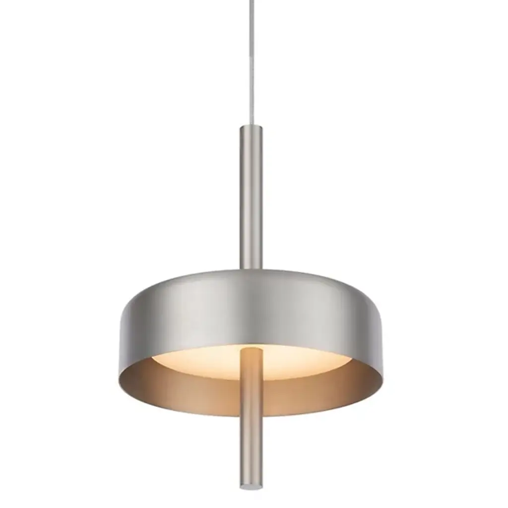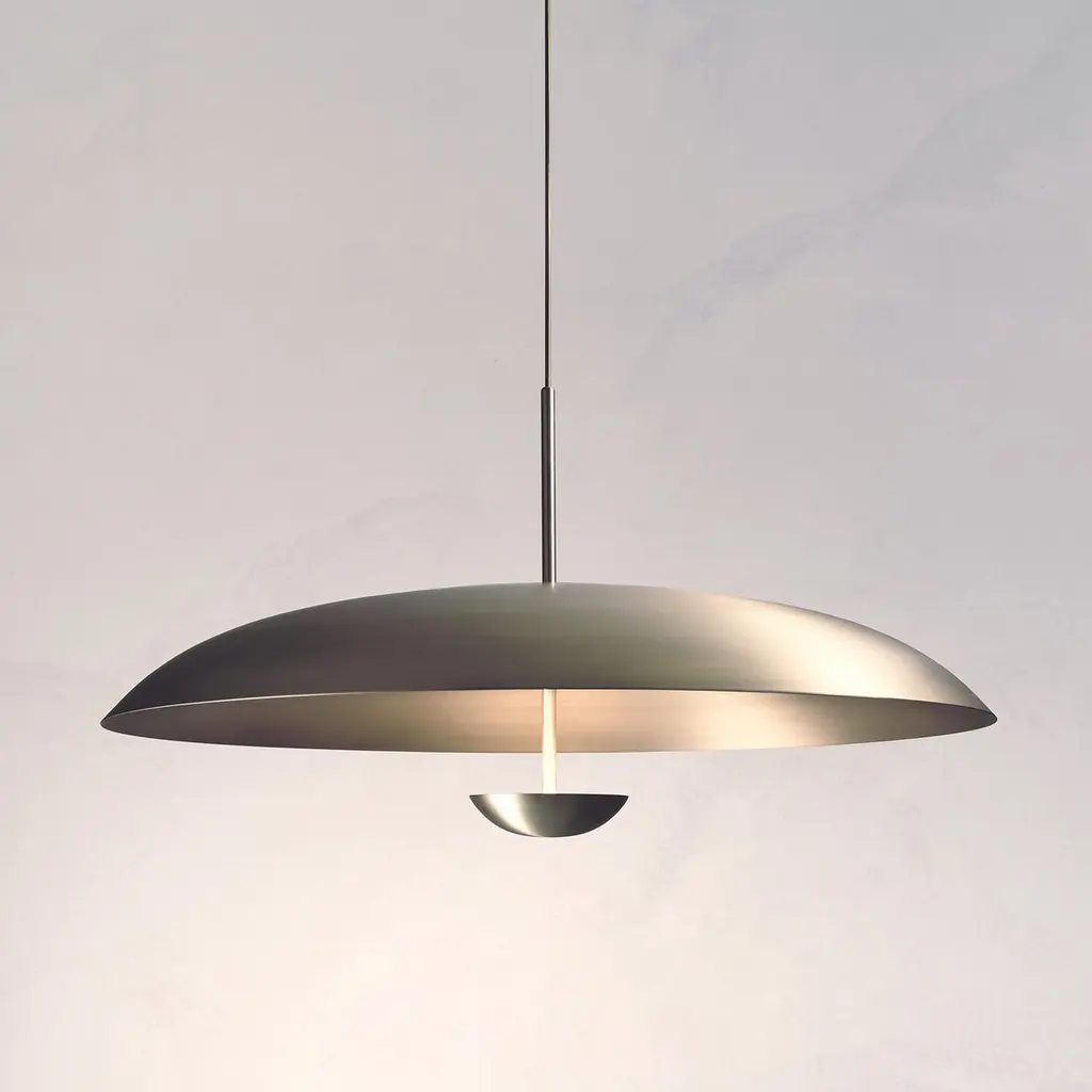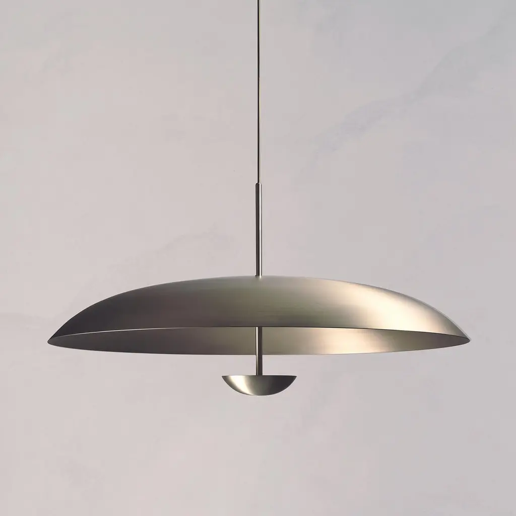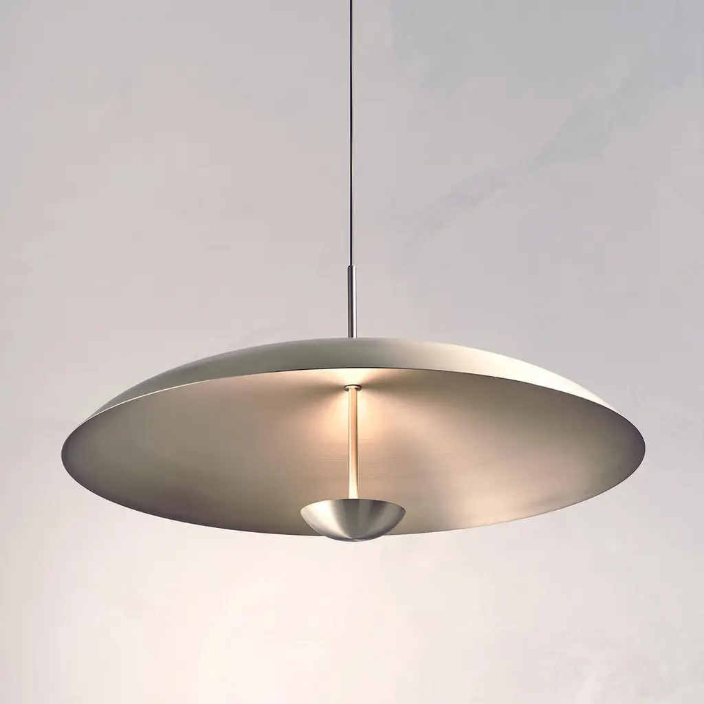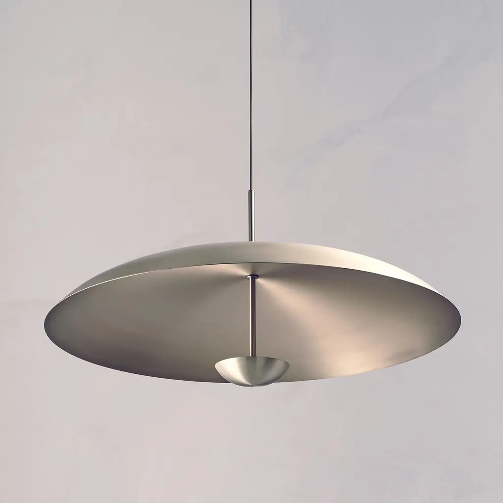 Inspired by planet-like shapes and textures, the Cosmic collection plays with both metal properties and a selection of patina finishes. Composed with two carefully hand-spun steel plates, the Seleno Pendant preserves the beautiful texture and quality of steel. Light is projected into the shade before reflecting out, illuminating without creating a glare. Softly illuminated with integrated LED from within, this sculptural ceiling piece sits elegantly in both contemporary and vintage-inspired interiors.Dimensions: Dia. 70cm (27.5”), height 42cm (16.5”)Materials:Shade Brushed SteelFramework Brushed NickelIllumination:Integrated LED (No bulb required)LED colour temperature 2700KLED dimmable driverOutput 700mA 17W 1500lmInput 120/240V50,000 hours rated lifeCeiling mounted.Driver to be integrated into ceiling. Suspension cable 3m (118") to be cut to size. All components supplied.Region:CE certified; UL listing available at a surcharge.