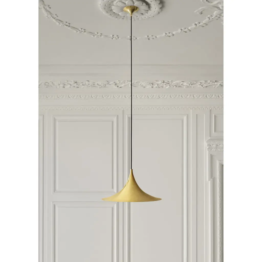 The Semi pendant lamp by GUBI charms with its 18.5 in (47 cm) wide, trumpet-shaped silhouette. The unique shape of the Semi lamp gives a wide spread of the light around the room. The Semi pendant lamp was designed by designer duo Bonderup & Thorup, and it is available in various finished from classic matt tones to shiny metal and colorful glossy shades. In a larger space, you can also create a unique cluster by combining several Semi pendants together.