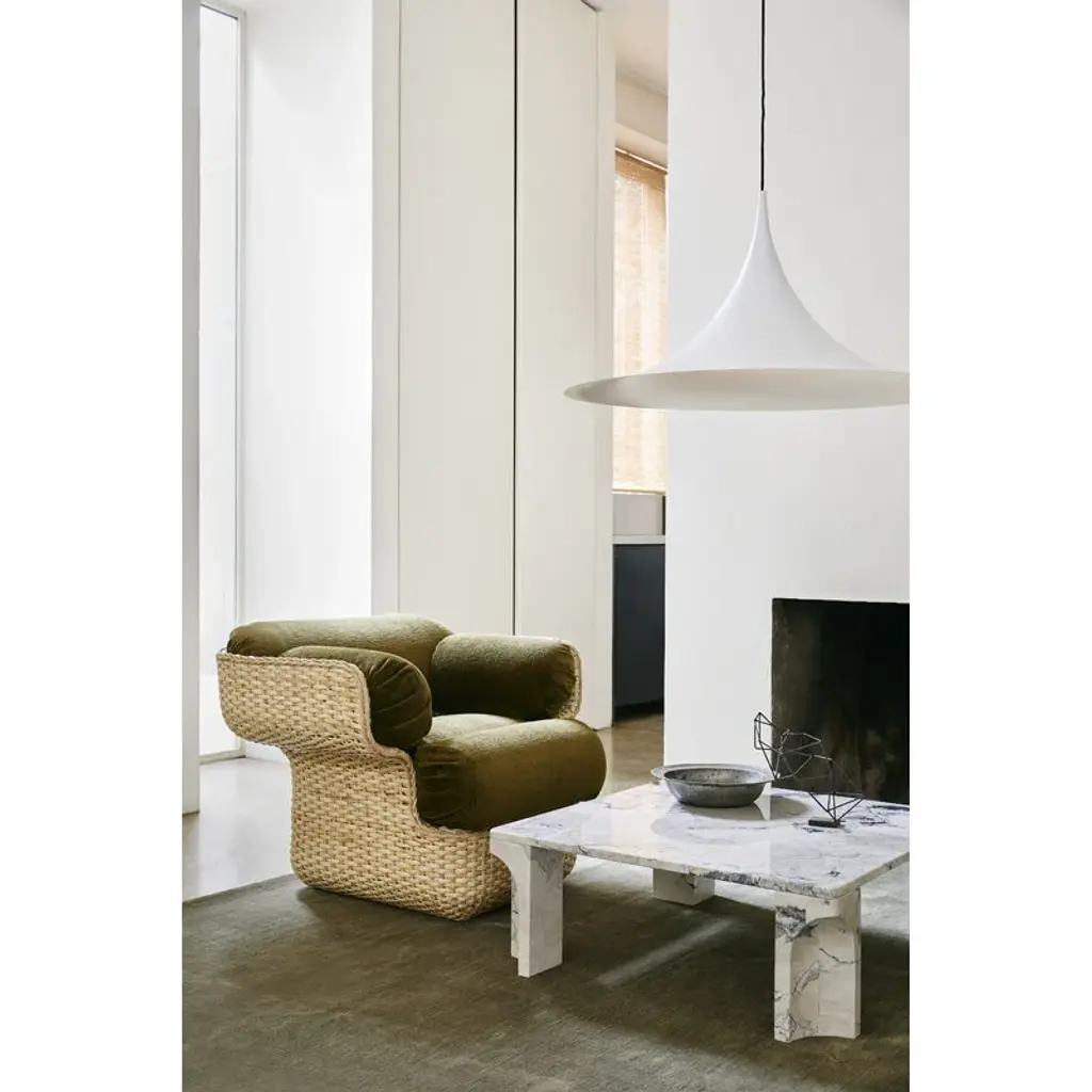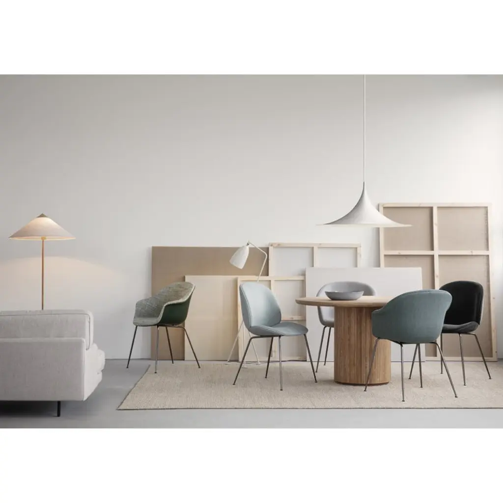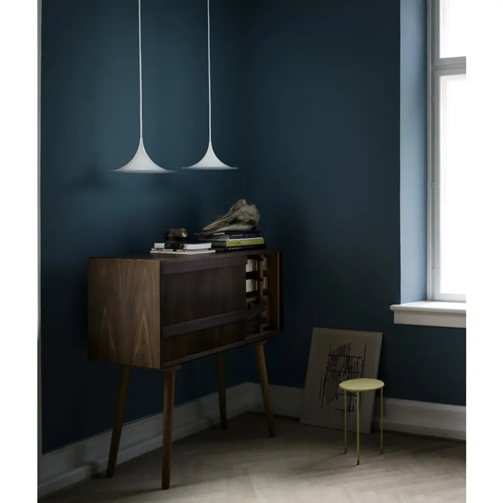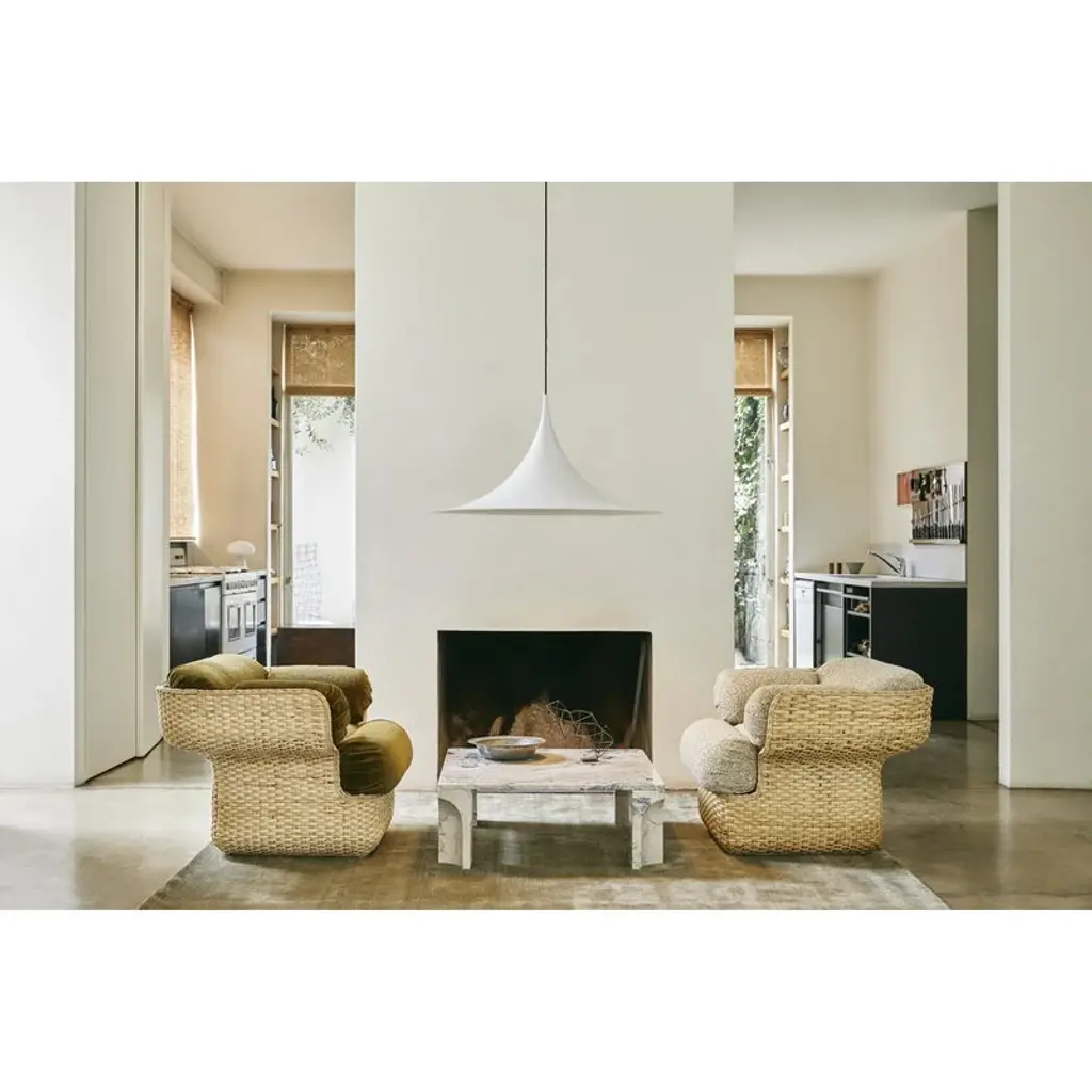The Semi pendant lamp by GUBI charms with its 23.62 in (60 cm) wide, trumpet-shaped silhouette. The unique shape of the Semi lamp gives a wide spread of the light around the room. The Semi pendant lamp was designed by designer duo Bonderup & Thorup, and it is available in various finished from classic matt tones to shiny metal and colorful glossy shades. In a larger space, you can also create a unique cluster by combining several Semi pendants together.