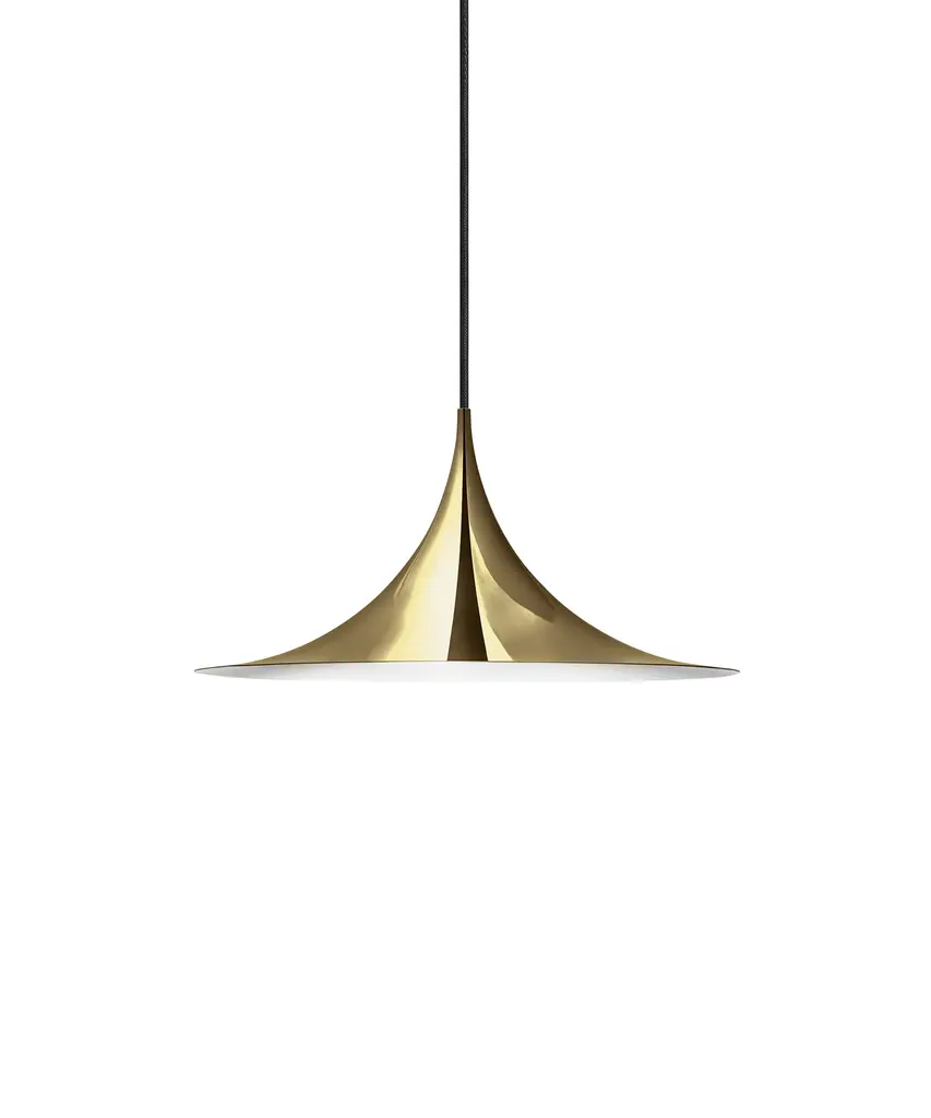 An icon of Danish modernism, this lamp was first produced in 1968. The Semi Pendant was designed in 1968 as a product of the partnership between the two architects, Claus Bonderup and Torsten Thorup. Semi's distinctive arch-shaped shade is derived from the negative space formed by two touching circles. This elegant pendant achieved great success in the 1980's and became, at that time, the world-wide best-selling Danish design. The lacquered, hand-spun Aluminum shade creates a diffused, cone-shaped light - perfect over a dining table or kitchen. Available in three sizes - Small (11"D), Medium (18.5"D) and Large (23.6"D) - and in a variety of colors. Ceiling canopy included. Produced in Denmark by Gubi - a Copenhagen-based purveyor of historic and contemporary designs. A certified authentic design, produced to the designers' original specifications.