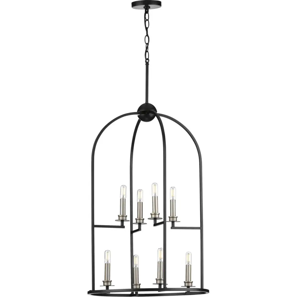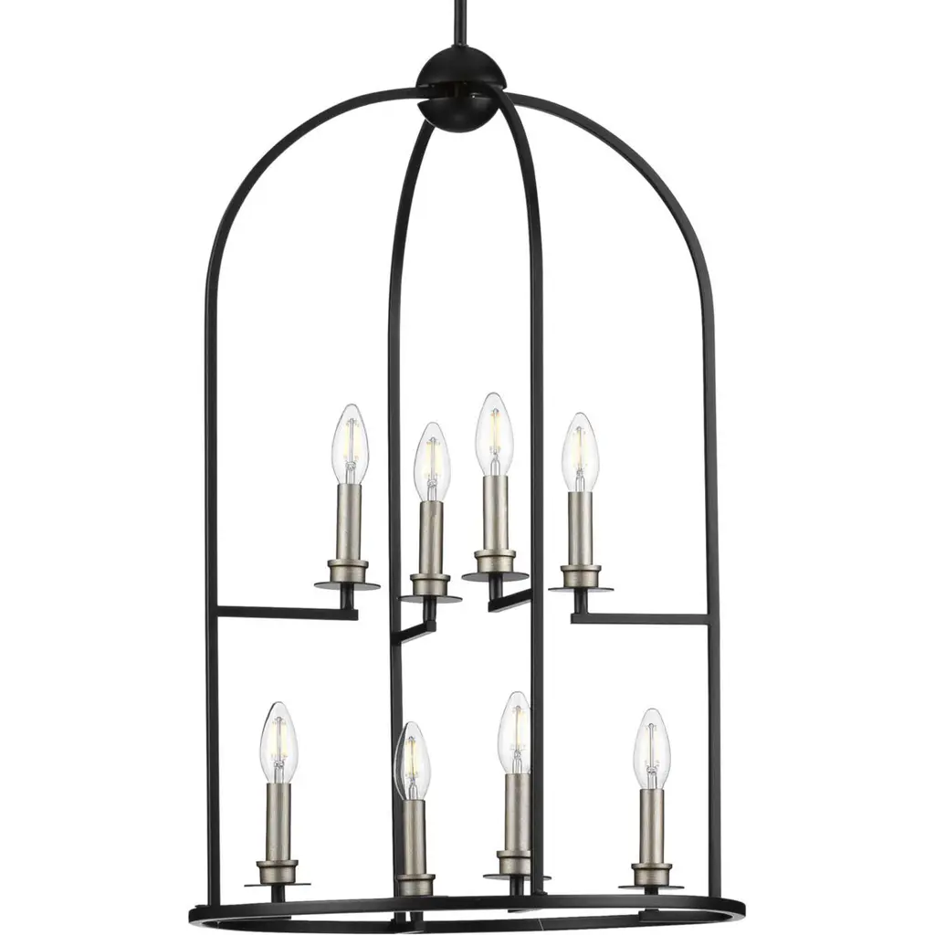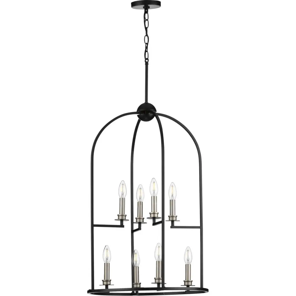 Cultivate an extraordinary lighting experience with the Seneca eight-light foyer. Cascading down from the simple, black orb crowning the fixture’s top are four, sleek, Black-finished arms that create a grand, open-cage design. Within the airy frame are eight elegant candelabra lights layered in two tiers to provide the ultimate illumination for a welcoming entryway or over a dining room table kitchen island in modern farmhouse and luxe settings.