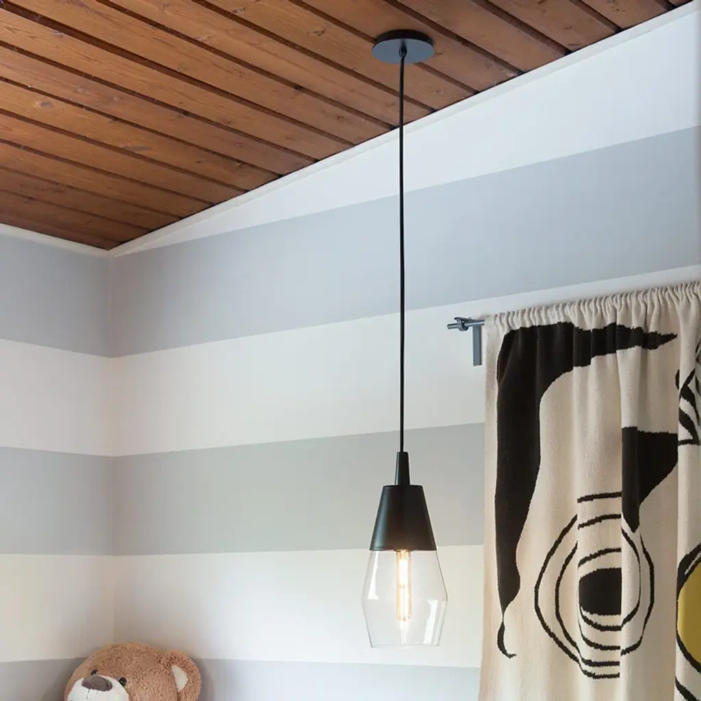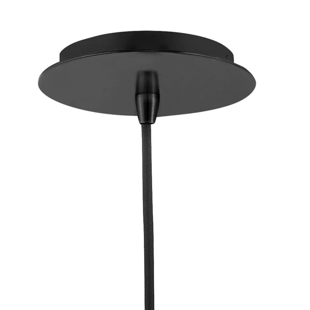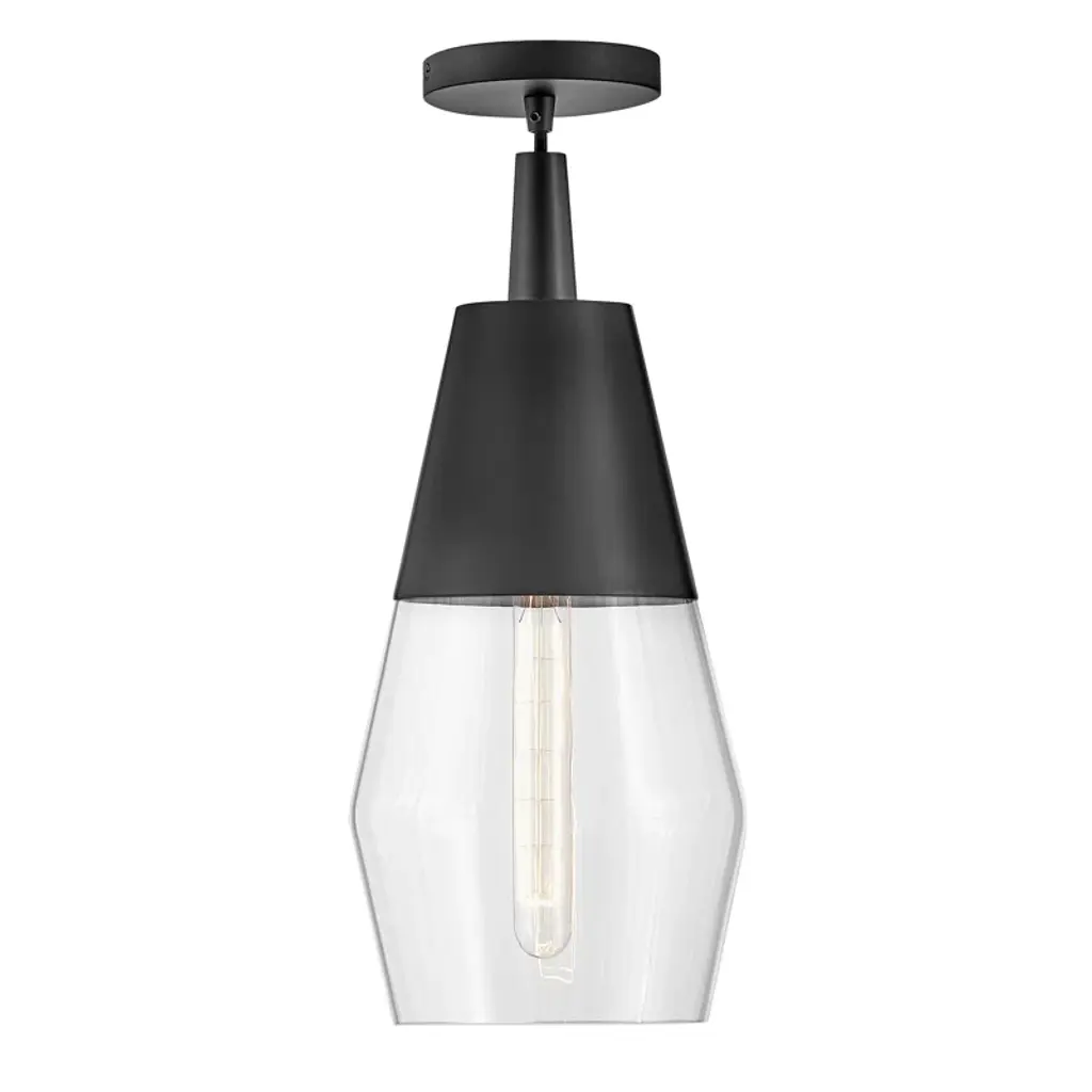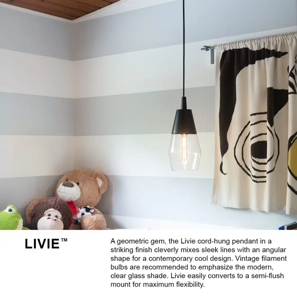 A geometric gem cleverly mixes sleek lines with an angular shape for a contemporary cool pendant that makes itself at home anywhere. Clear glass units with a spun-metal cap and matching canopy in striking black or luxe lacquered brass finish options to boldly underscore the modern edge.