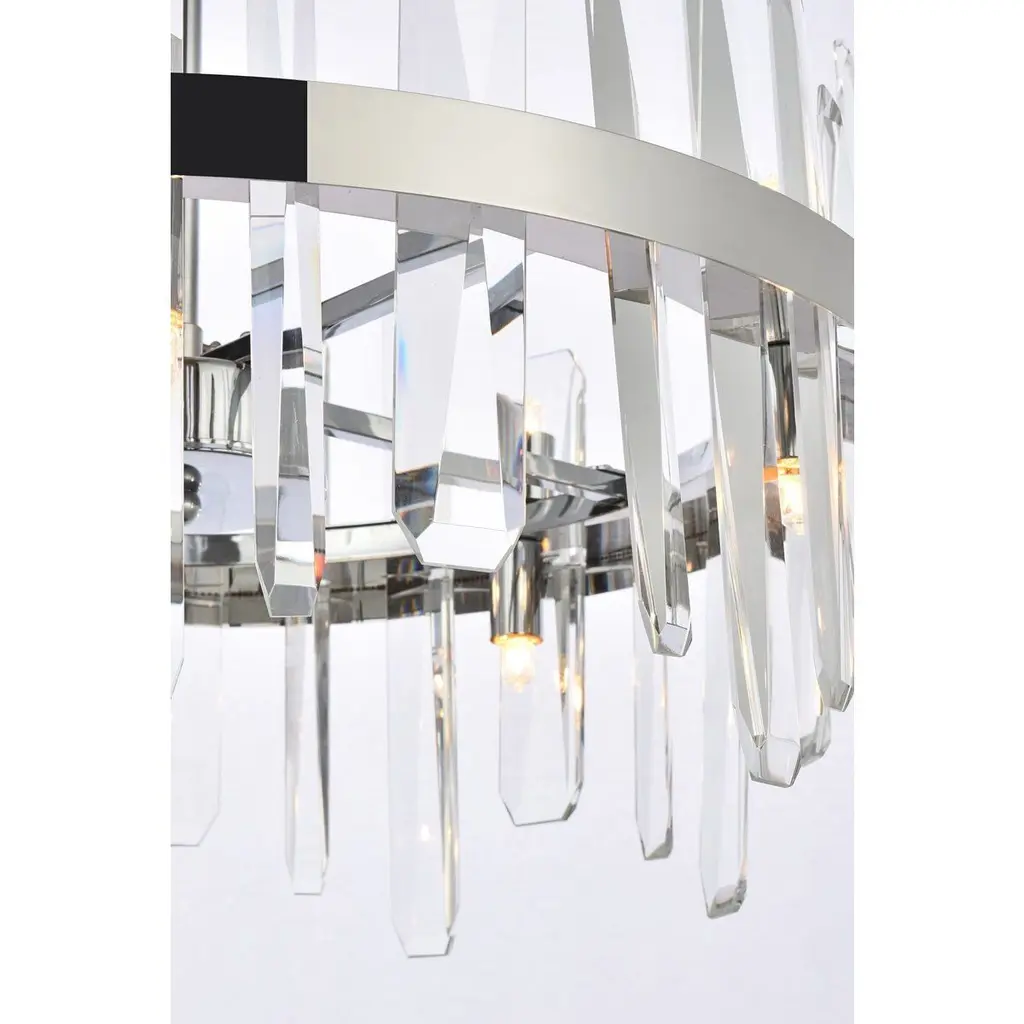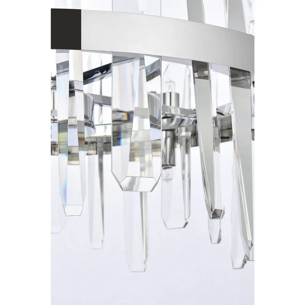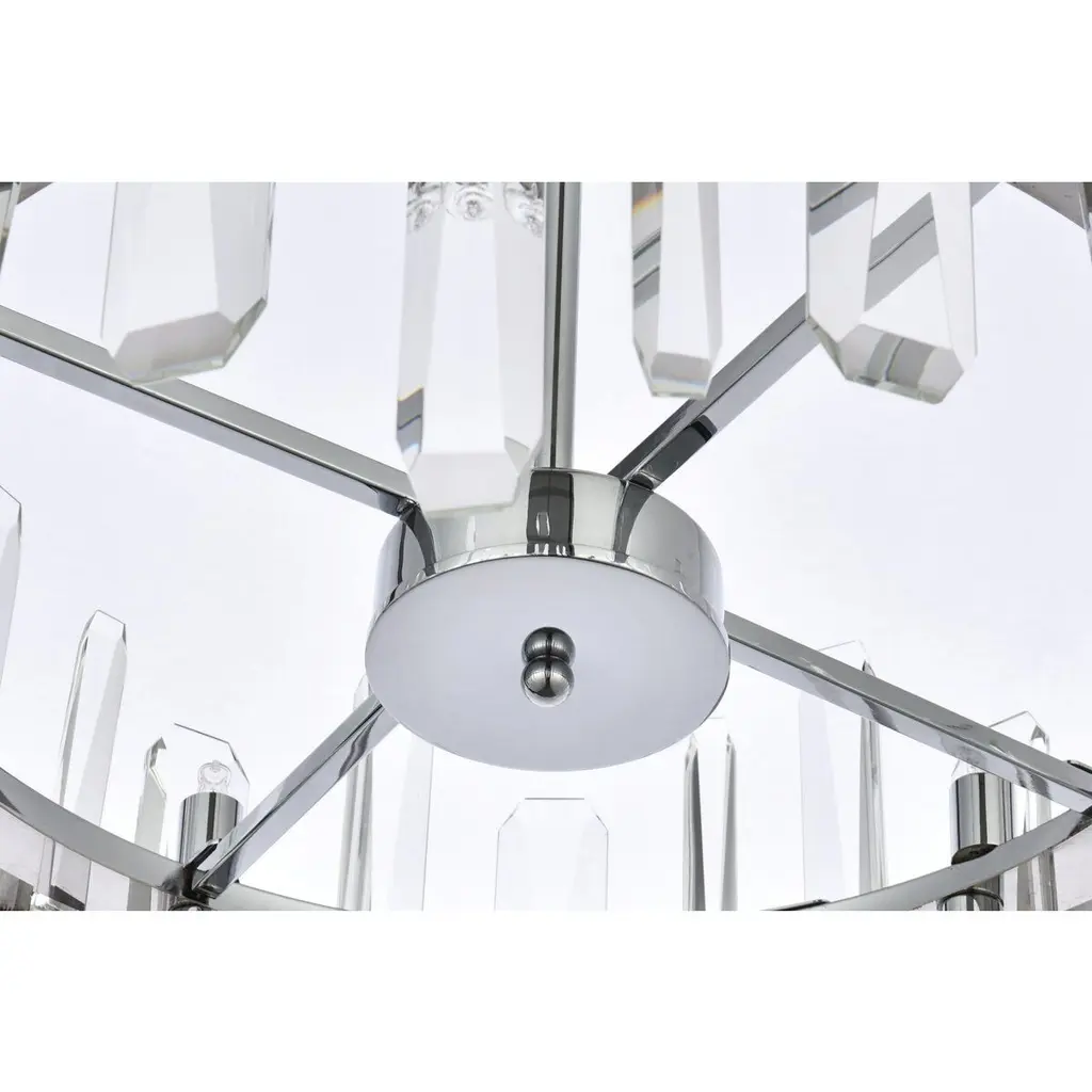 Modern crystal chandelier features top and bottom tier crystal prisms staggered along the wrought iron frame. The thick metal frame wraps around top grade crystal prisms ensure it is built to last, definitely worth it. Hang this work of art and dim the lights for a bit of sophisticated lighting in your home. Get lost in a beautiful light and sleek design available in multiple finishes. The hanging rod conveniently comes with a slope ceiling adapter, perfect for your vaulted or angled ceiling.