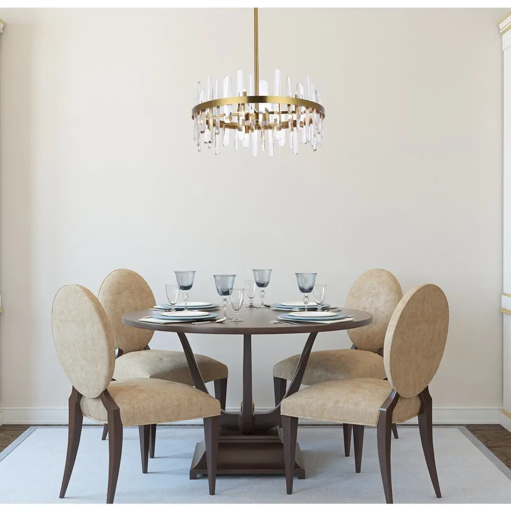 Modern crystal chandelier features top and bottom tier crystal prisms staggered along the wrought iron frame. The thick metal frame wraps around top grade crystal prisms ensure it is built to last, definitely worth it. Hang this work of art and dim the lights for a bit of sophisticated lighting in your home. Get lost in a beautiful light and sleek design available in multiple finishes. The hanging rod conveniently comes with a slope ceiling adapter, perfect for your vaulted or angled ceiling.