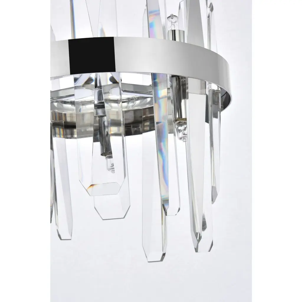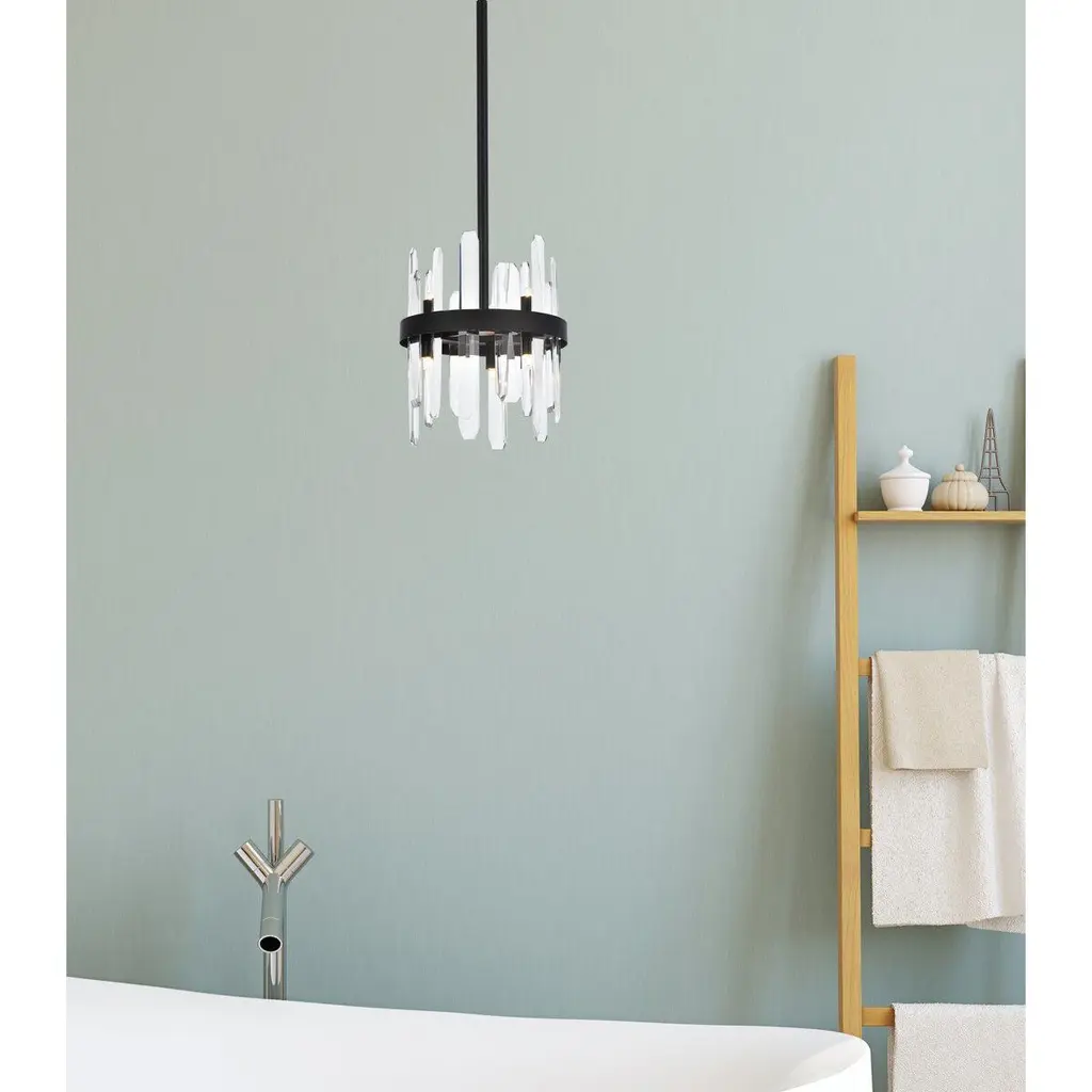 Modern crystal chandelier features top and bottom tier crystal prisms staggered along the wrought iron frame. The thick metal frame wraps around top grade crystal prisms ensure it is built to last, definitely worth it. Hang this work of art and dim the lights for a bit of sophisticated lighting in your home. Get lost in a beautiful light and sleek design available in multiple finishes. The hanging rod conveniently comes with a slope ceiling adapter, perfect for your vaulted or angled ceiling.