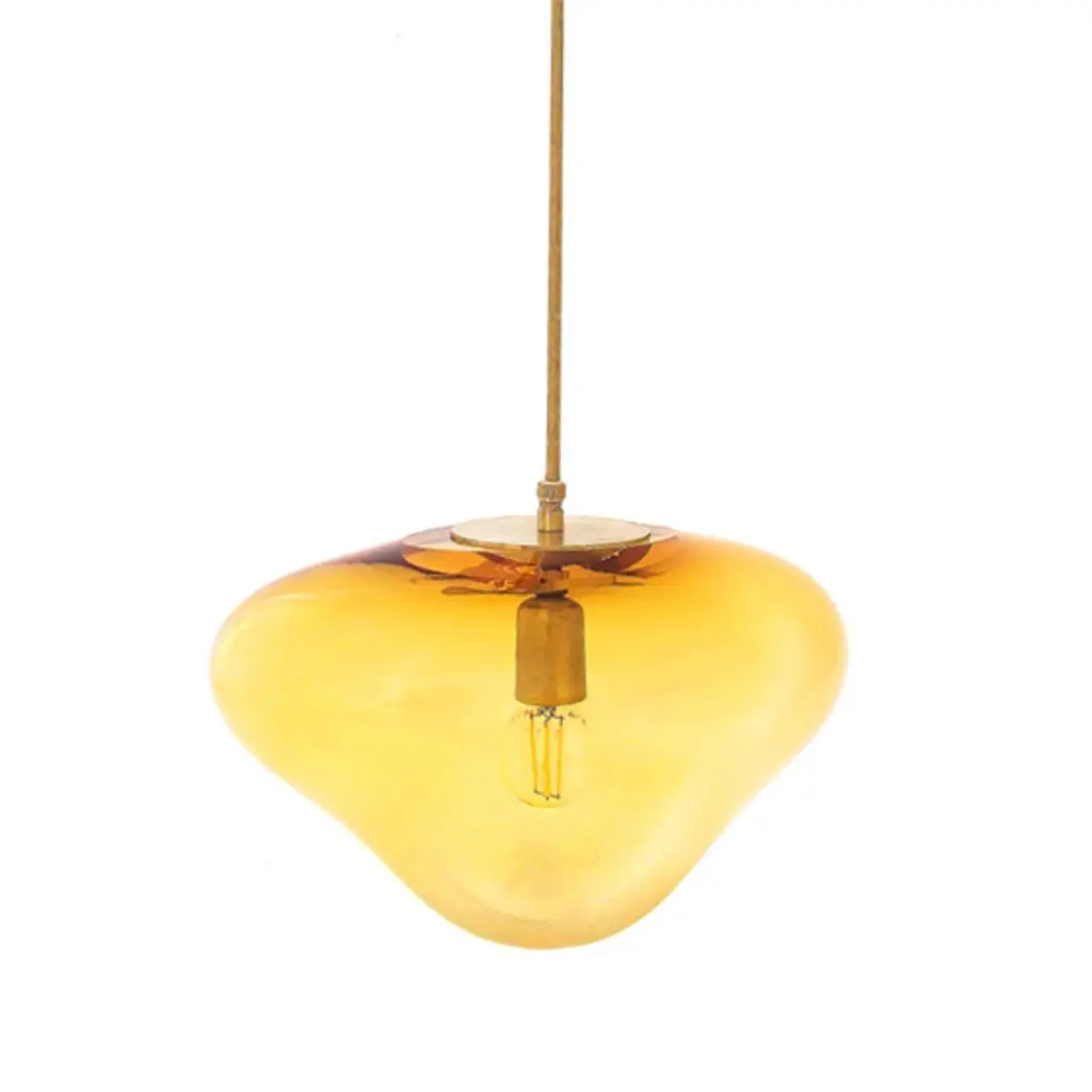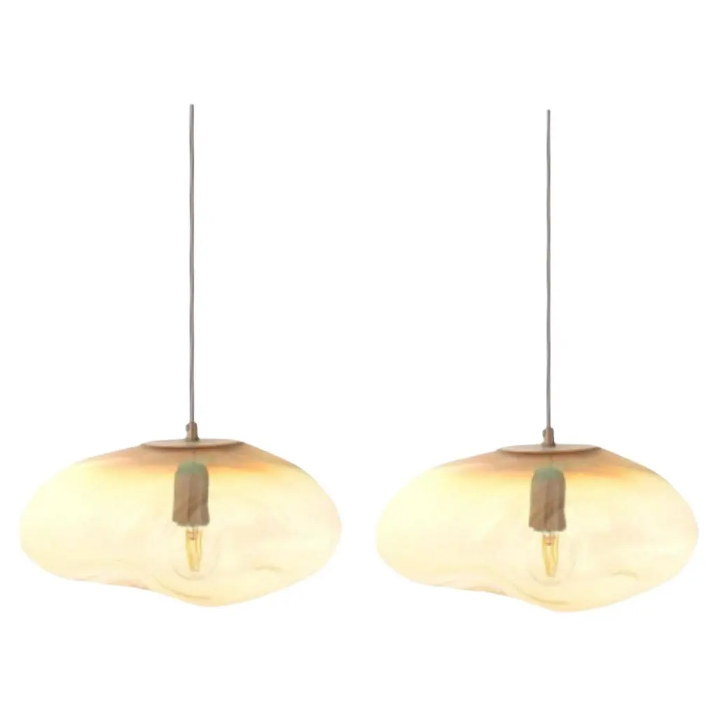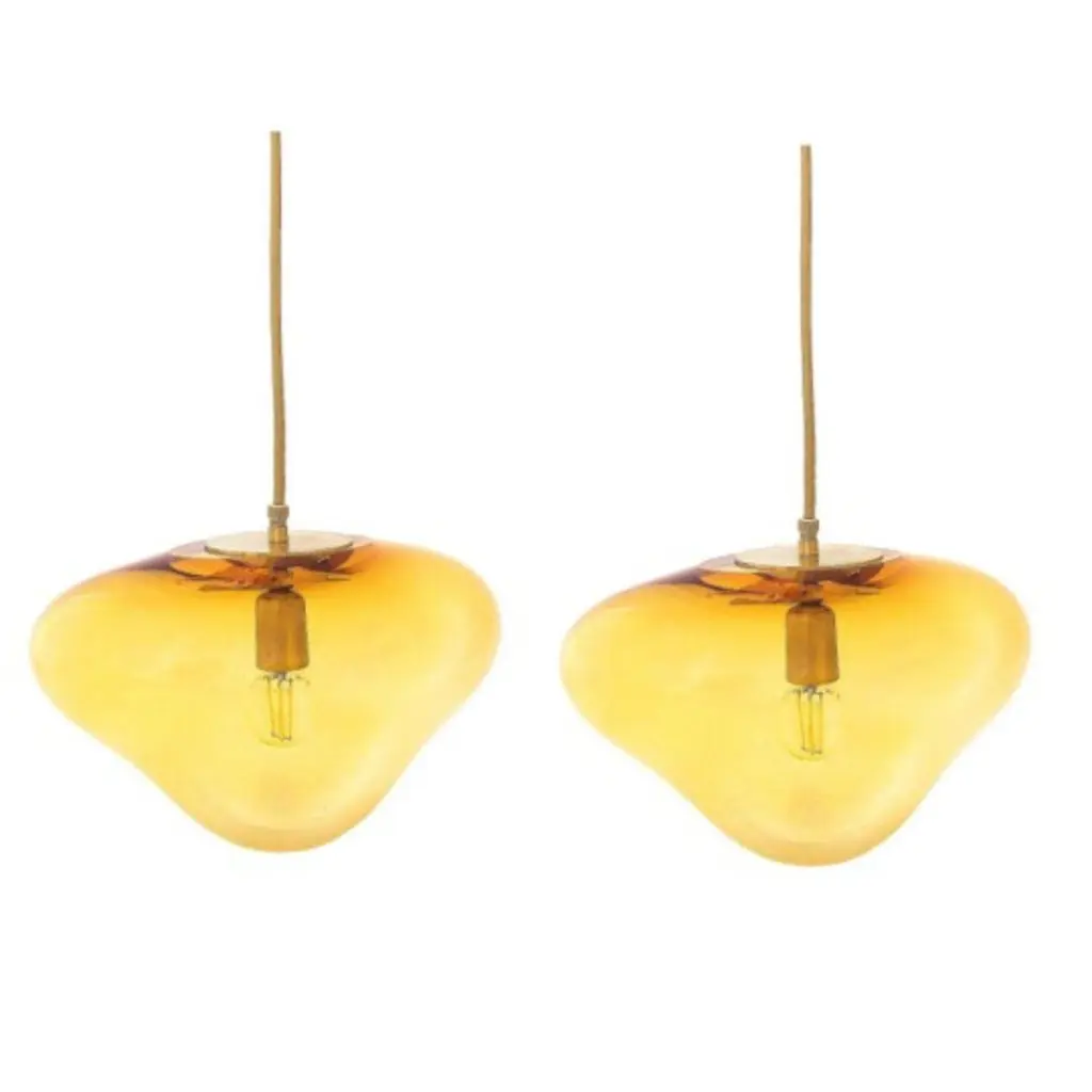 Set of 2 Planetoide Seresi gold pendants by Eloa.No UL listed Material: Glass, steel, silver, LED bulbDimensions: D 30 x W 30 x H 250 cmAlso available in different colours and dimensions.All our lamps can be wired according to each country. If sold to the USA it will be wired for the USA for instance.PLANETOIDS are small asymmetrical objects that float delicately in space. Combine their various forms and colors to custom design the celestial ambience of your room. PLANETOIDS are available as individuals or in trios, quartets, quintets, etc for creating infinite variations of your own, personal constellations.Light objects float weightlessly in space. Fragile, iridescent, timeless. Eloa is amodular lighting system composed of unique handcrafted glass pieces. Select from a variety of hand-blown forms, which are one of a kindin shape, size andcolor - unique.Solitary or in constellation, the Eloa lights create individual light concepts andassociate with star constellations. Each glass piece is named after a star or a planet.They exist as hanging, floor, standing and wall luminaries.Eloa combines the craft of ancient glassblowing with a simple, yet distinct design.In order to achieve the large size of the glass objects and working without forms, it takes a high level of refined craftsmanship and skill performed by only a few master glassblowers.