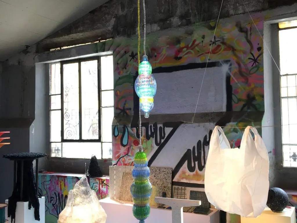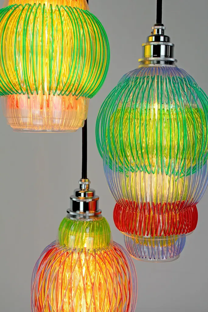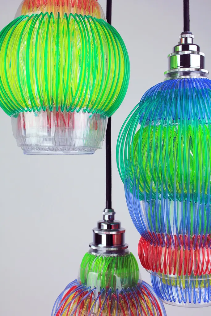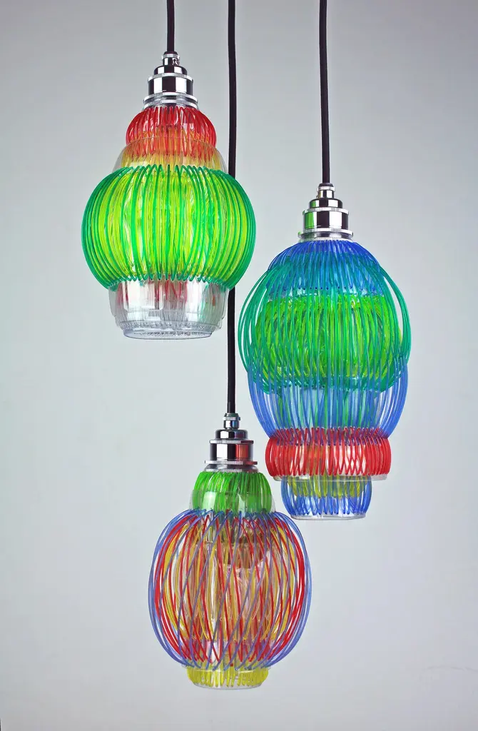 Set of 3 Lluvia pendant lamps by Anabella GeorgiDimensions: Lamp 1: Diameter 30 x Height 14 cm Lamp 2: Diameter 26 x Height 14 cm Lamp 3: 25 x H 15 cm Materials: Recyclable Pet plastic bottles woven with rPET filament for 3D printers, Led Bulb.Technique: 3D printed, Hand-Woven. Available in more colors and designs. Also sold in individual pieces. All our lamps can be wired according to each country. If sold to the USA it will be wired for the USA for instance.This luminaire is inspired by rain as a life-creating force. Based on 'conscious design' it helps to prolong the life of waste material. It transforms the PET plastic bottle adding beauty and functionality. Each piece is made of PET bottle parts woven with rPET Filament. Handmade/unique pieces design with reuse and recycle material.Anabella Georgi is a Venezuelan Designer based in Berlin. Being born and raised in Venezuela has had a lot of influence on her designs. From the country’s Indigenous crafts to its Kinetic Art. Her passion for simple shapes, vivid colors, and graphic rhythms opens the path to creating her own language. Her designs have their own identity, displaying the joy, dynamism, contrast, diversity, light, and rhythms of the Latin American culture. She works with artisans in search of new possibilities of the different materials and techniques and looks for new ways to revive them into unique textures and fabric. Her creations have been part of exhibitions in Europe, Latin America, and the United States.