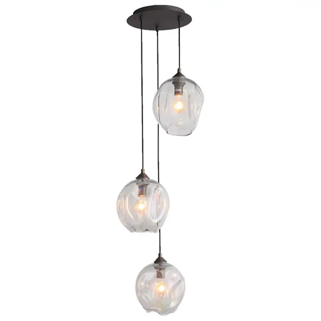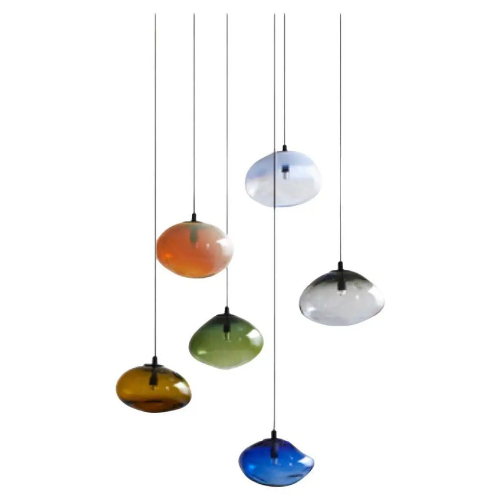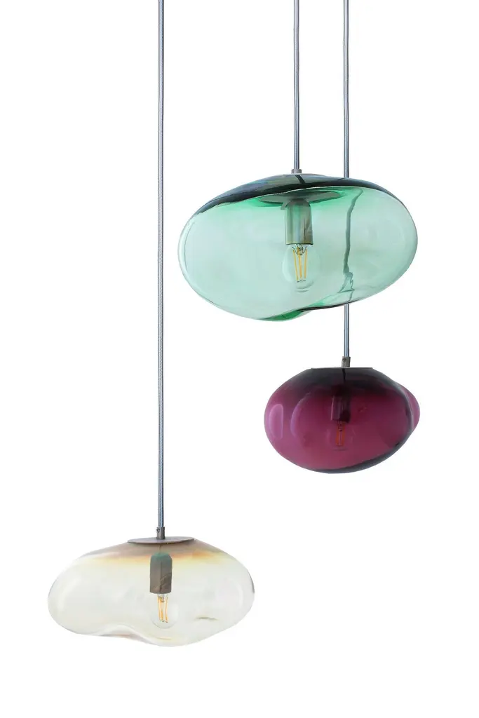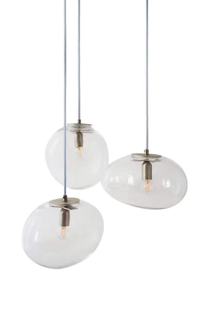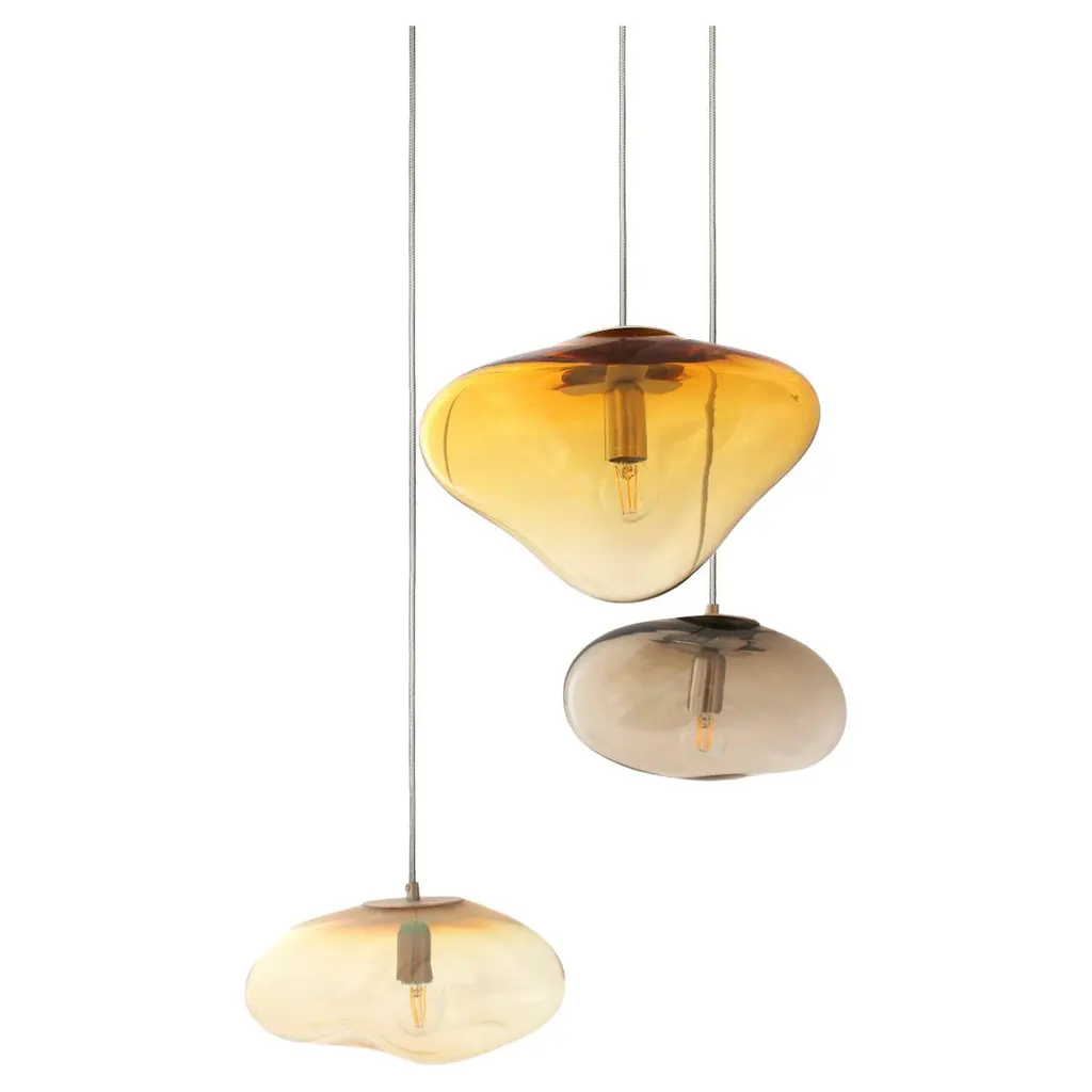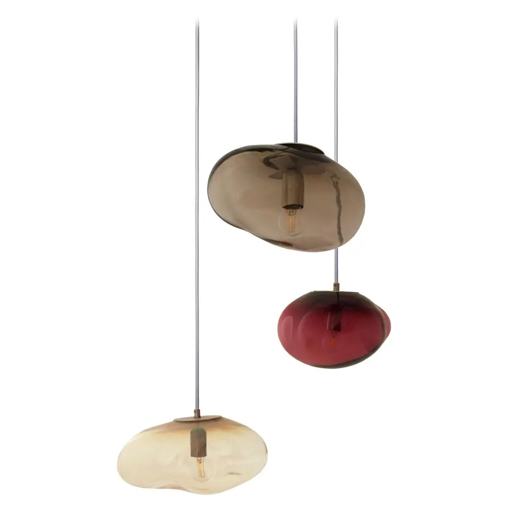 Set of 3 Planetoide pendants by ELOANo UL listed Material: glass, steel, silver, LED bulbDimensions: D 30 x W 30 x H 250 cmAlso available in different colours and dimensions.Canopy (D 35cm) available in brushed chrome steel, gold finish, brushed brass, and black.All our lamps can be wired according to each country. If sold to the USA it will be wired for the USA for instance.PLANETOIDS are small asymmetrical objects that float delicately in space. Combine their various forms and colors to custom design the celestial ambience of your room. PLANETOIDS are available as individuals or in trios, quartets, quintets, etc for creating infinite variations of your own, personal constellations.Light objects float weightlessly in space. Fragile, iridescent, timeless. ELOA is amodular lighting system composed of unique handcrafted glass pieces. Select from a variety of hand-blown forms, which are one of a kindin shape, size andcolor - unique.Solitary or in constellation, the ELOA lights create individual light concepts andassociate with star constellations. Each glass piece is named after a star or a planet.They exist as hanging, floor, standing and wall luminaries.ELOA combines the craft of ancient glassblowing with a simple, yet distinct design.In order to achieve the large size of the glass objects and working without forms, it takes a high level of refined craftsmanship and skill performed by only a few master glassblowers.