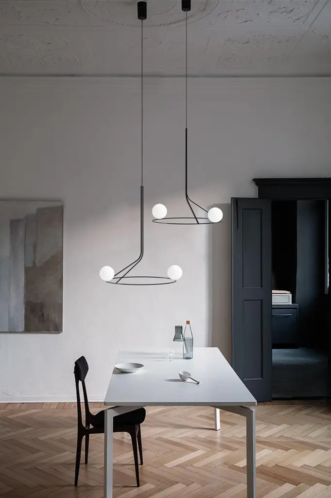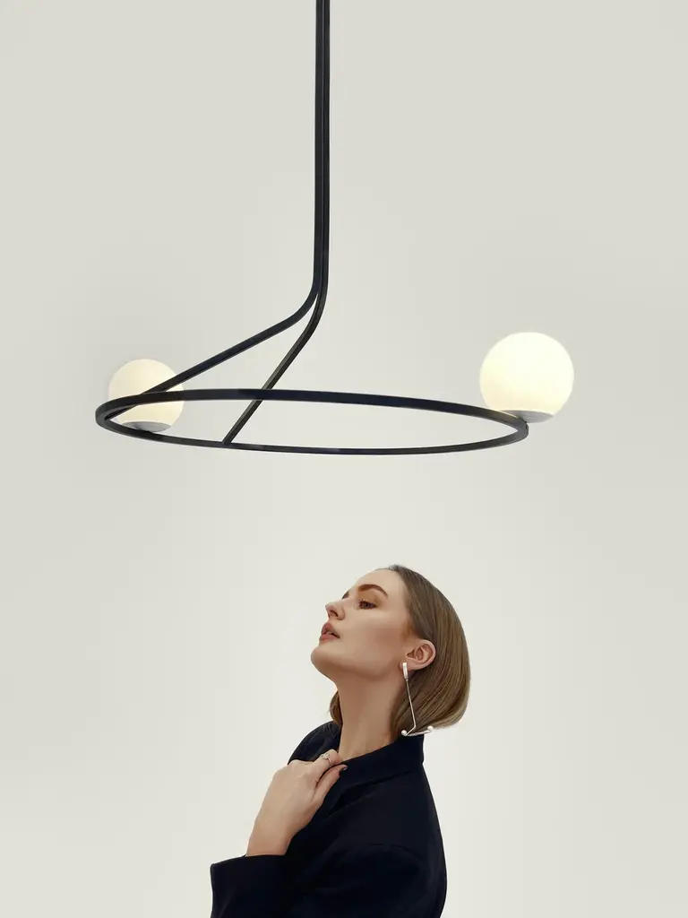 Na Linii lighting by SvitanokCategory: LightingType: Pendant, floor lampMaterial: Steel rods, frosted glass, textile cableOverall dimensions: pendant 730 x 550 mm / floor lamp 1450 x 550 mmLight source: G9, 110-220VAvailable in different colors according to RAL classic.This Ukrainian origin word "Na Linii” means “on the line”. It is a charismatic product that should not be perceived literally, but with a goal to distinguish the symbolism and image of the source.Pure geometric figures build the lighting fixture; rectangle lines and a circle at the top contain the glass light spot. The final result is a lightweight design out of metal and glass, a solid, gracefully sustainable material. The construction of the fixture is reduced to the essential minimum with its frame structure providing electricity without any visible cables. Some bends of metal are formed unplanned due to welding and high temperatures.Designed by Artem Zakharchenko-Halytskyi, “Na Linii” is a striking and sculptural lamp, notable for its distinctive sphere-shaped center. Its light sources seem to float in space weightlessly.