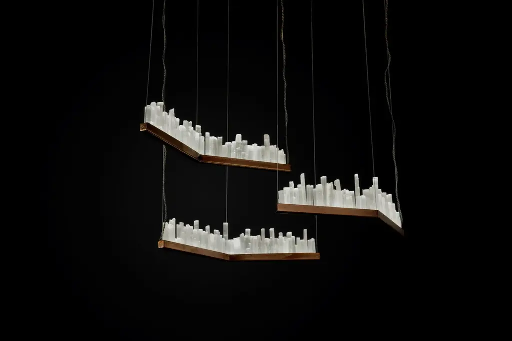 Set of white quartz pendant lamps by Aver Dimensions: 75cm x 20cm x H 18cm.Lighting: 1 LED 9W / 600 LumensFinish: Silver leaf, old silver leaf, gold leaf, old gold leaf, copper leaf, rusty, pink golf, brass.Rock crystal: white quartz.