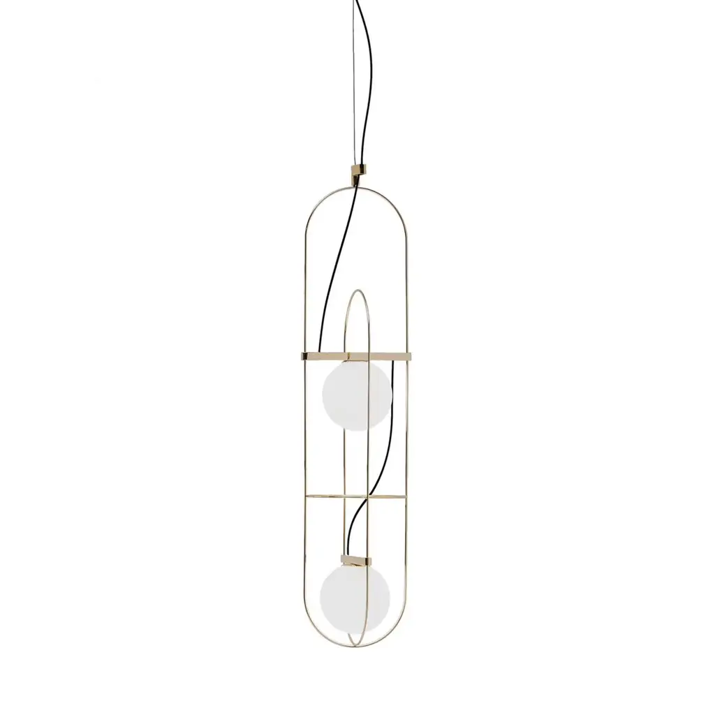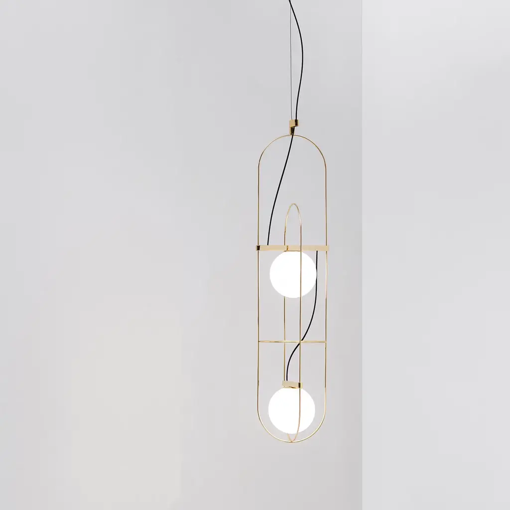 A striking sculpture that functions as an elegant pendant lamp, this piece by Sicilian architect Francesco Librizzi is an artwork of minimalism and sophistication. The gold-finished metal frame encloses two mouth-blown spheres with a white satin finish that diffuse a soft and mesmerizing light from the two 6W LED bulbs (with 2700K, CRI>80, and 1660 lumen), which is dimmable. The metallic frame and the glass diffusers come also with a black finish. This item is only wired for 220V and it is sold with an adapter. Contract and commercial certifications available upon request.