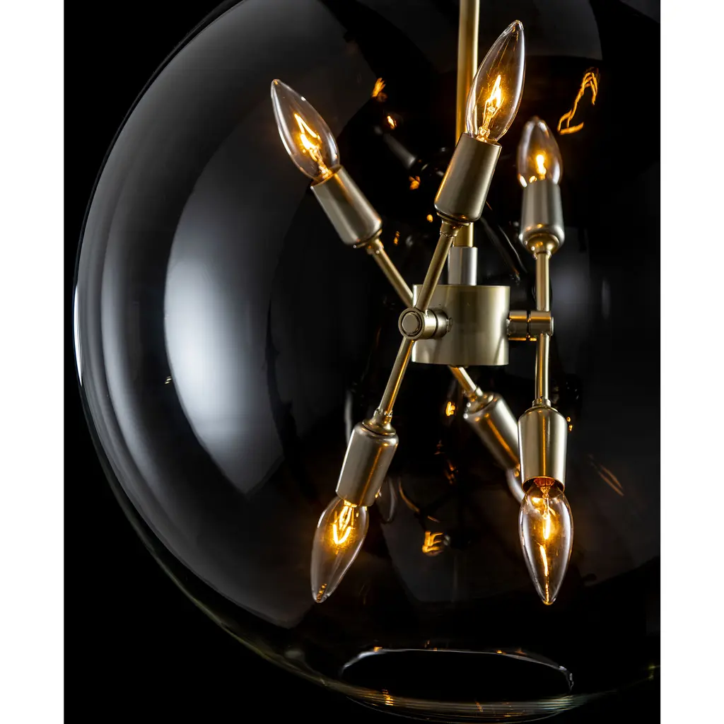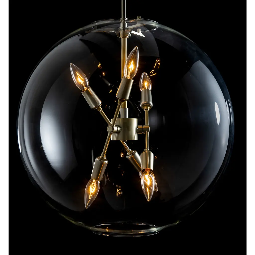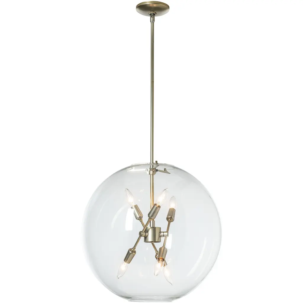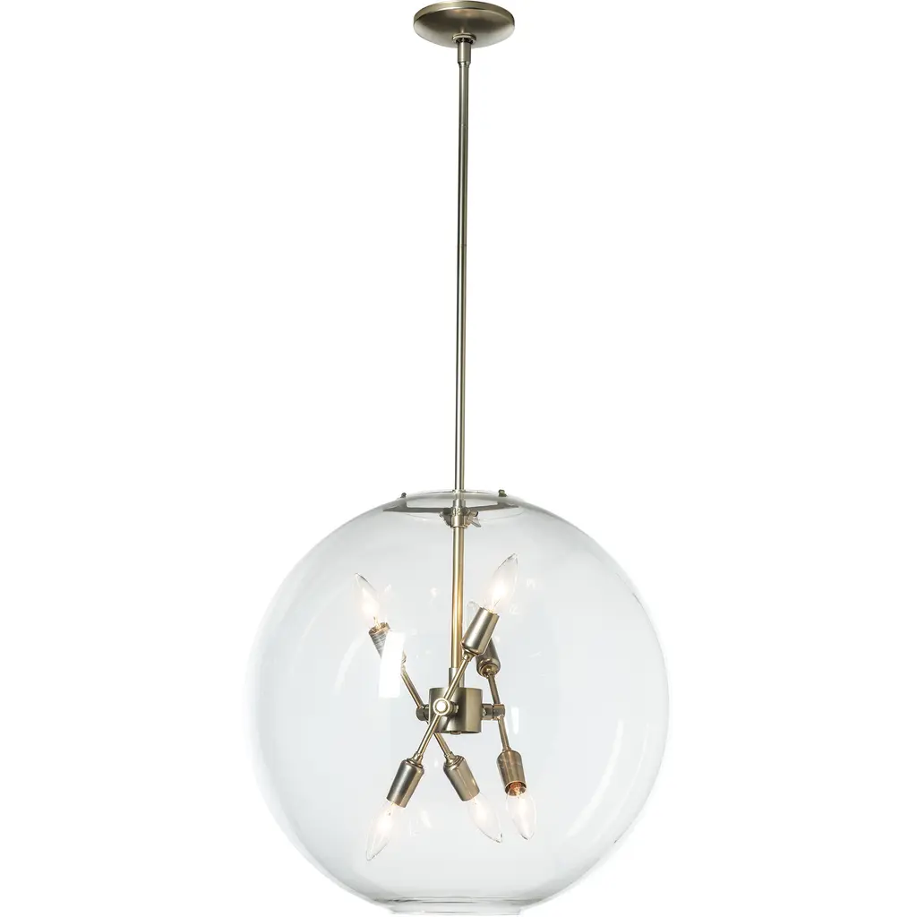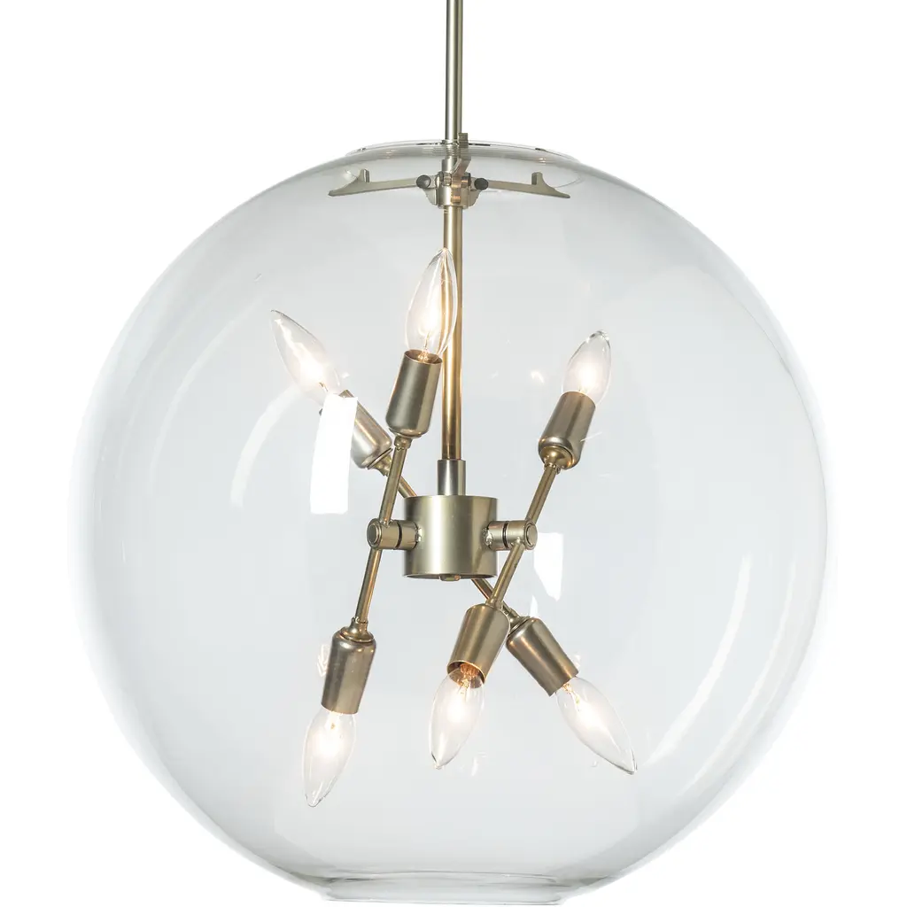 Reminiscent of fireflies caught in a jar, a core of six candelabra lights fills an impressively scaled clear glass globe defining the Sfera 6-Light Pendant. Available in all standard finishes, this arresting ceiling fixture is suspended by a multi-stem rod system that extends to a discretely small, circular canopy.