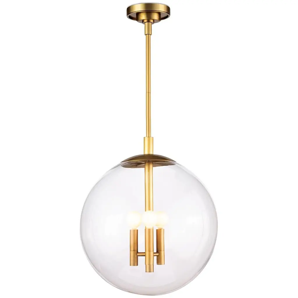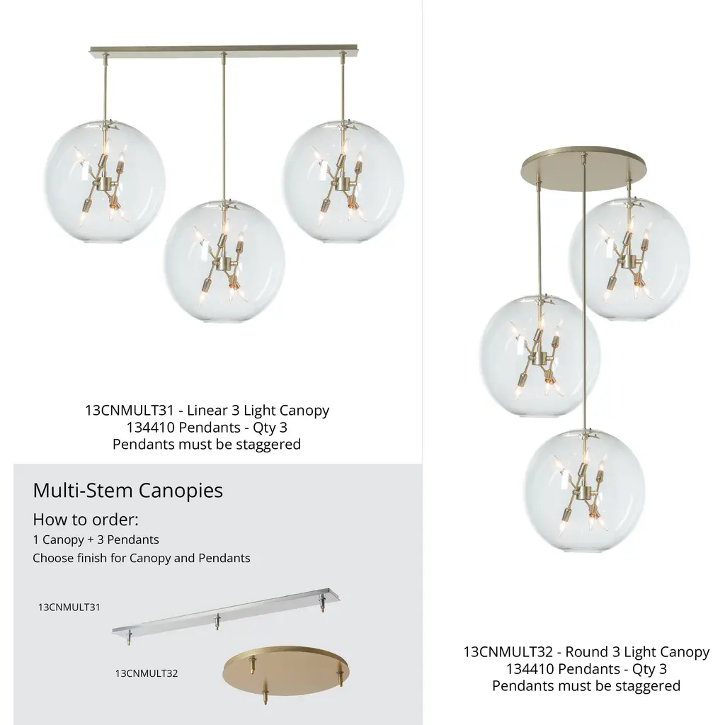 Reminiscent of fireflies caught in a jar, a core of six candelabra lights fills an impressively scaled clear glass globe defining the Sfera 6-Light Pendant. Available in all standard finishes, this arresting ceiling fixture is suspended by a multi-stem rod system that extends to a discretely small, circular canopy.